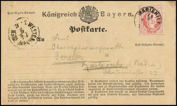 5 Kr. rosa, Prachtstück in seltener Verwendung auf bayerischem (!) Postkartenformular mit K1 "Mariahilf" 1873 nach Karlsruhe