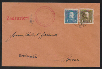 KuK-Feldpost, 1 u. 2 H. auf Zensur-Drucksache von der FP-Station "239" 1916 nach Bozen