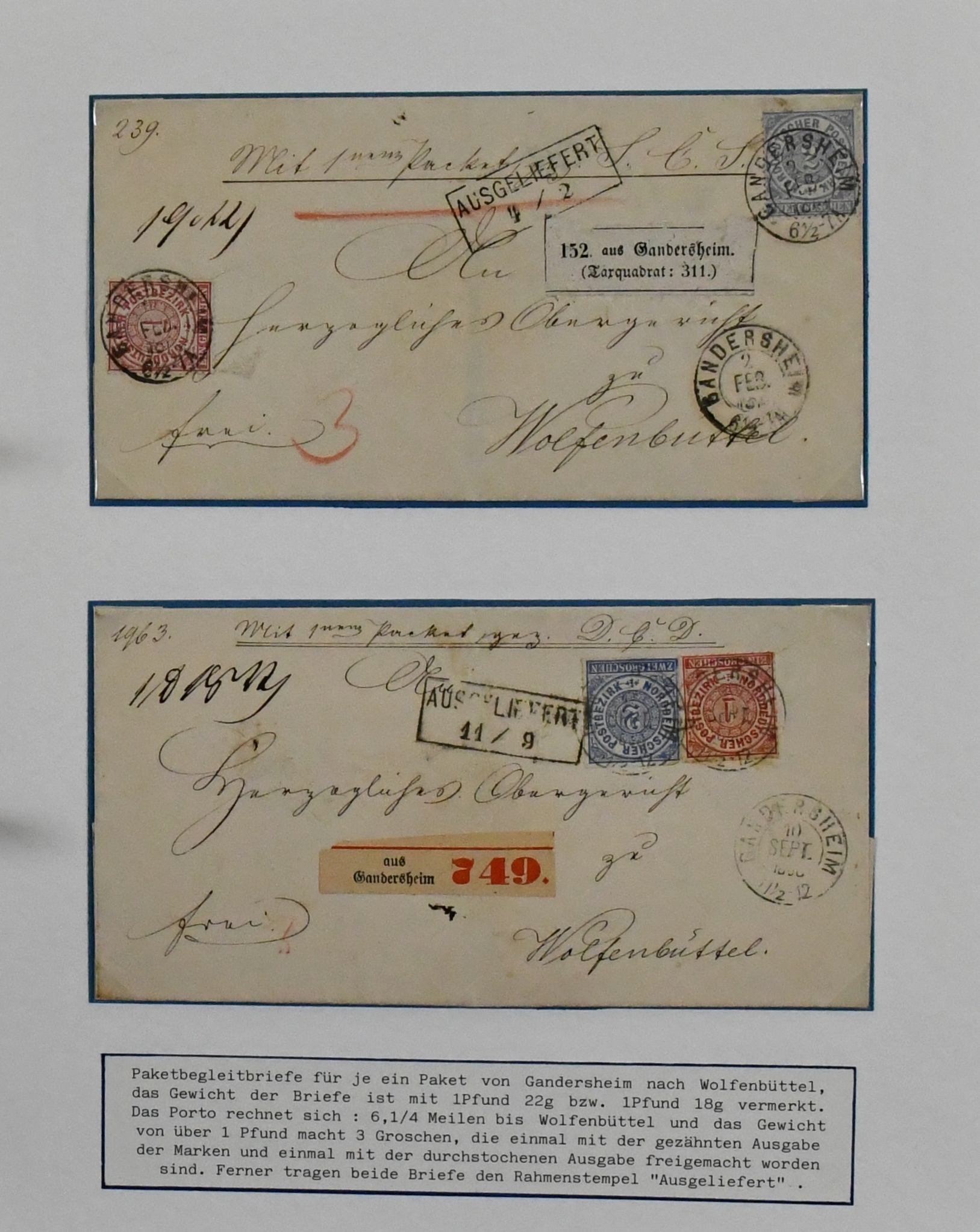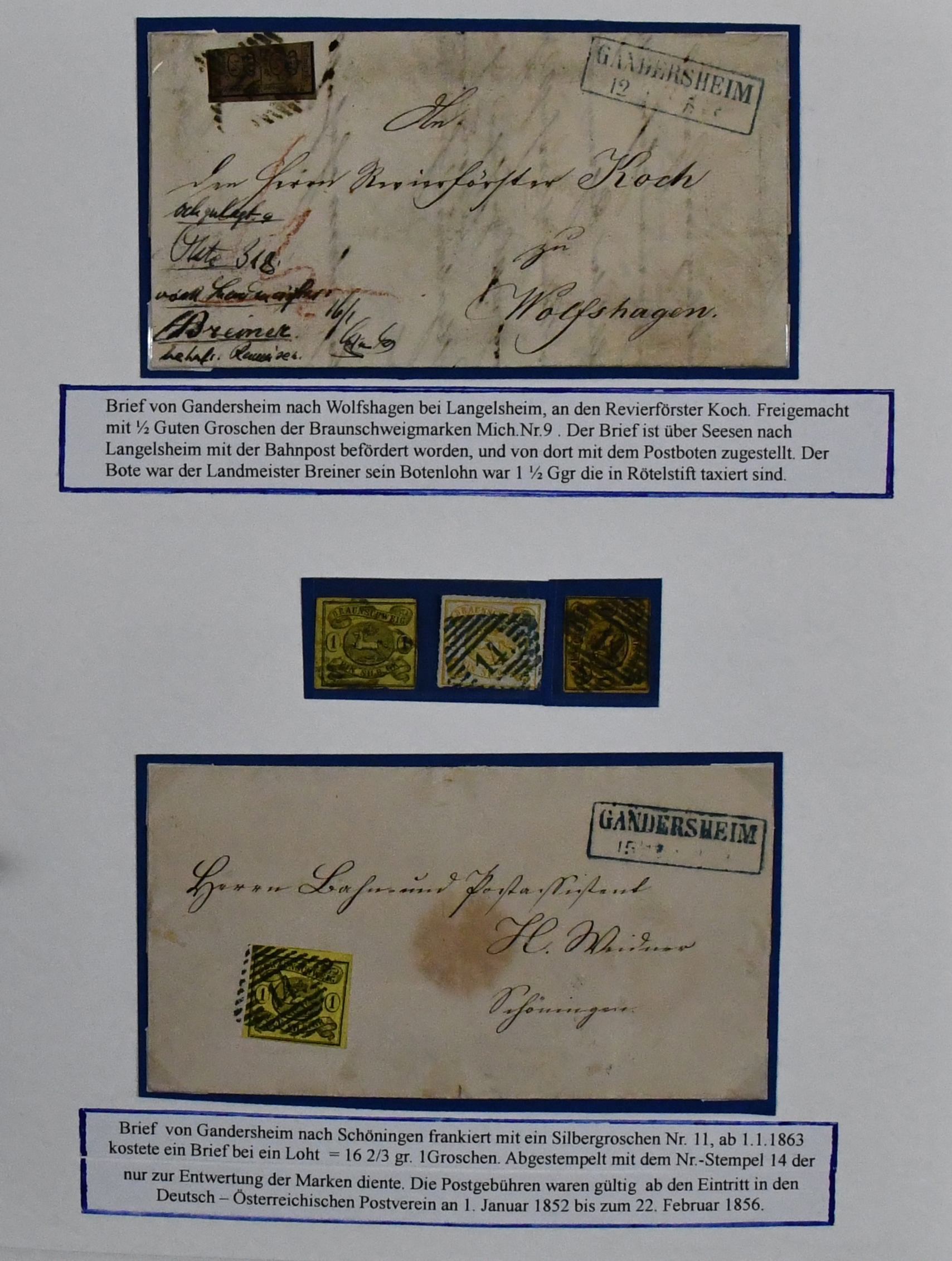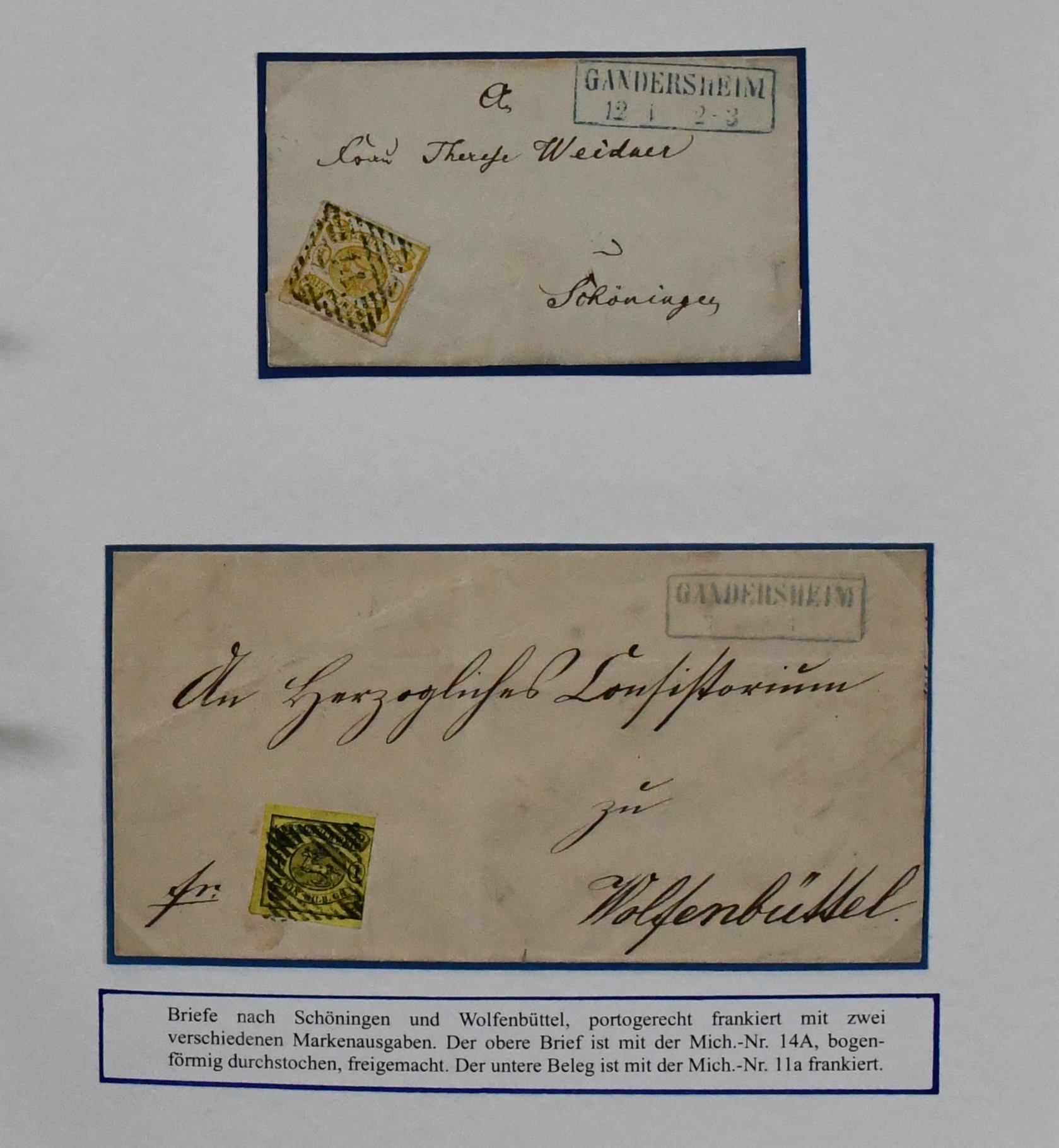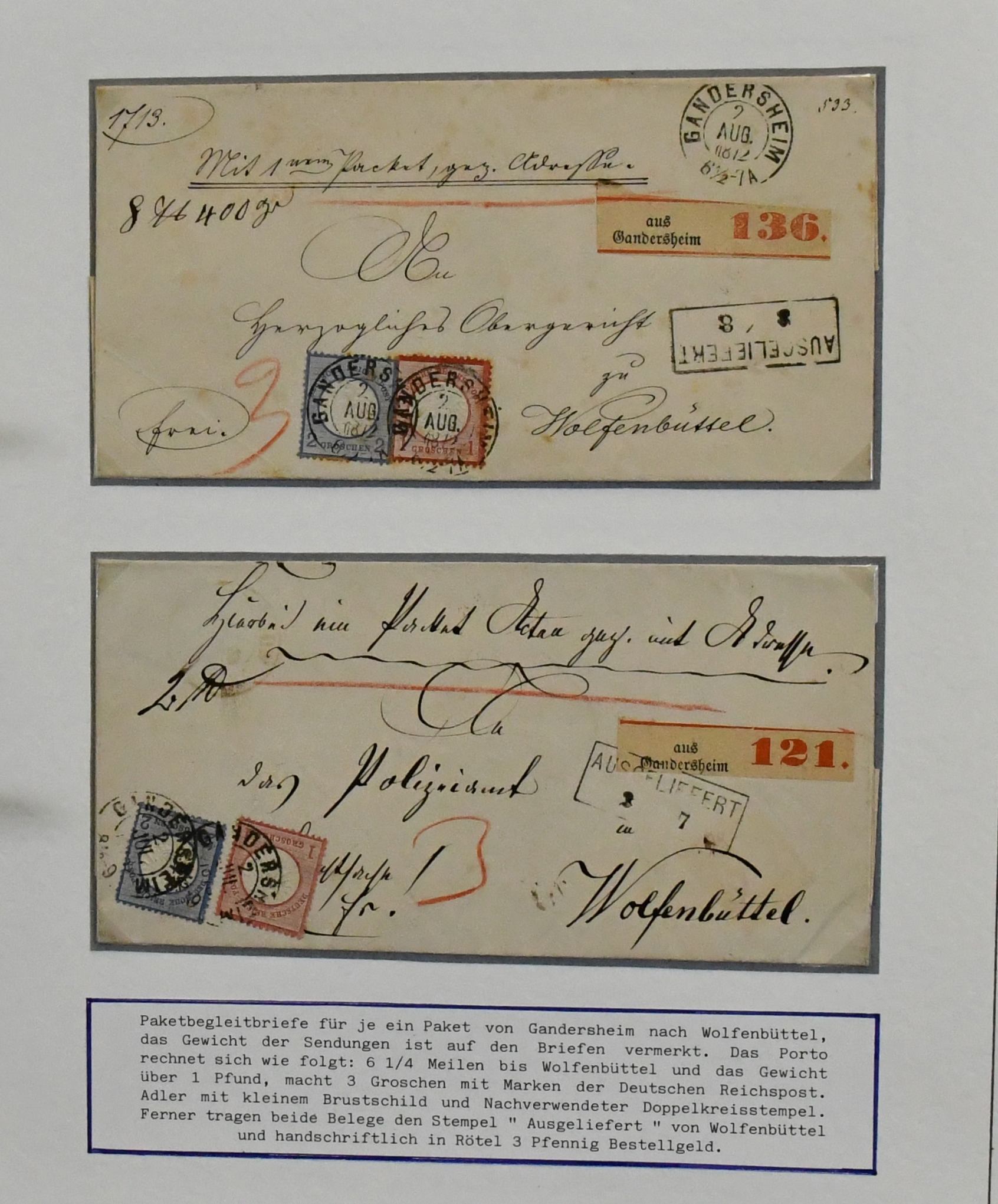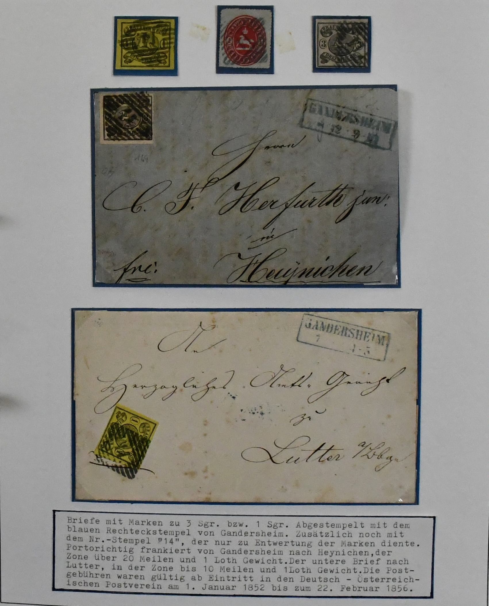 "Bad Gandersheim", zweibändiger Teil einer Ausstellungssammlung mit rund 140 Belegen ab 1692, dabei die verschiedenen Stempel zur Braunschweiger Zeit, auch der Hammerstempel, Paketbegleitungen, Frankaturen mit Nr. 6(2), 8, 9, 11(3), 14A (Kabinettbrief, Fotoexp. Lange), 19(2), ferner Nachverw. auf NDP und Brustschilden, auch mit Paketbegl., EF Brustschilde Nr. 2/3, später z.B. Dienst Nr. 69 im seltenen HAN-20er-Block, Bizone Nr. 72 als portoger. EF, Bogenecken-Frankatur Nr. 101/2, Bund Posthorn-Zus.-Dr. W1 mit PF I u.v.m.