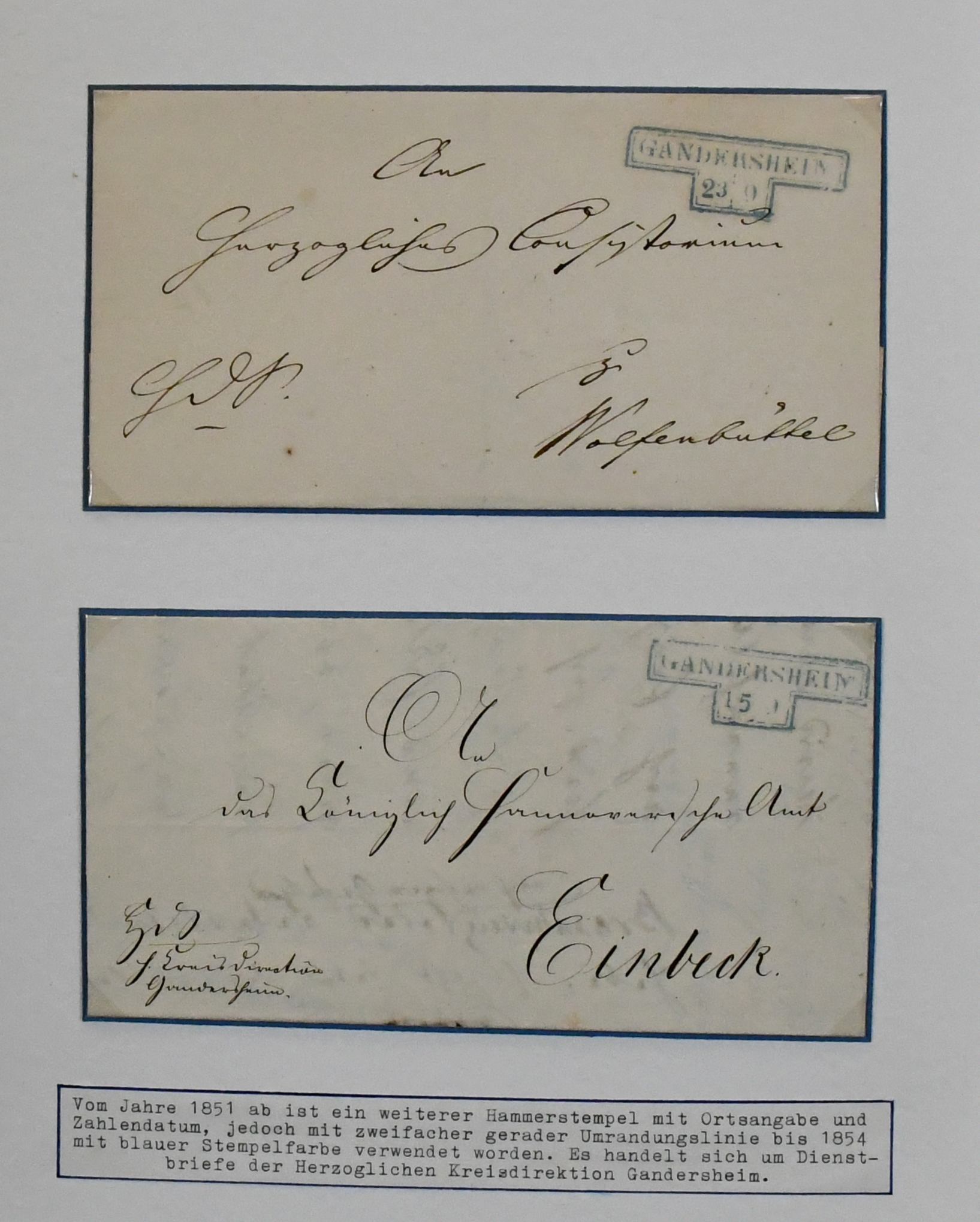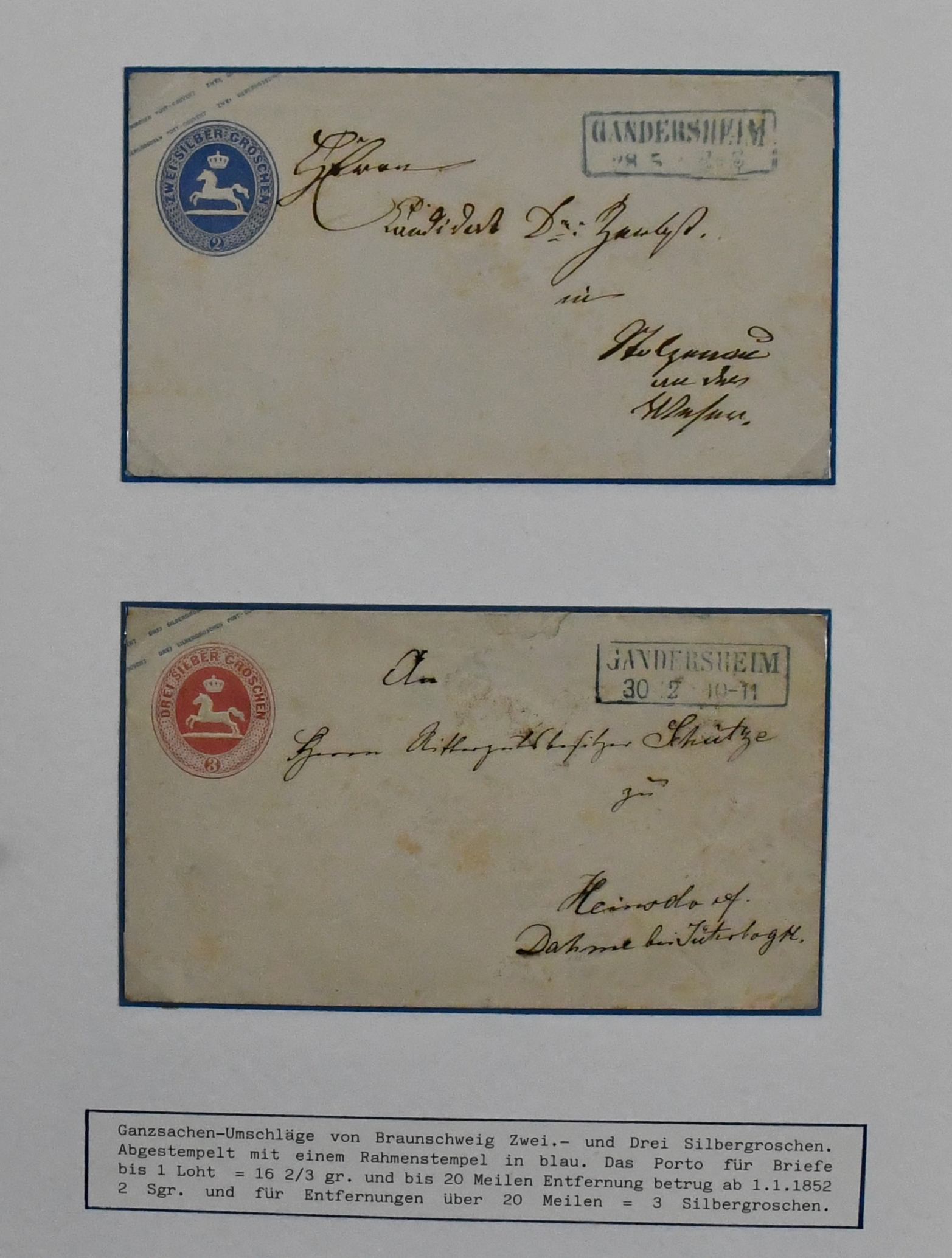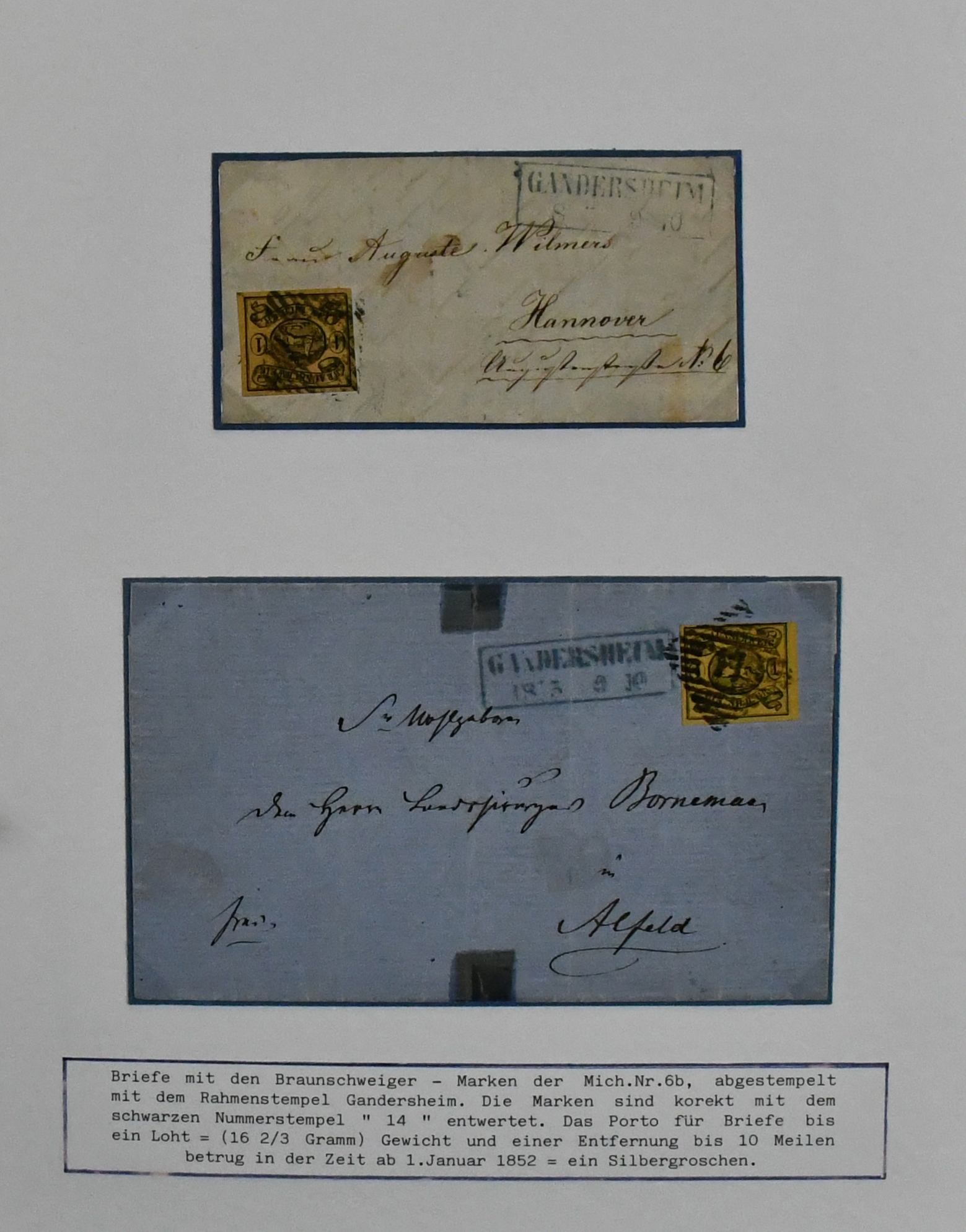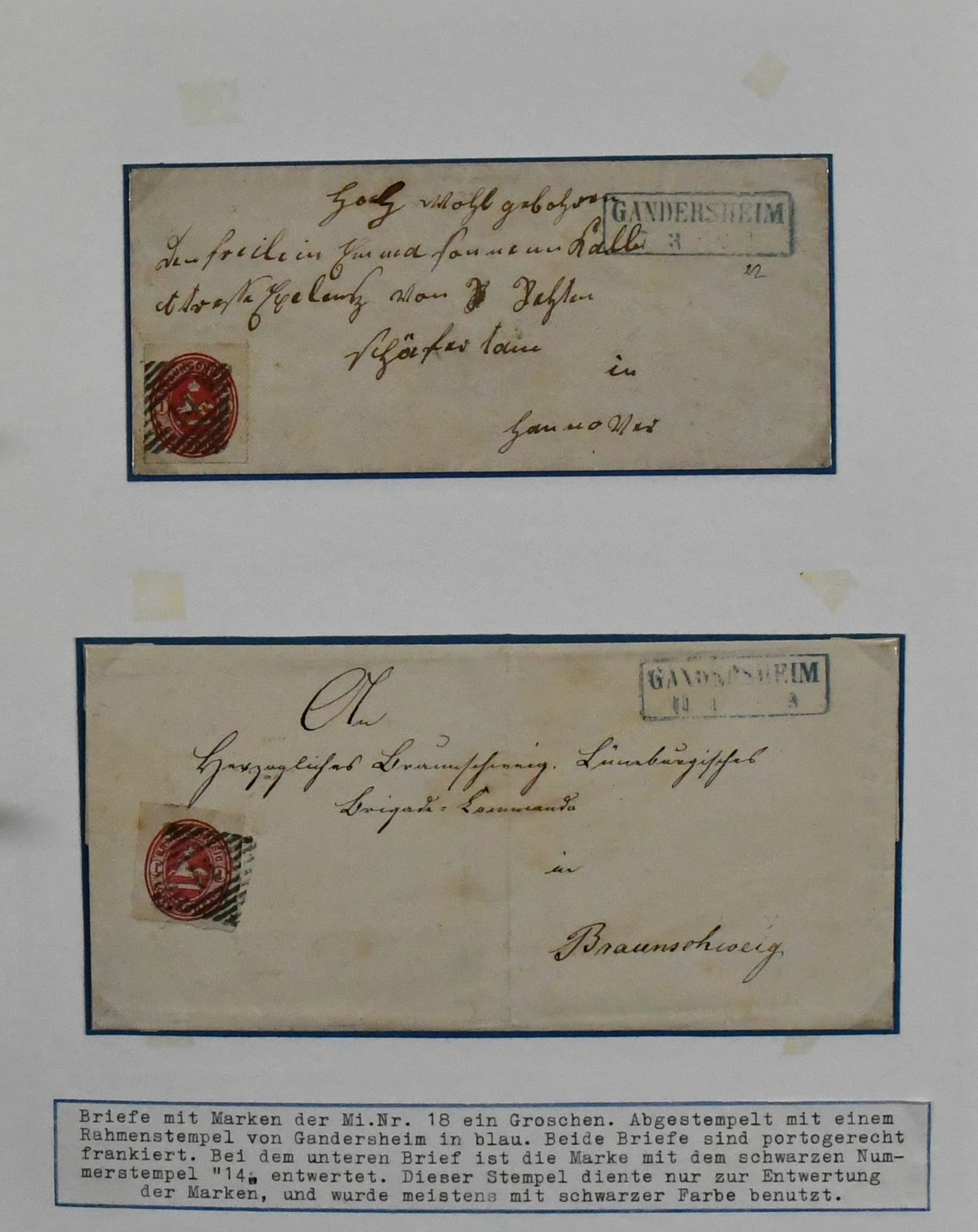 "Bad Gandersheim", zweibändiger Teil einer Ausstellungssammlung mit rund 140 Belegen ab 1692, dabei die verschiedenen Stempel zur Braunschweiger Zeit, auch der Hammerstempel, Paketbegleitungen, Frankaturen mit Nr. 6(2), 8, 9, 11(3), 14A (Kabinettbrief, Fotoexp. Lange), 19(2), ferner Nachverw. auf NDP und Brustschilden, auch mit Paketbegl., EF Brustschilde Nr. 2/3, später z.B. Dienst Nr. 69 im seltenen HAN-20er-Block, Bizone Nr. 72 als portoger. EF, Bogenecken-Frankatur Nr. 101/2, Bund Posthorn-Zus.-Dr. W1 mit PF I u.v.m.