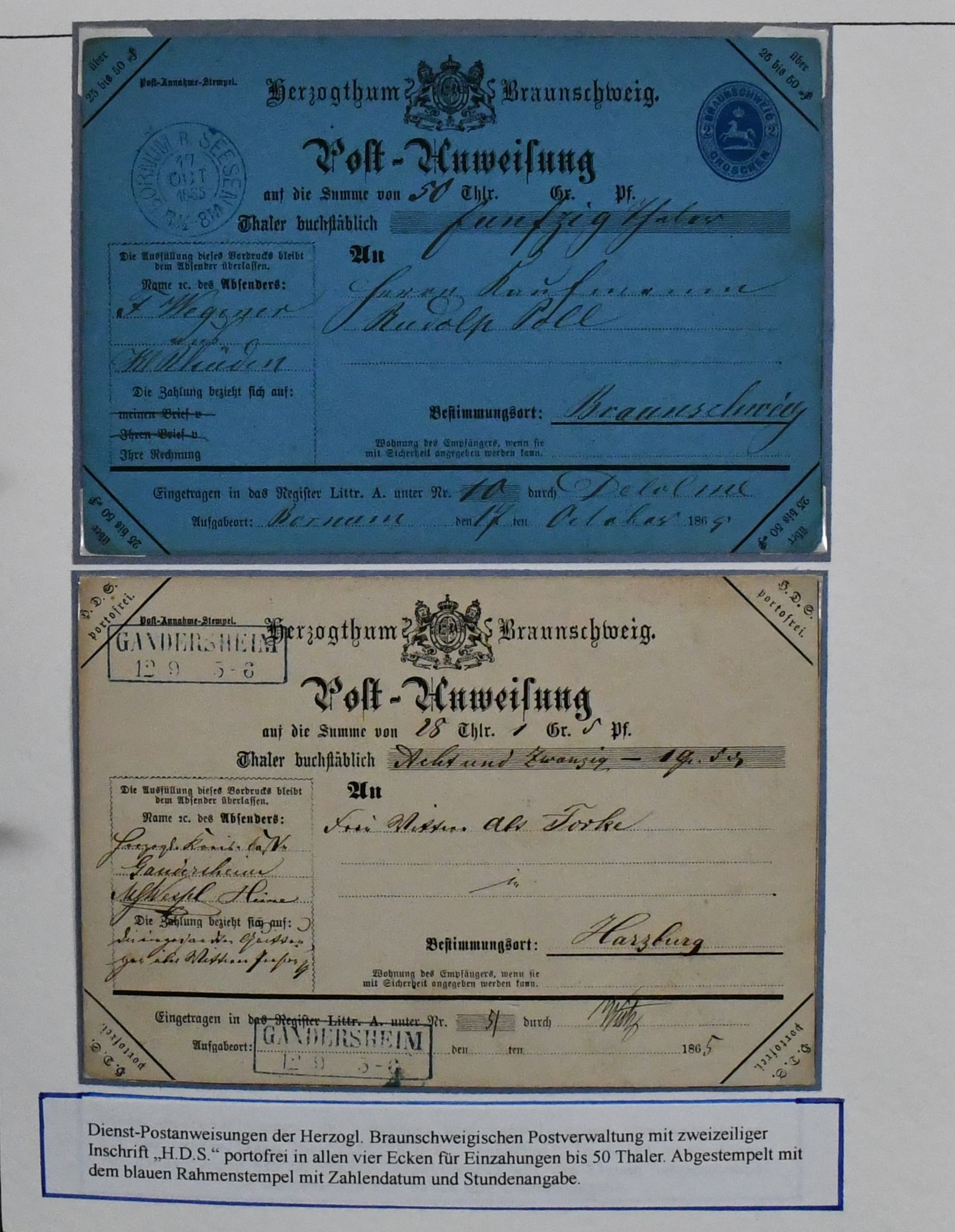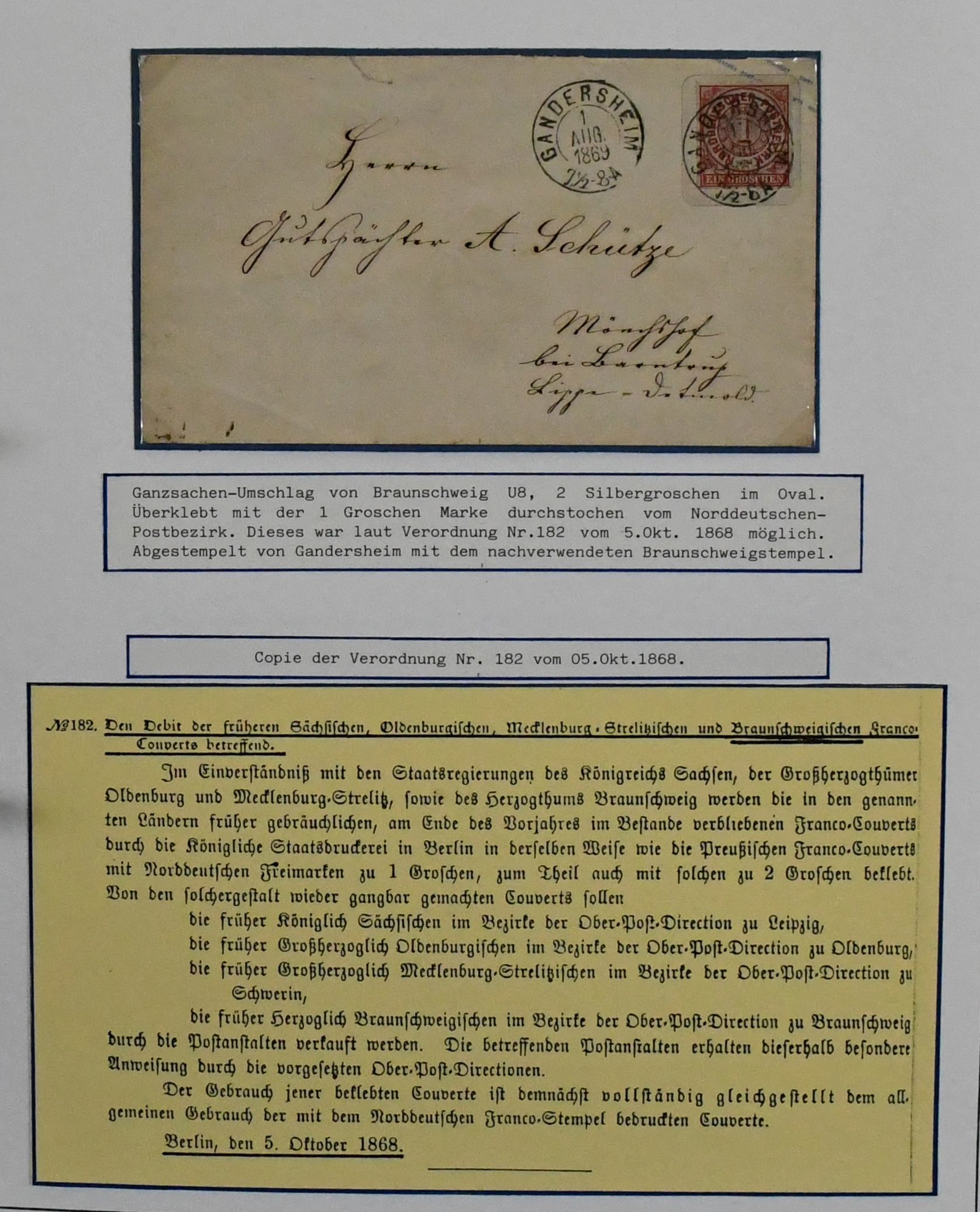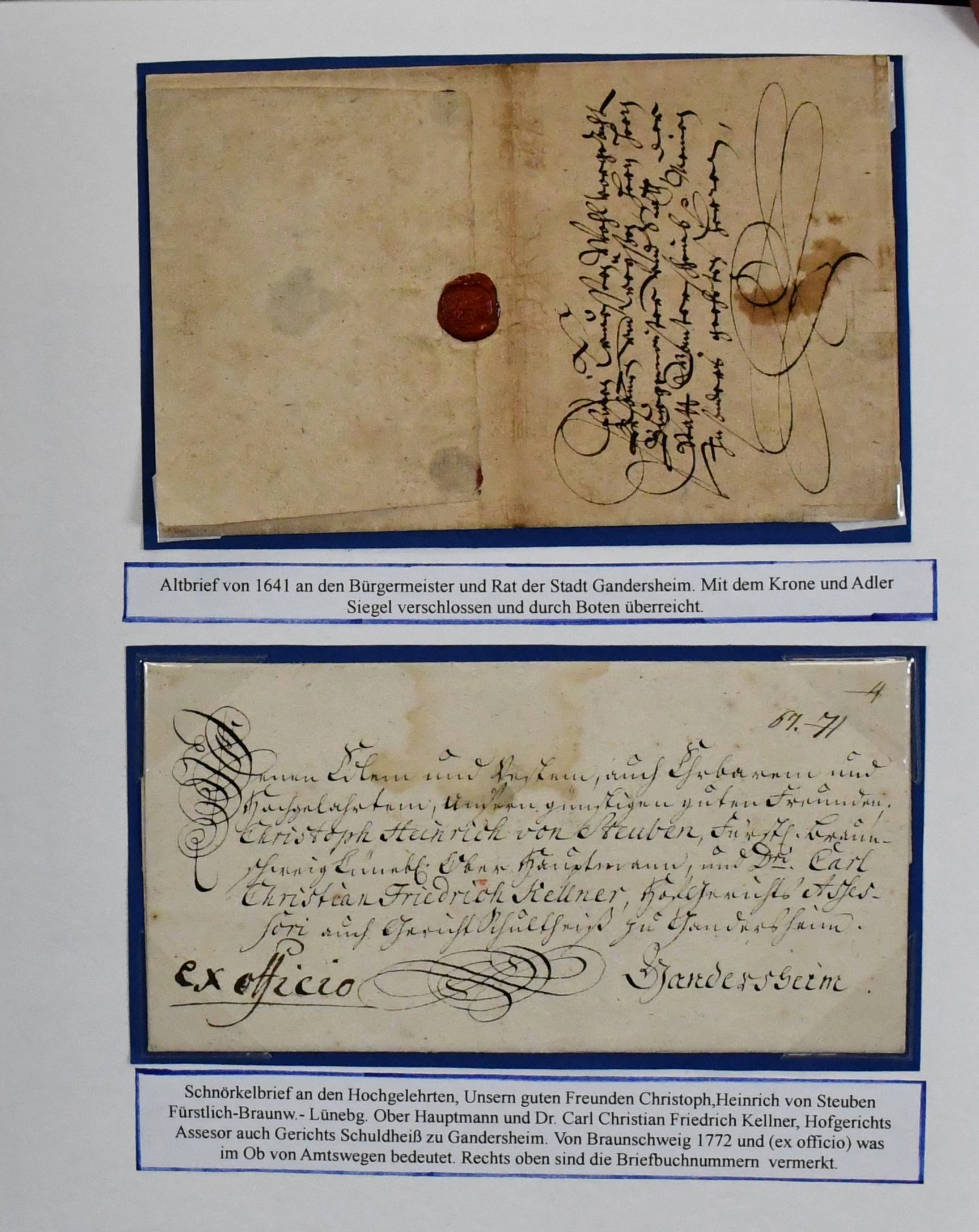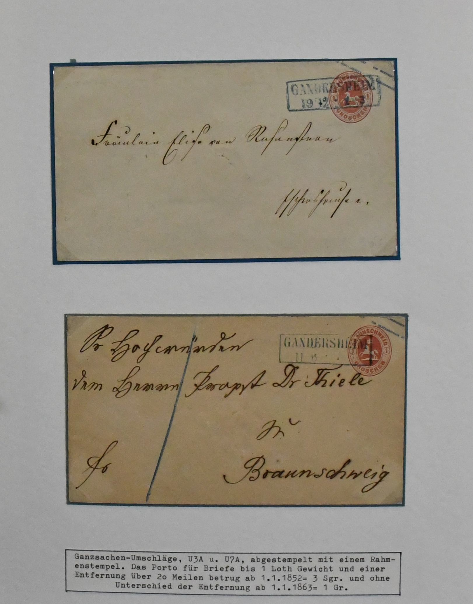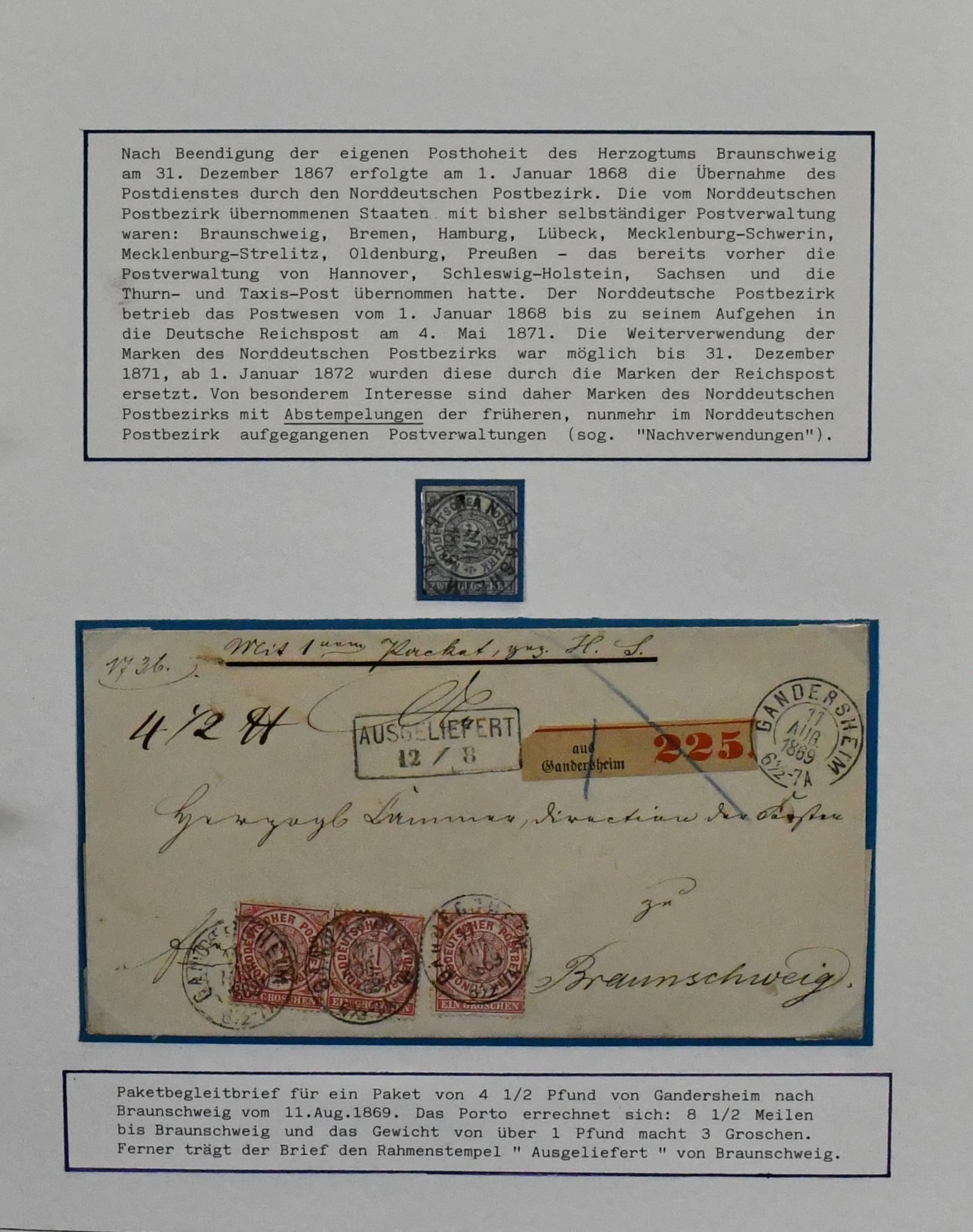 "Bad Gandersheim", zweibändiger Teil einer Ausstellungssammlung mit rund 140 Belegen ab 1692, dabei die verschiedenen Stempel zur Braunschweiger Zeit, auch der Hammerstempel, Paketbegleitungen, Frankaturen mit Nr. 6(2), 8, 9, 11(3), 14A (Kabinettbrief, Fotoexp. Lange), 19(2), ferner Nachverw. auf NDP und Brustschilden, auch mit Paketbegl., EF Brustschilde Nr. 2/3, später z.B. Dienst Nr. 69 im seltenen HAN-20er-Block, Bizone Nr. 72 als portoger. EF, Bogenecken-Frankatur Nr. 101/2, Bund Posthorn-Zus.-Dr. W1 mit PF I u.v.m.