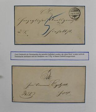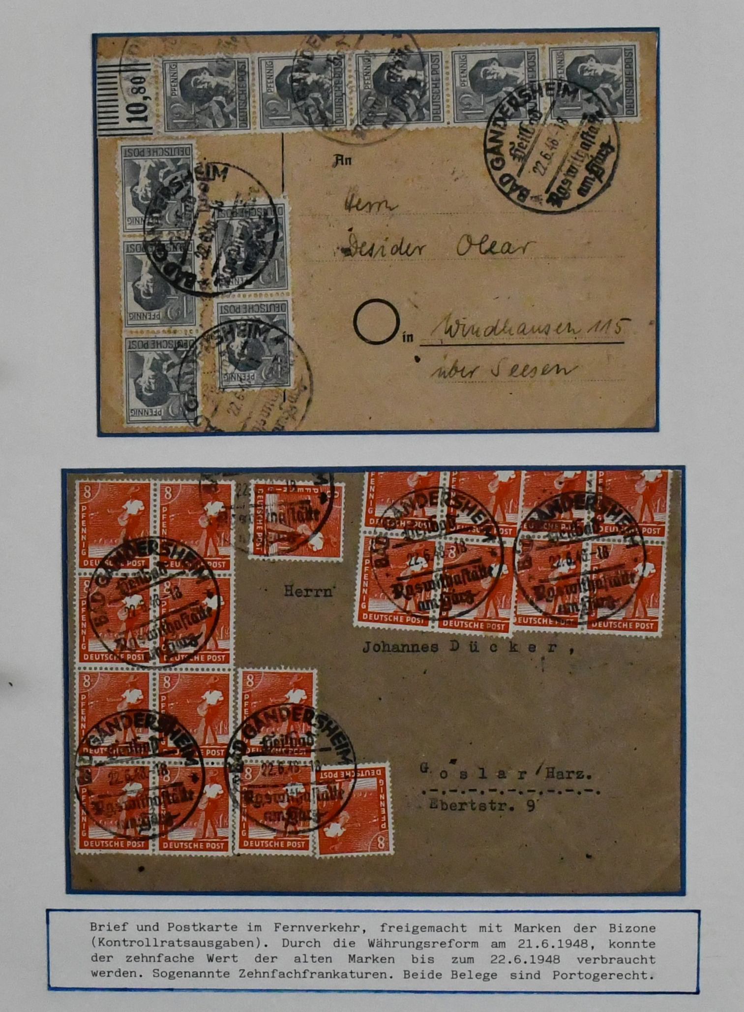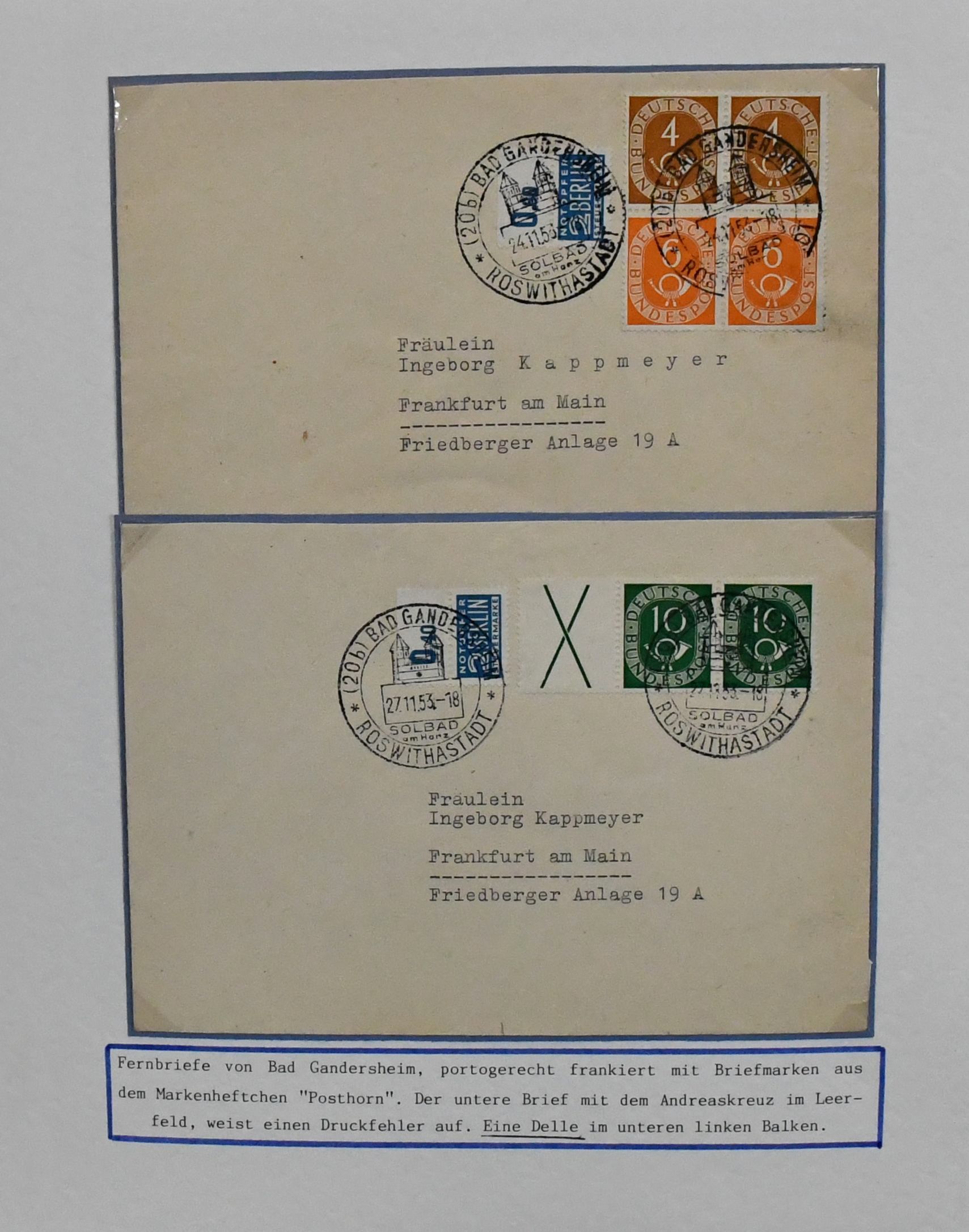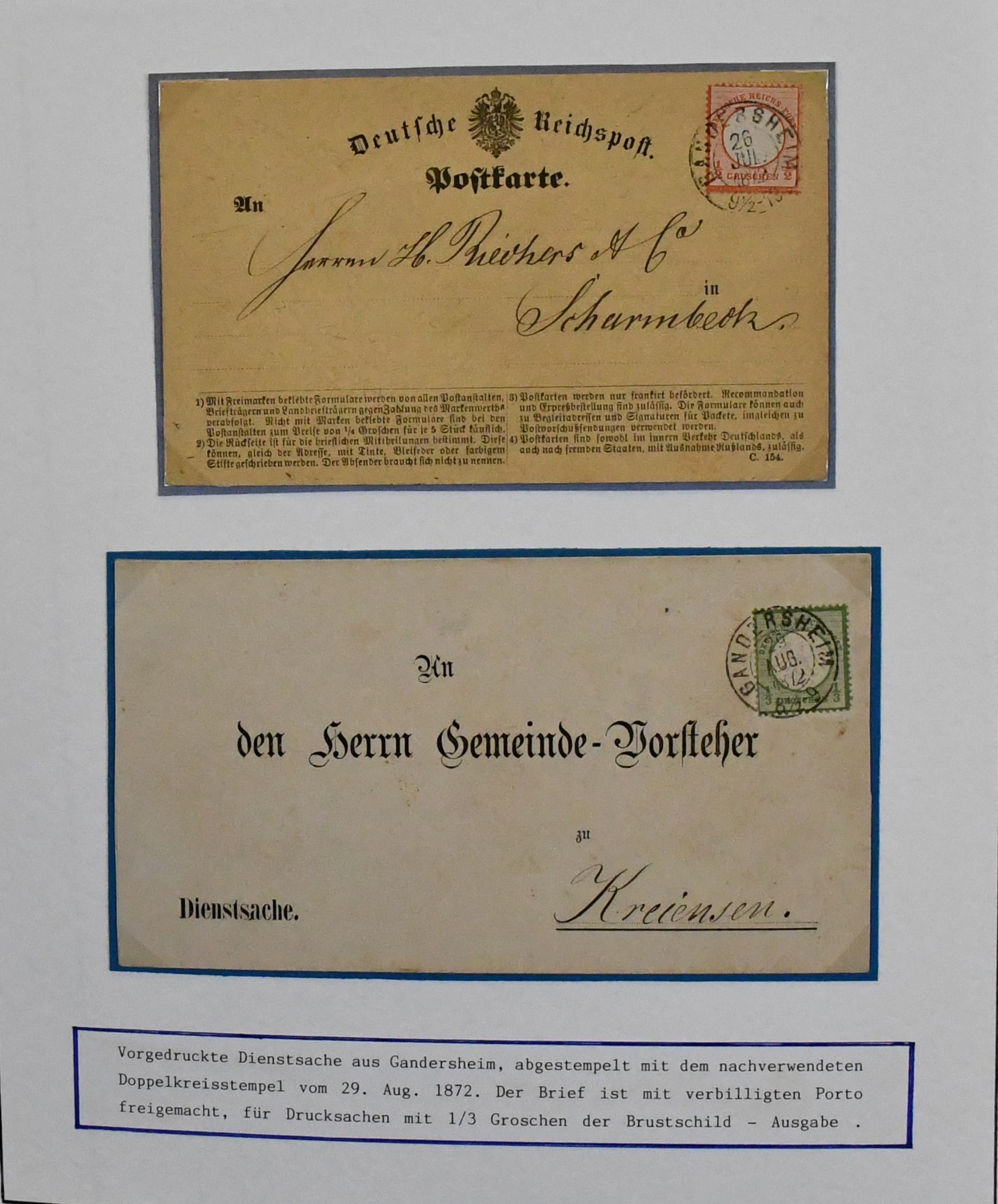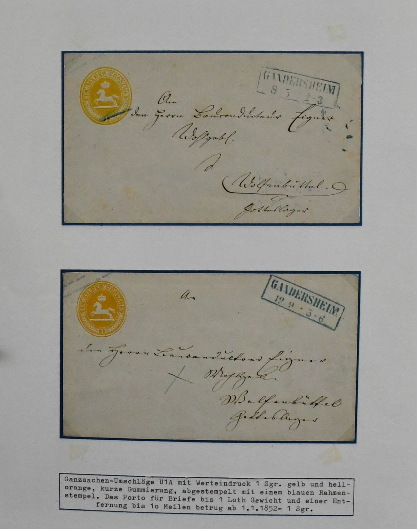 "Bad Gandersheim", zweibändiger Teil einer Ausstellungssammlung mit rund 140 Belegen ab 1692, dabei die verschiedenen Stempel zur Braunschweiger Zeit, auch der Hammerstempel, Paketbegleitungen, Frankaturen mit Nr. 6(2), 8, 9, 11(3), 14A (Kabinettbrief, Fotoexp. Lange), 19(2), ferner Nachverw. auf NDP und Brustschilden, auch mit Paketbegl., EF Brustschilde Nr. 2/3, später z.B. Dienst Nr. 69 im seltenen HAN-20er-Block, Bizone Nr. 72 als portoger. EF, Bogenecken-Frankatur Nr. 101/2, Bund Posthorn-Zus.-Dr. W1 mit PF I u.v.m.