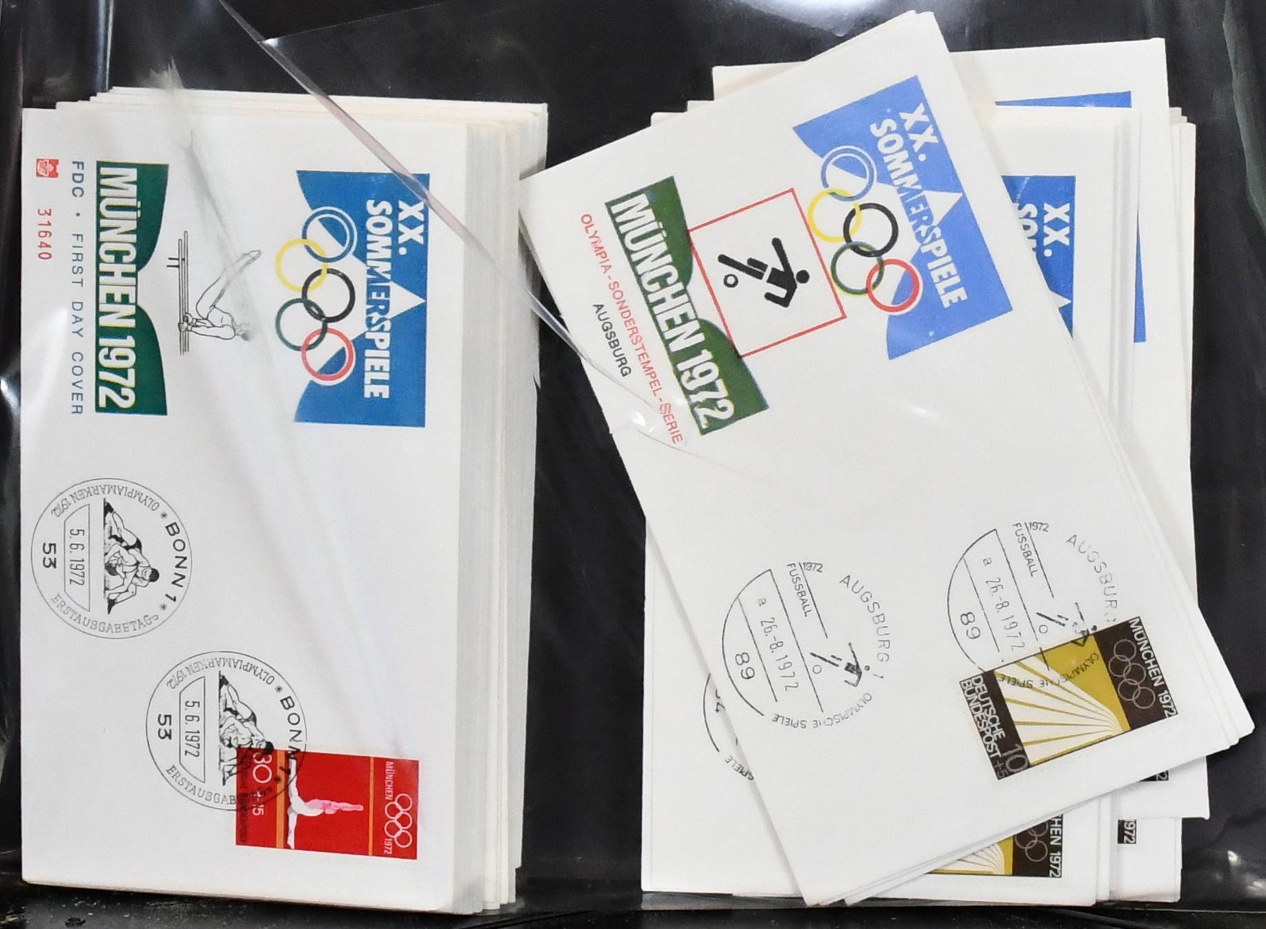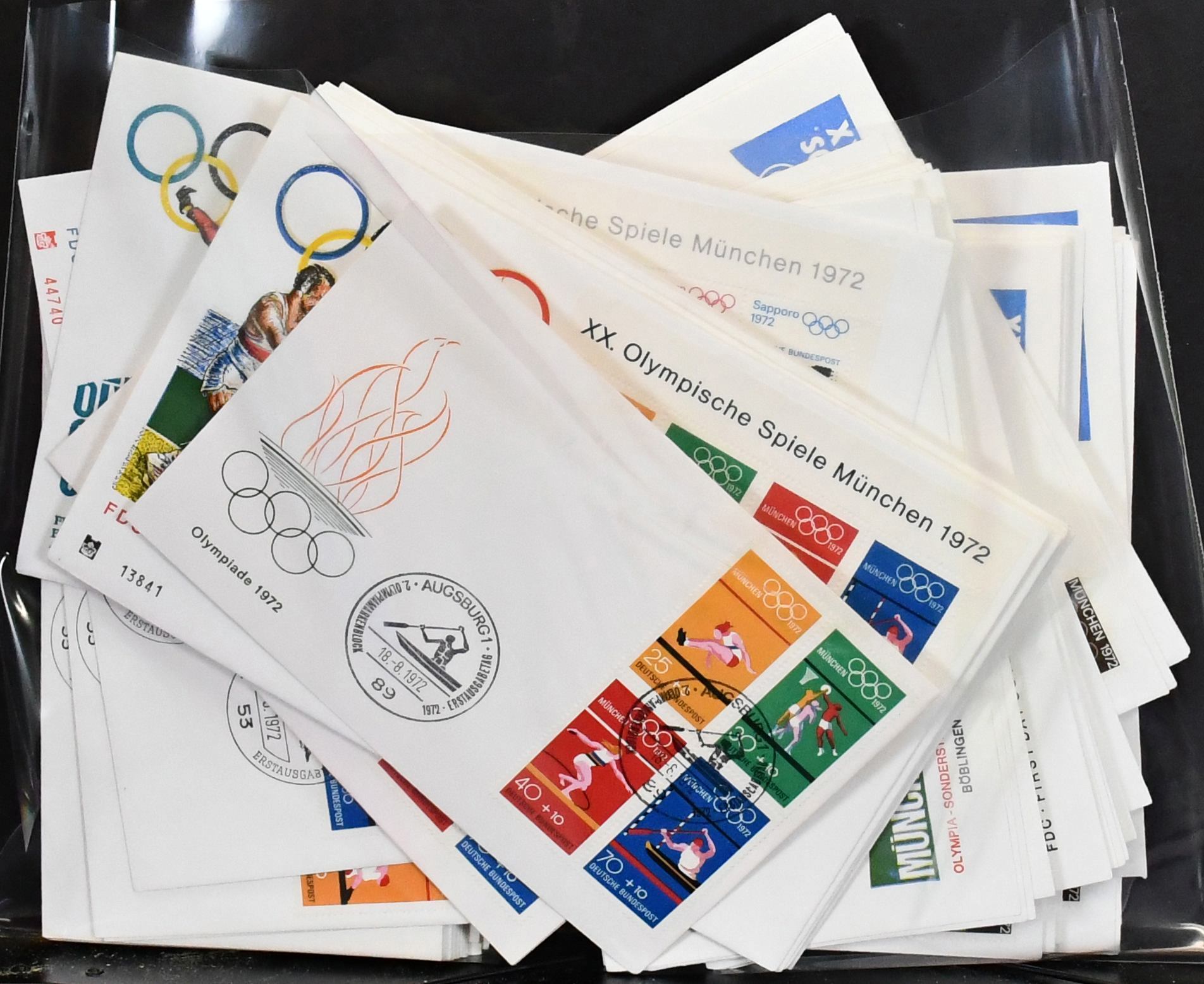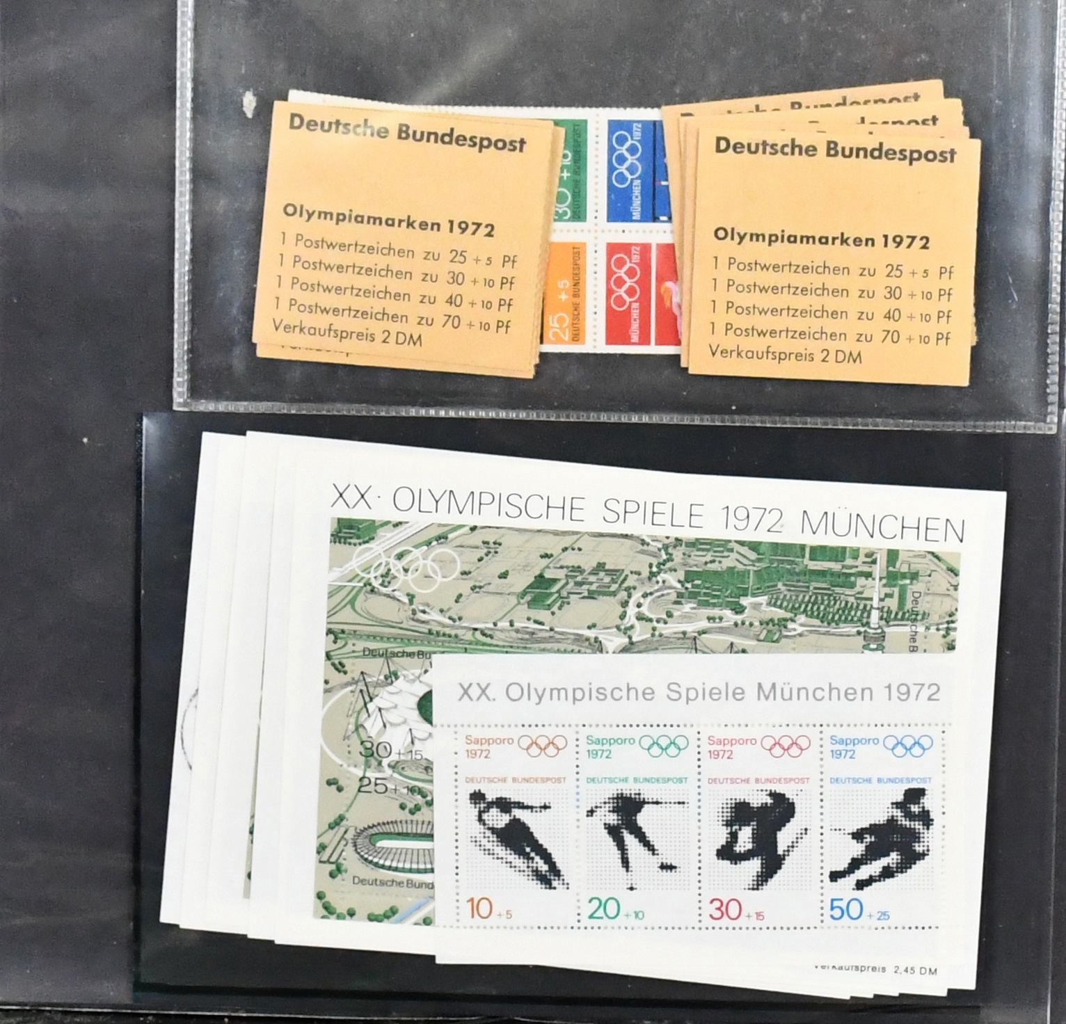 Bundesrepublik, Olympia 1972, 100 FDCs mit verschiedenen Zudrucken und SST-Kombinationen, dazu neun postfr. Markenheftchen, sowie viermal als FDC, Bl. 8 viermal als FDC und sechs postfrische Blöcke