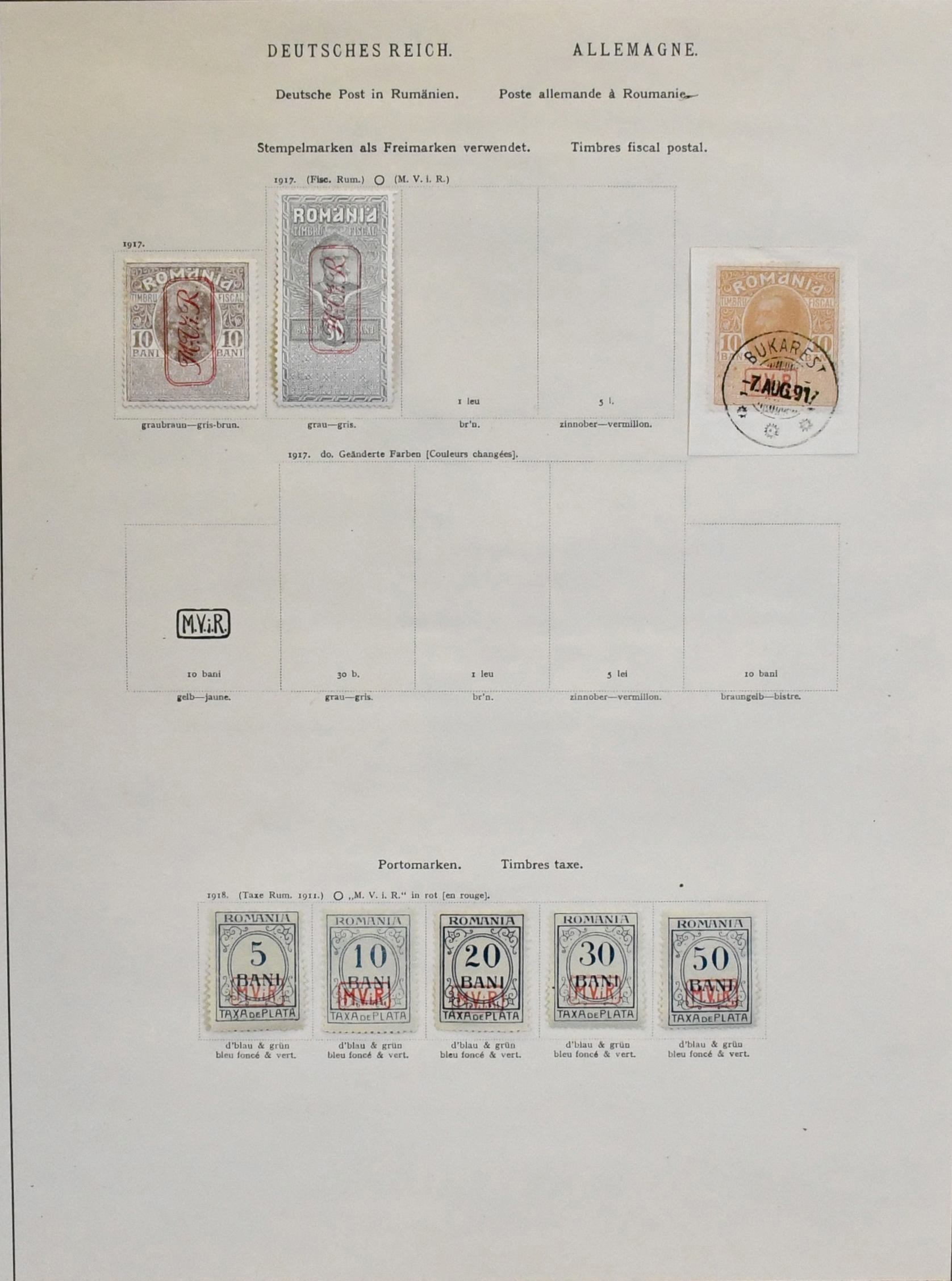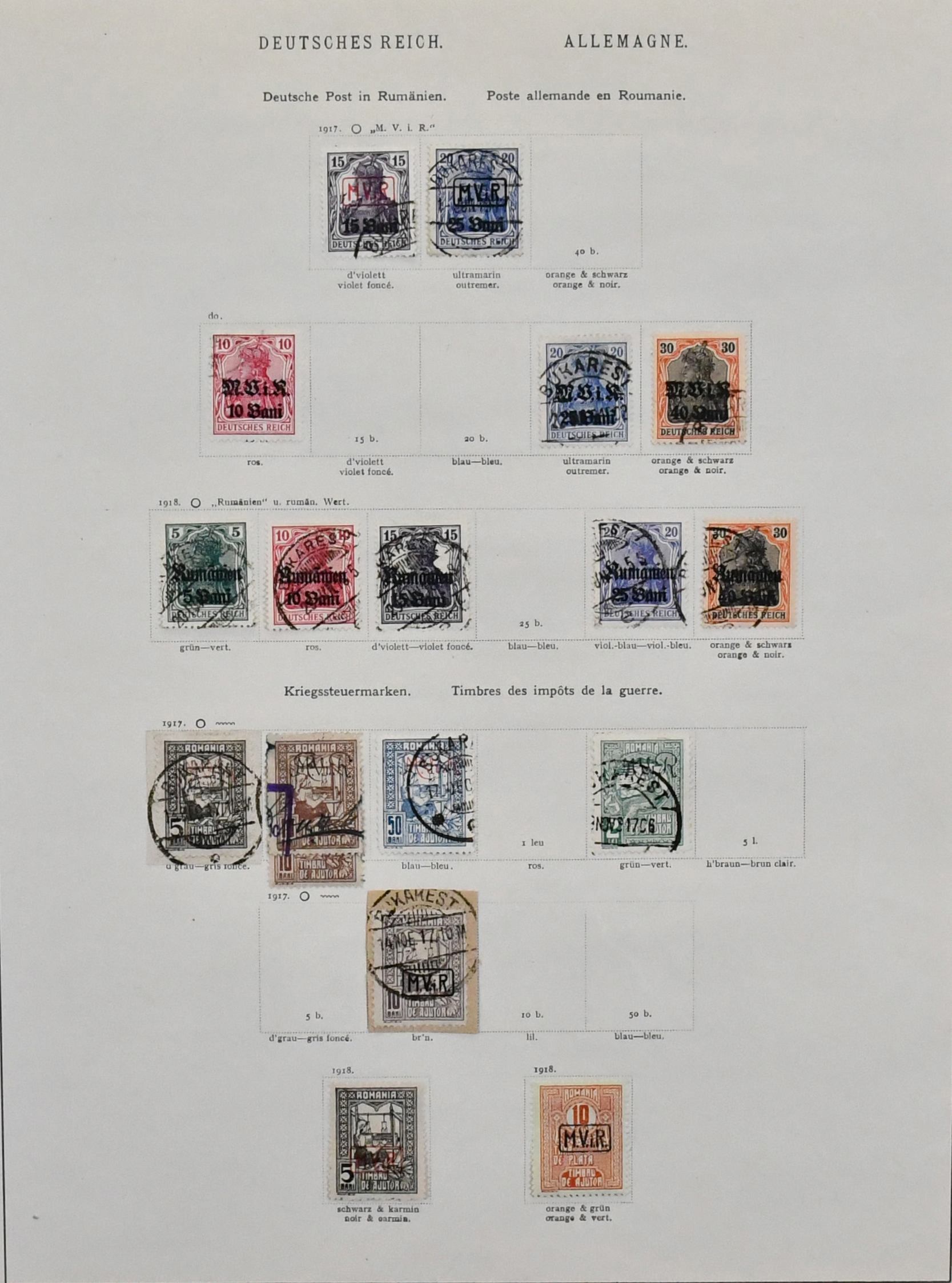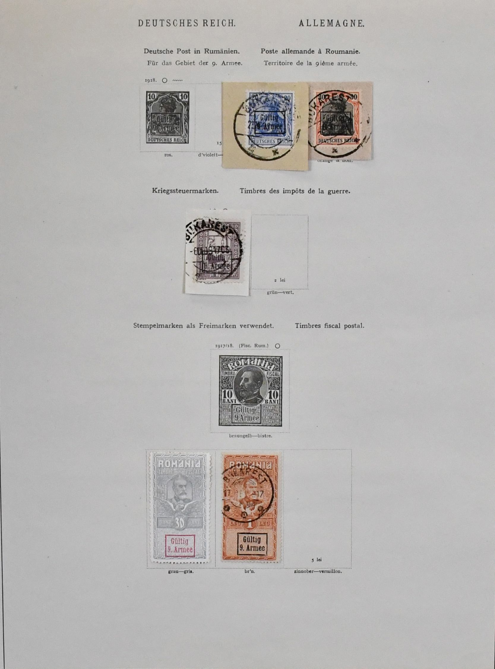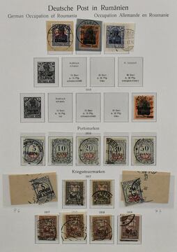 Rumänien, sauber gest. Slg. ab Nr. 1/3, auf KABE-Vordrucken. Dabei Porto Nr. 1/5 u. 8 (Mi. 120,-), Zwangszuschlag Nr. 1/7x/y (Mi. 324,-), sowie 9. Armee Nr. 1/4 (Mi. 180,-)