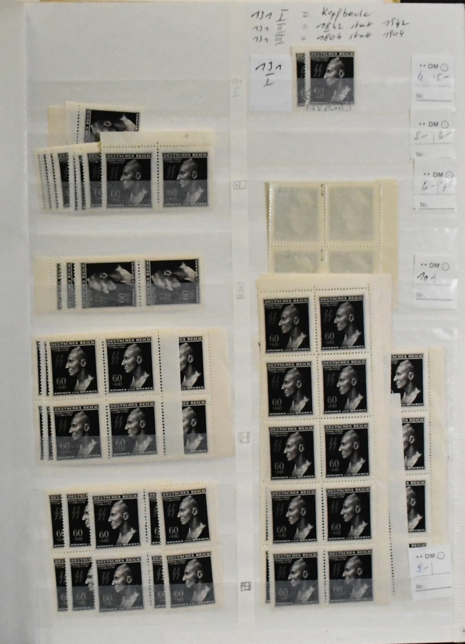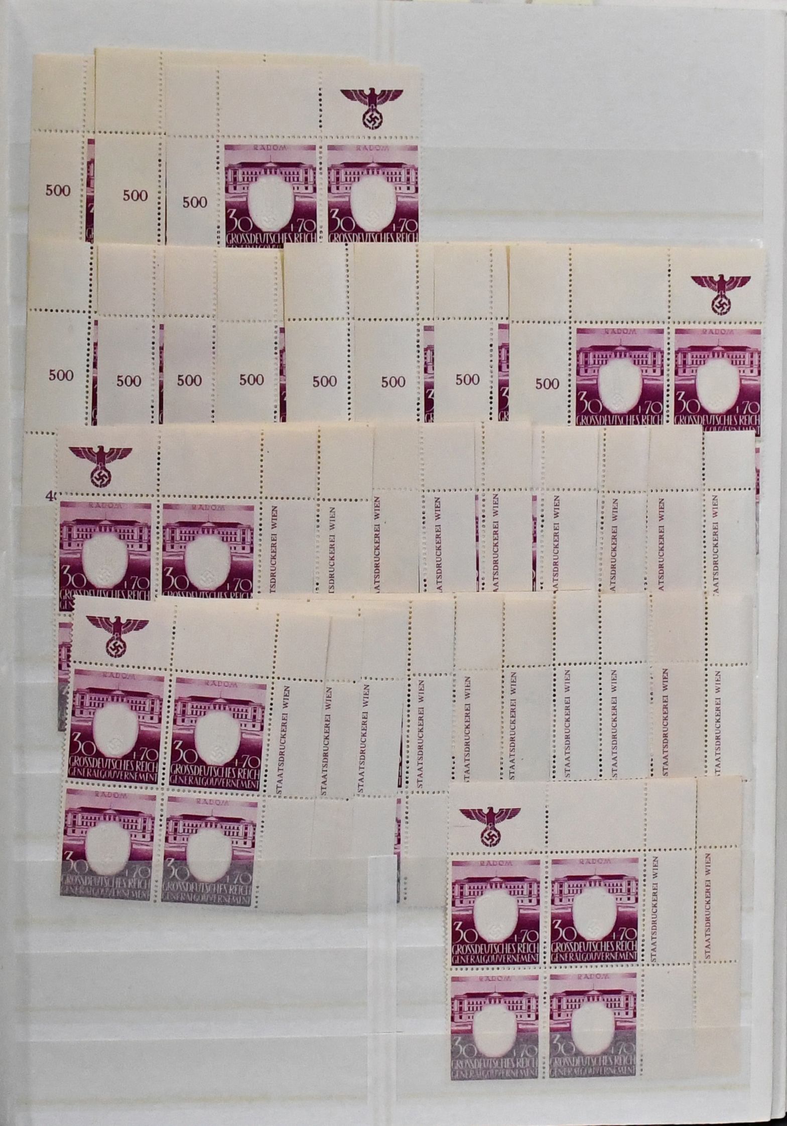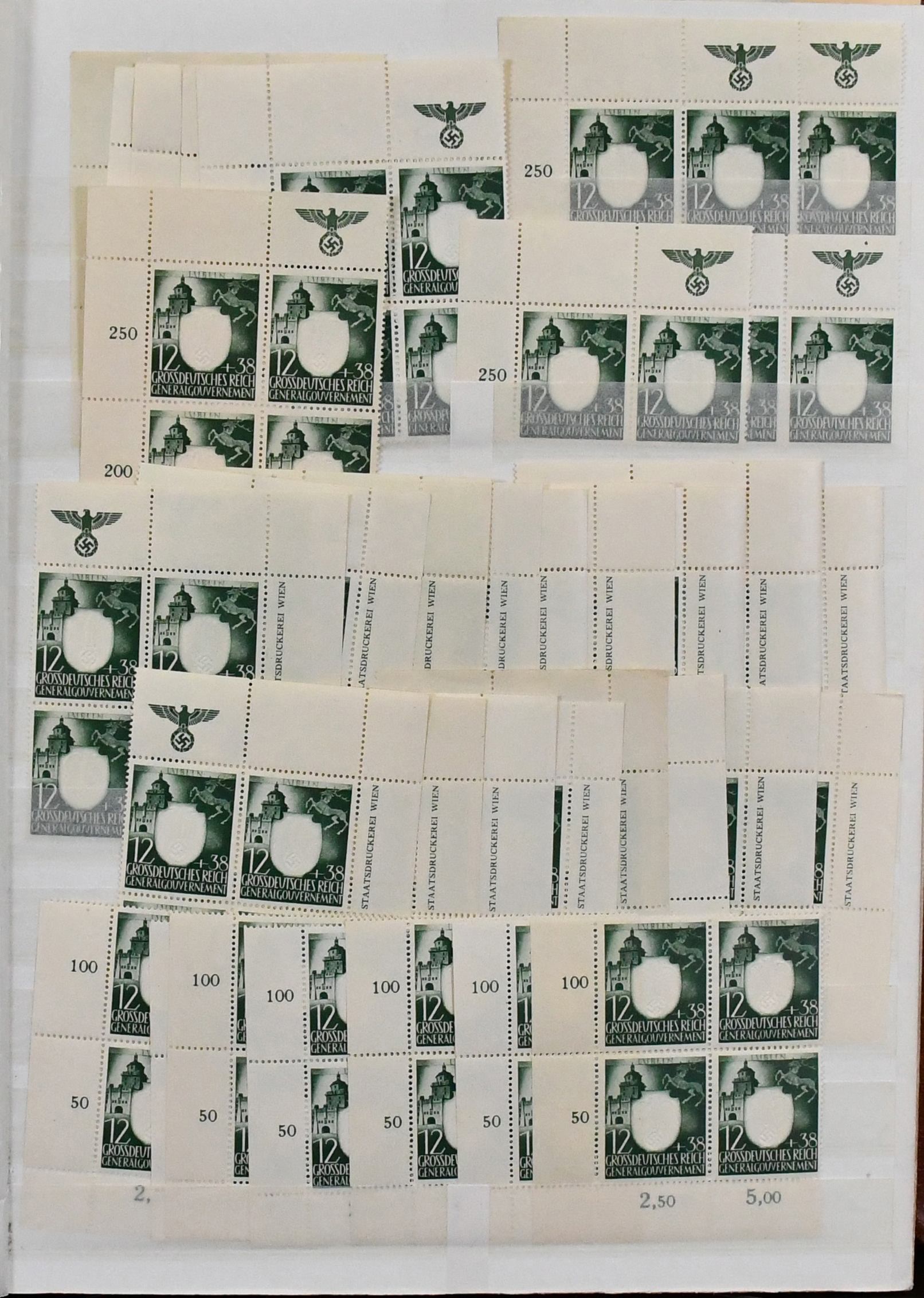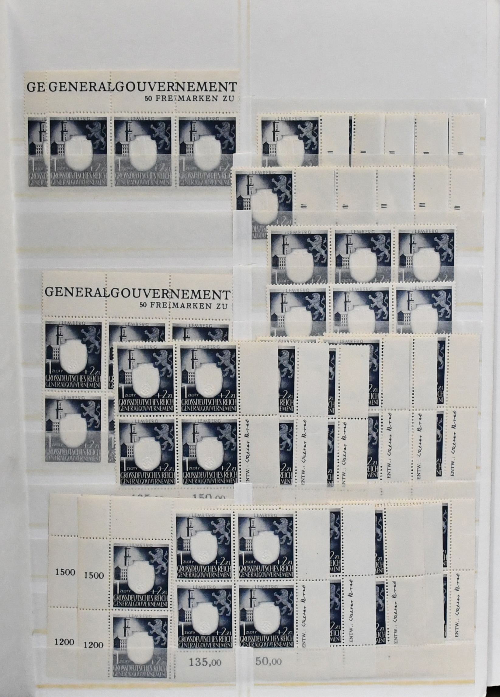 Generalgouvernement, nur der drucktechnisch anspruchsvolle Prägedruck-Satz Nr. 105-109, dickes Lagerbuch mit einer Vielzahl von Marken, u.a. postfrische Einzelmarken und Eckrand-Viererblöcke je aus der Bogenecke mit Randinschriften in Mengen, Entwerferzeichen, Druckvermerken, Reihenzählern usw. In dieser Menge ein seltenes Angebot (wir schätzen ca. 250 kpl. Serien, davon sehr viele als Eckrand-Einheiten!)