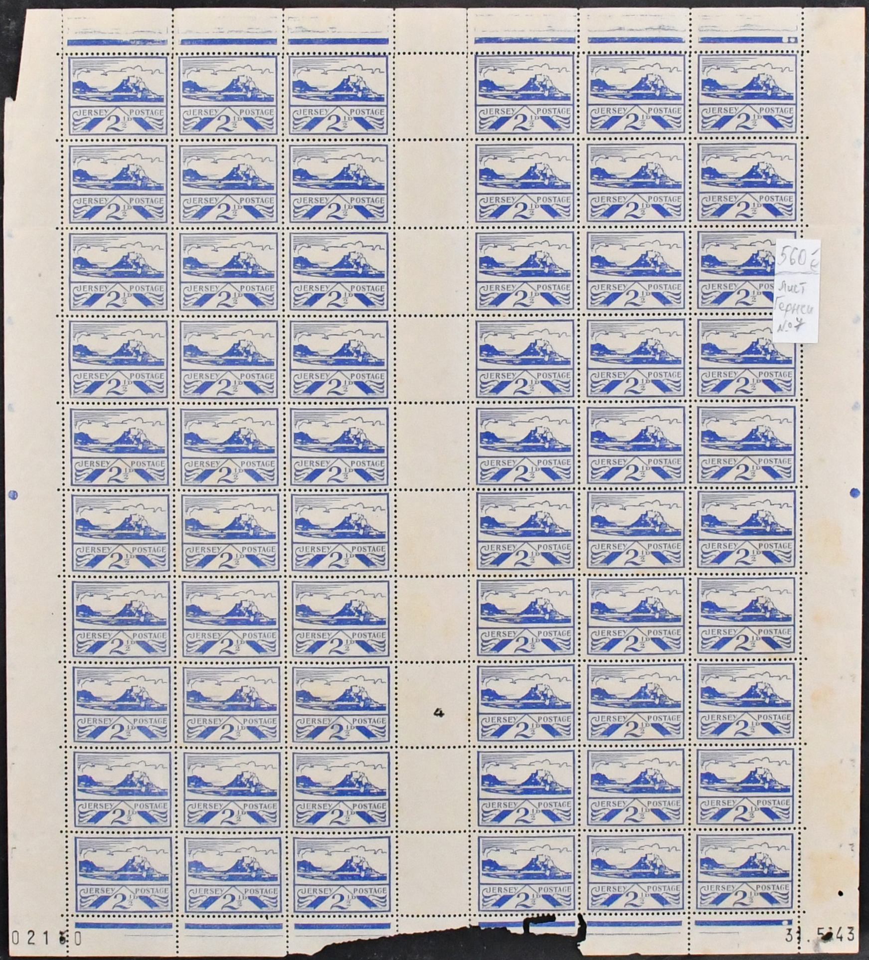 Deutsche Bes. II. Wk., Partie mit Jersey Nr. 7 im postfr. Bogen, Mängel im unteren Bogenrand und etwas fleckig (Mi. für 40 Einzelwerte und zehn Zwischenstegpaare 620,-), sowie GG Nr. 14/15 in postfr. Bogen, mittig gefaltet (Markenwert 600,- Mi.)