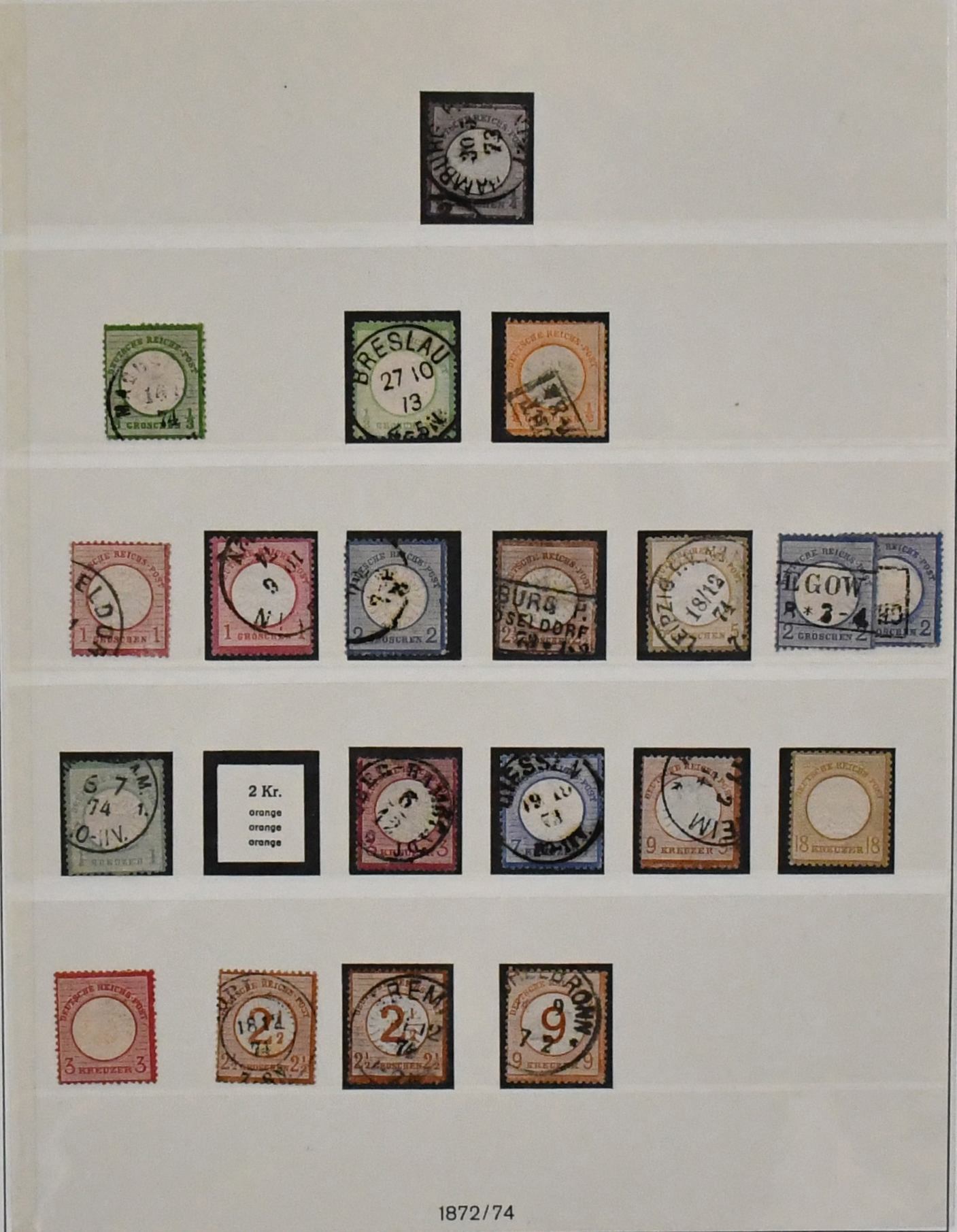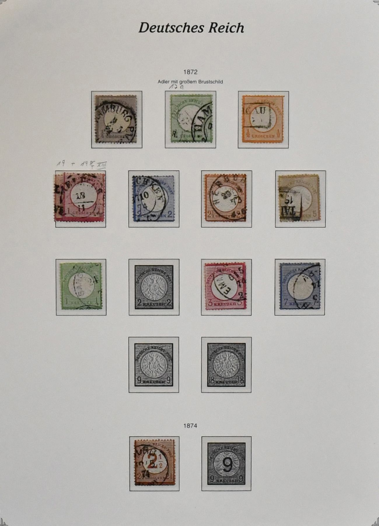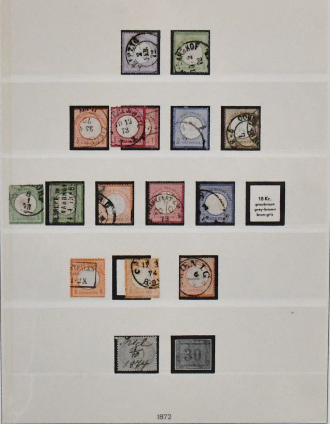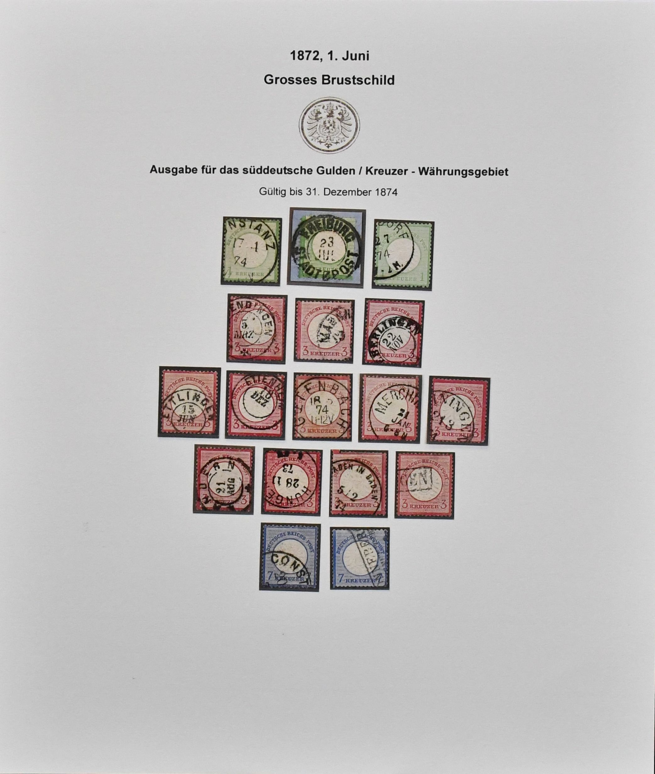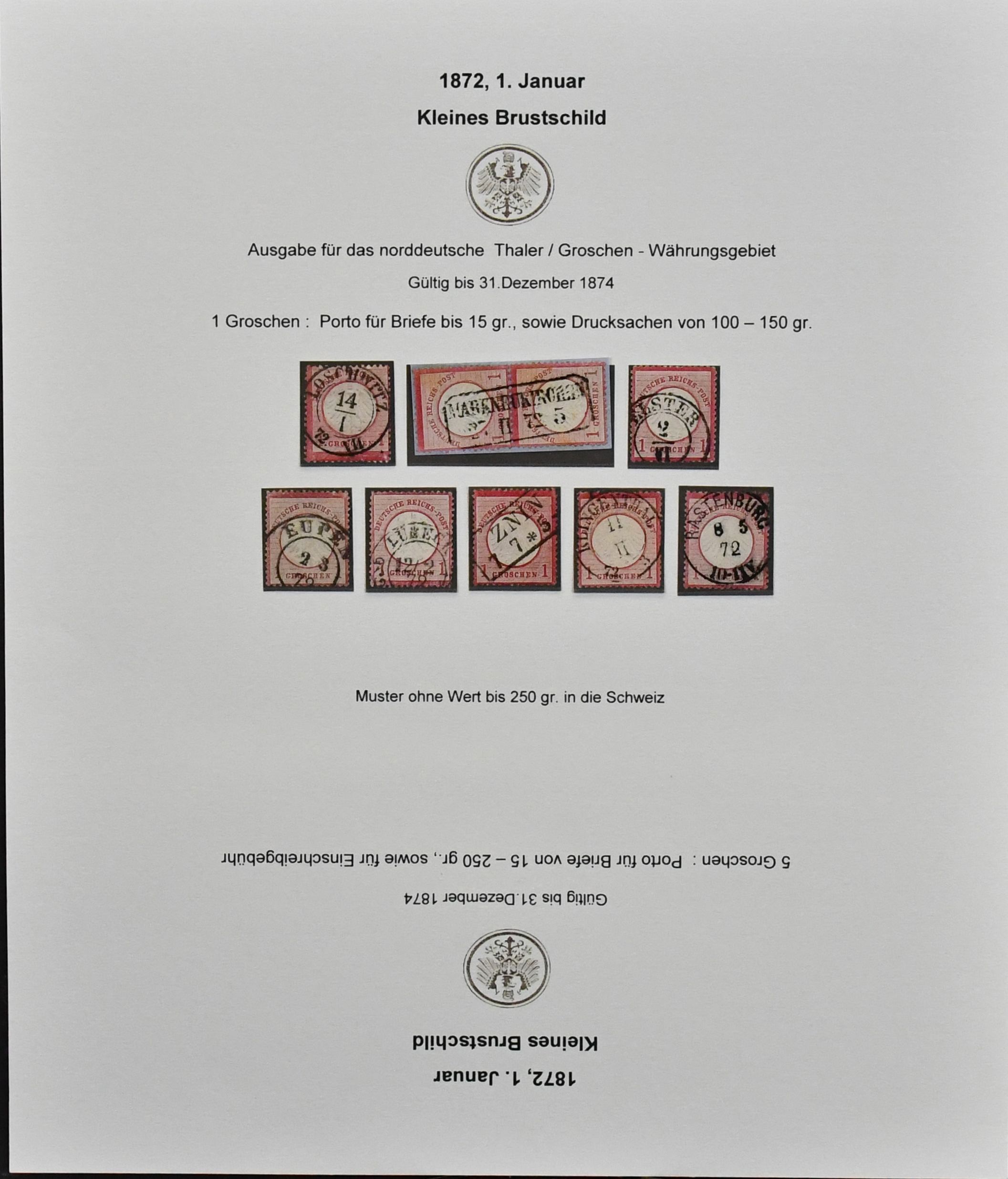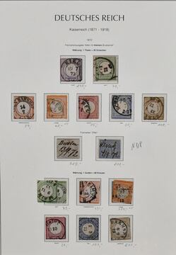 Deutsches Reich, 1872-1874, gestempelte Slg. mit Nr. 1-6, 11, 12/13 mit Federzug, 16-23 usw., auf Vordrucken. Mi. 3000,-