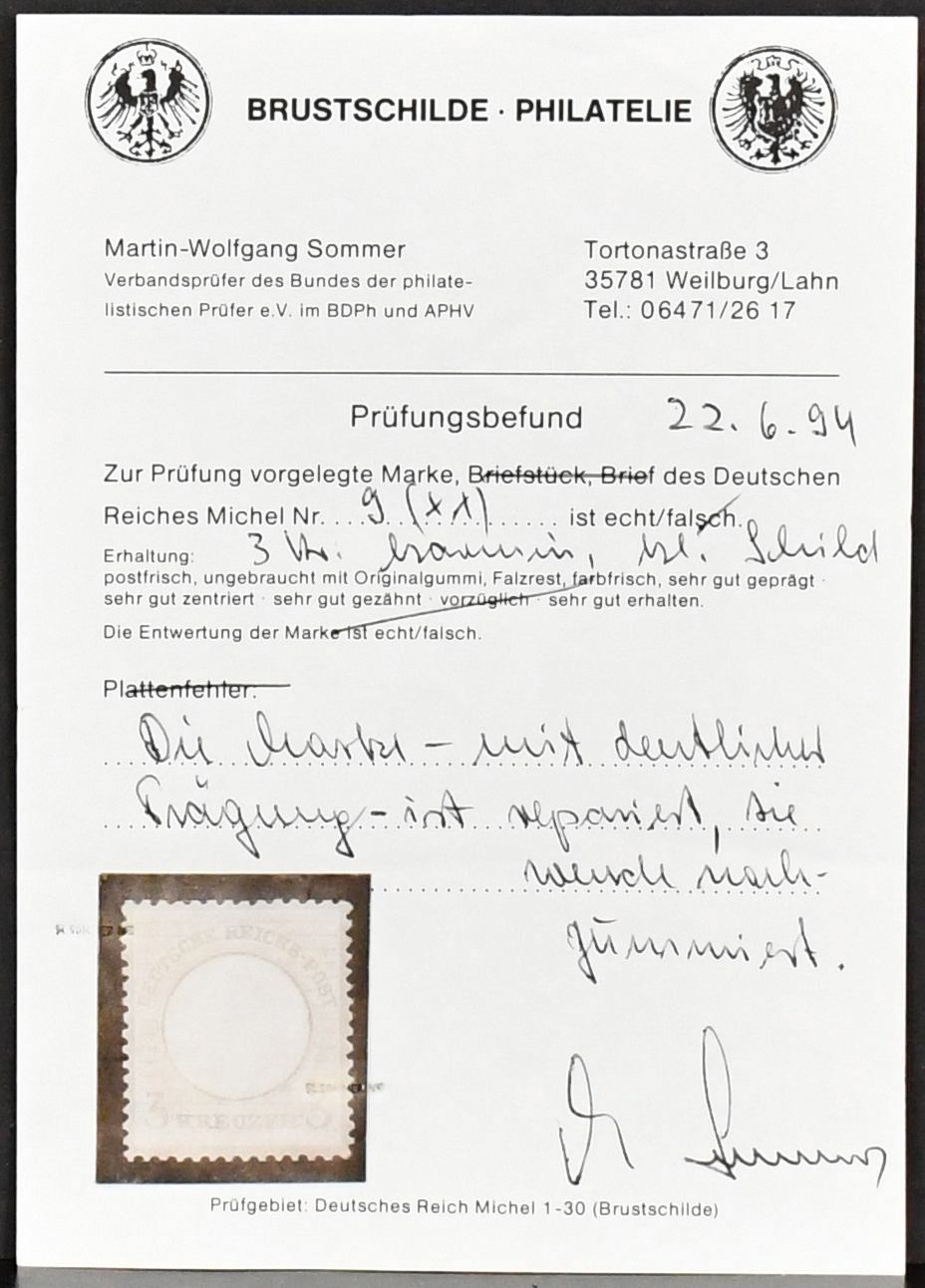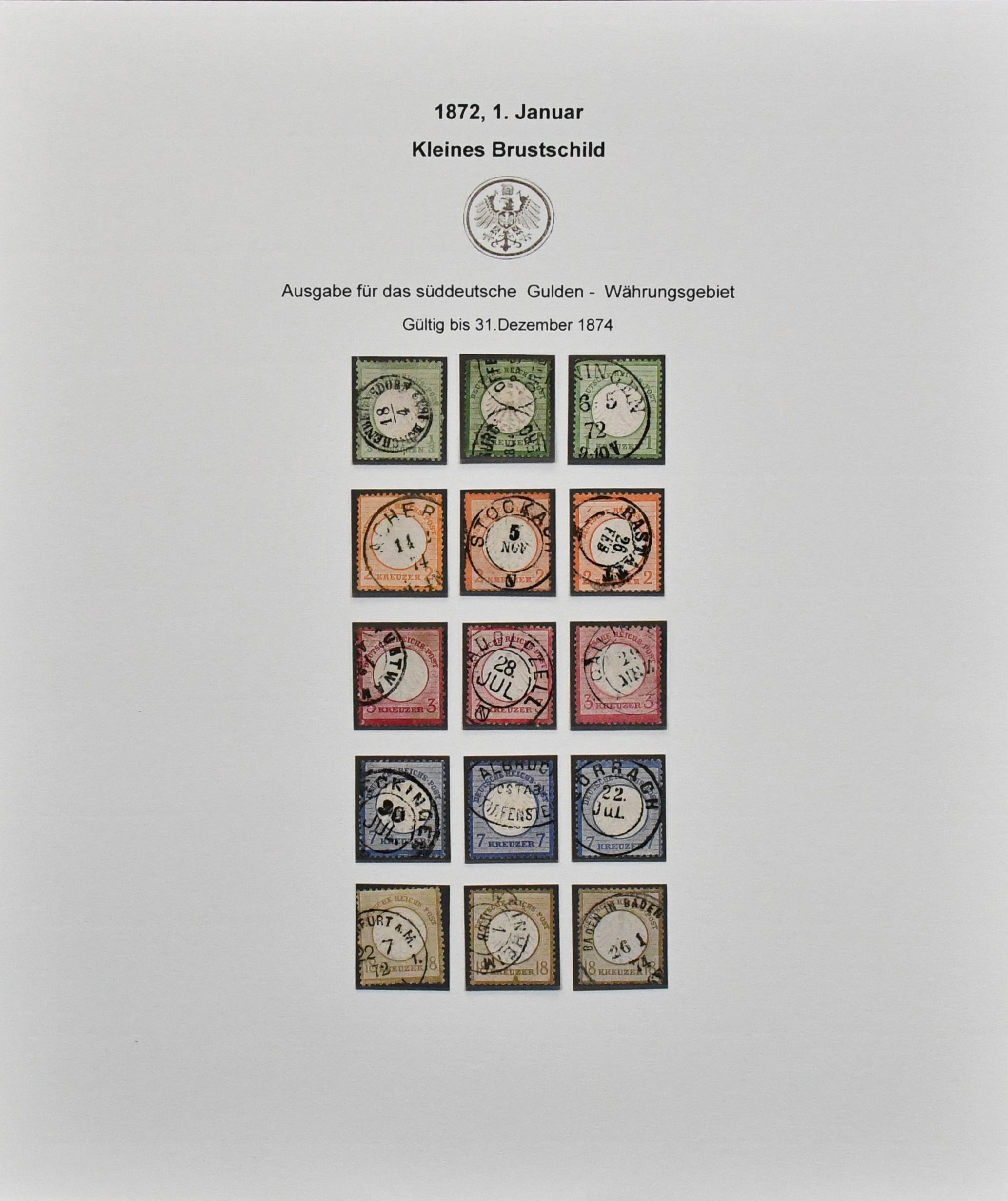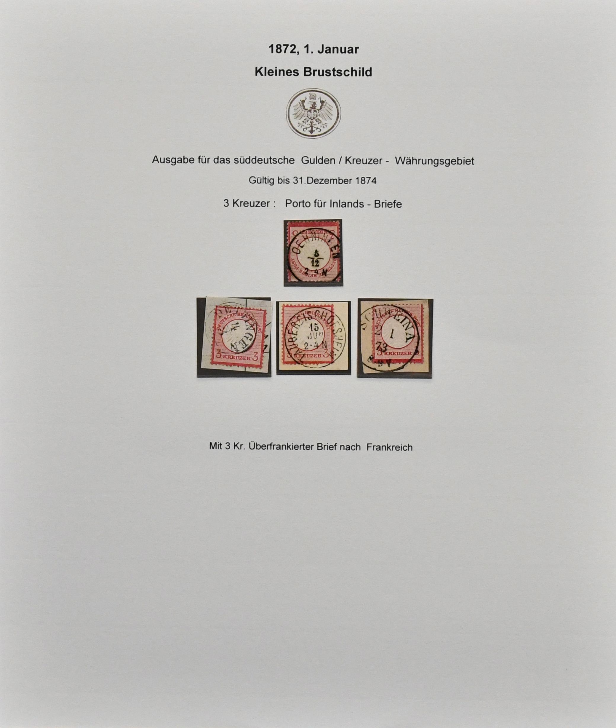 Deutsches Reich, von Nr. 1-30 komplette Sammlung der Brustschild-Ausgaben auf Vordr., dabei Nr. 1/11 gest., Nr. 8 tiefst gepr. Sommer, Nr. 11 tiefst gepr. Pfenninger, Nr. 12 mit Federzug, 13 ungebr., 14/15 gest., 24 mit dekorativem Taxis-K1 "Beerfelden", hoch gepr. Sommer BPP, Nr. 27b, gepr. Sommer, 30 ungebr. etc. Mi. 6700,-, dazu eine Nr. 28 mit Eckstempel unberechnet