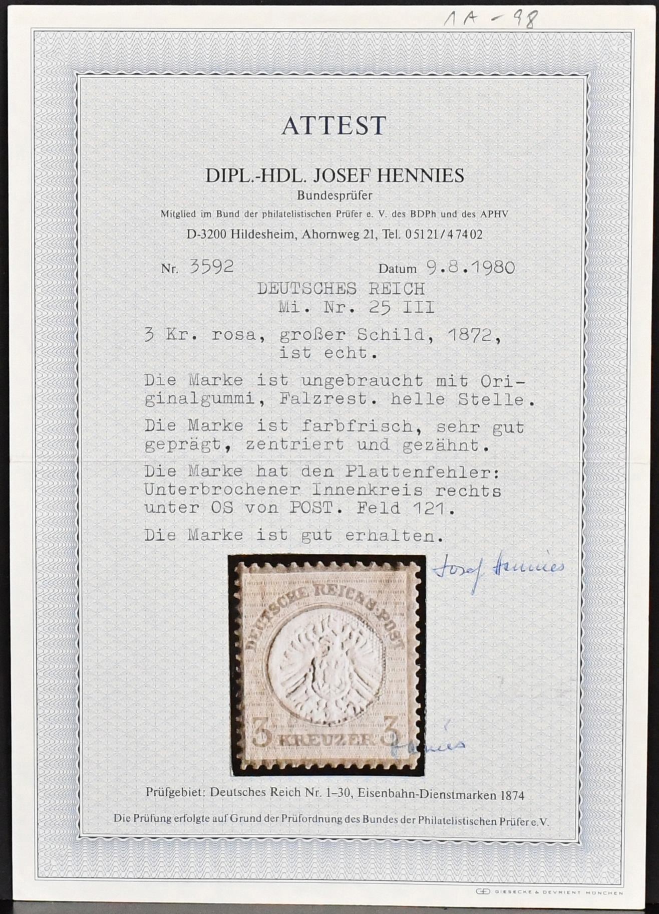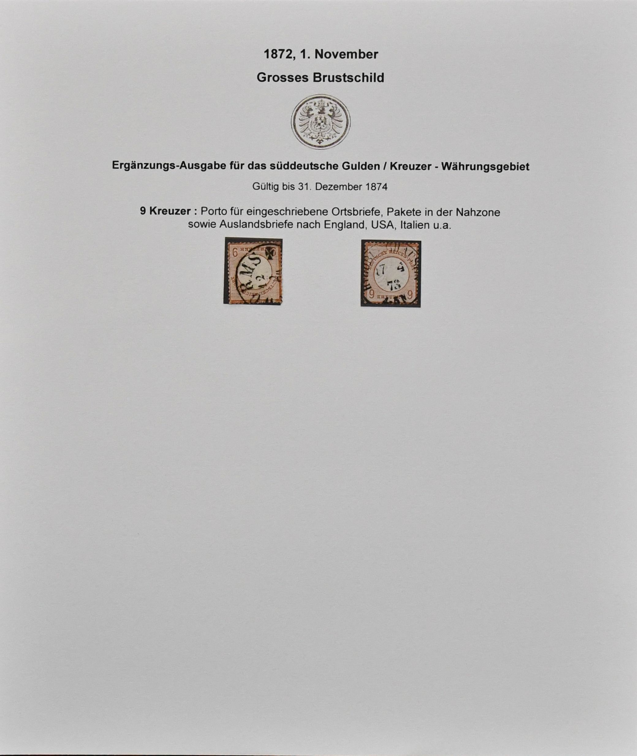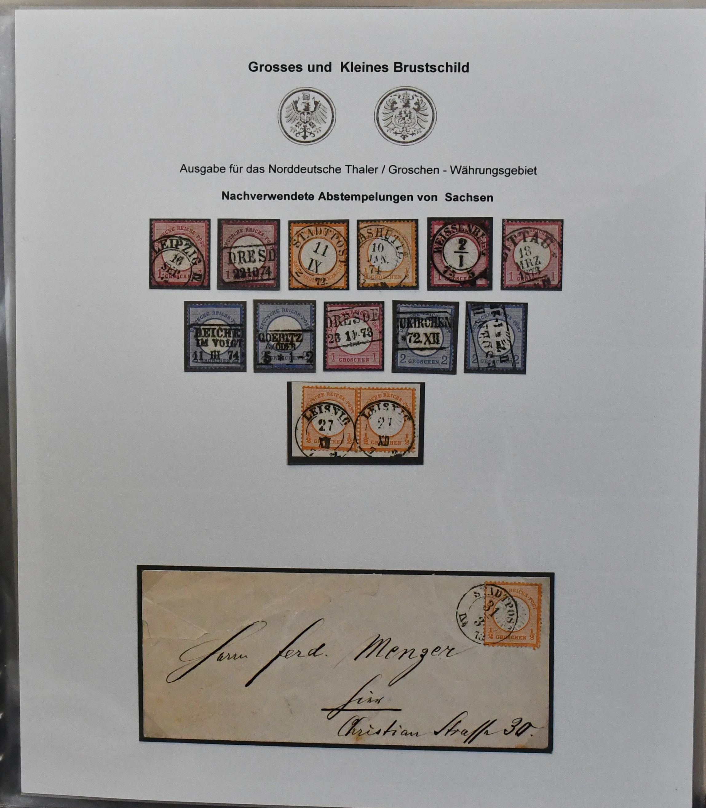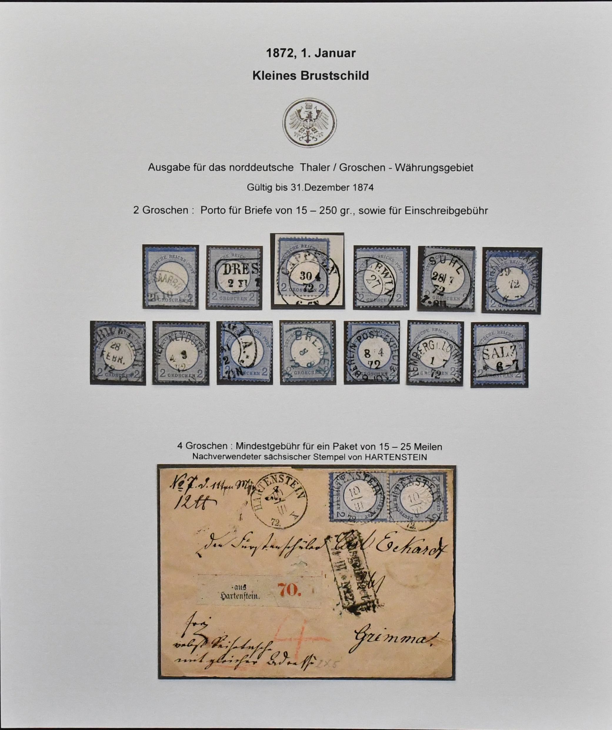 Deutsches Reich, von Nr. 1-30 komplette Sammlung der Brustschild-Ausgaben auf Vordr., dabei Nr. 1/11 gest., Nr. 8 tiefst gepr. Sommer, Nr. 11 tiefst gepr. Pfenninger, Nr. 12 mit Federzug, 13 ungebr., 14/15 gest., 24 mit dekorativem Taxis-K1 "Beerfelden", hoch gepr. Sommer BPP, Nr. 27b, gepr. Sommer, 30 ungebr. etc. Mi. 6700,-, dazu eine Nr. 28 mit Eckstempel unberechnet