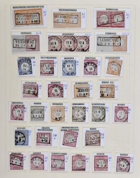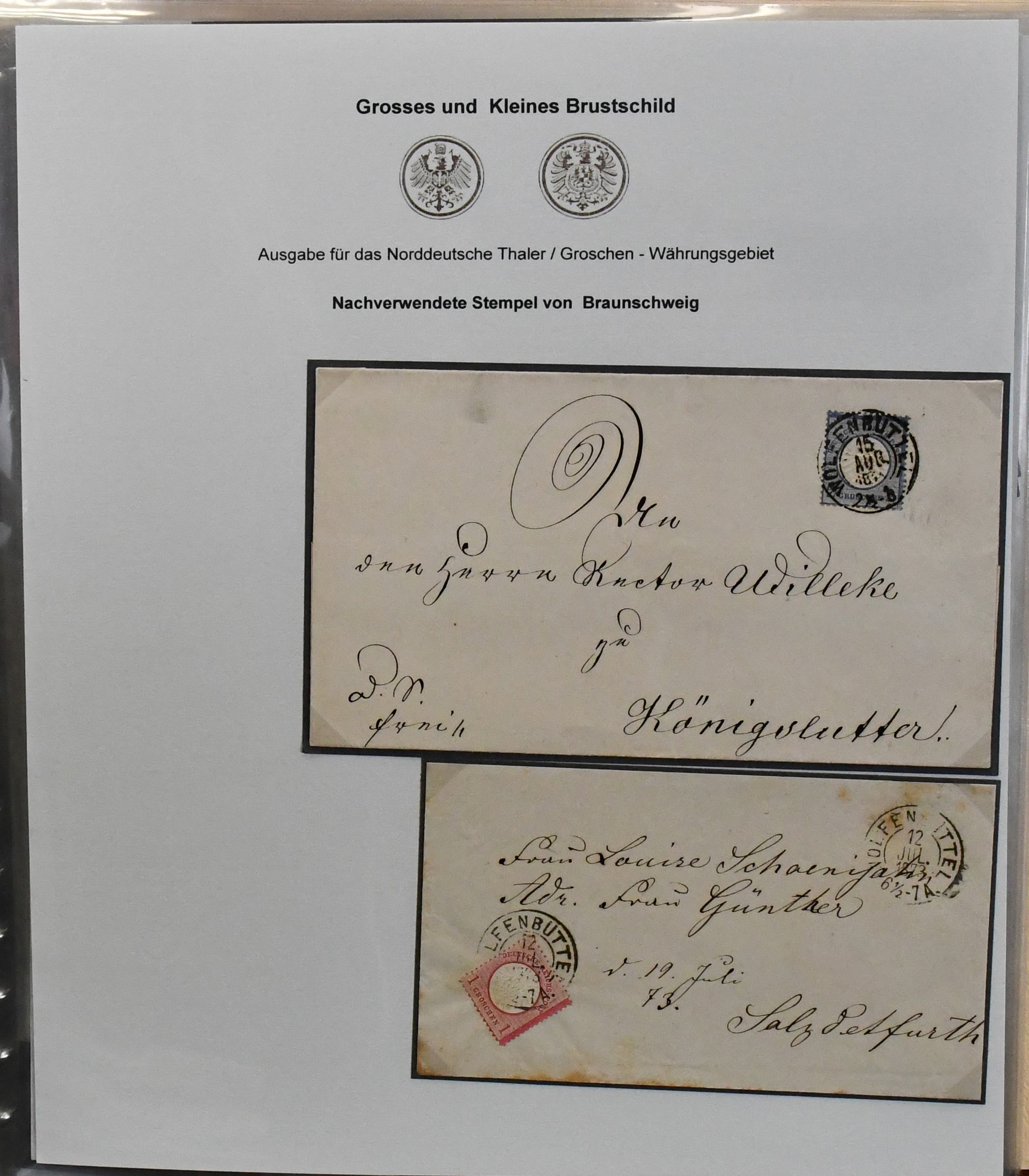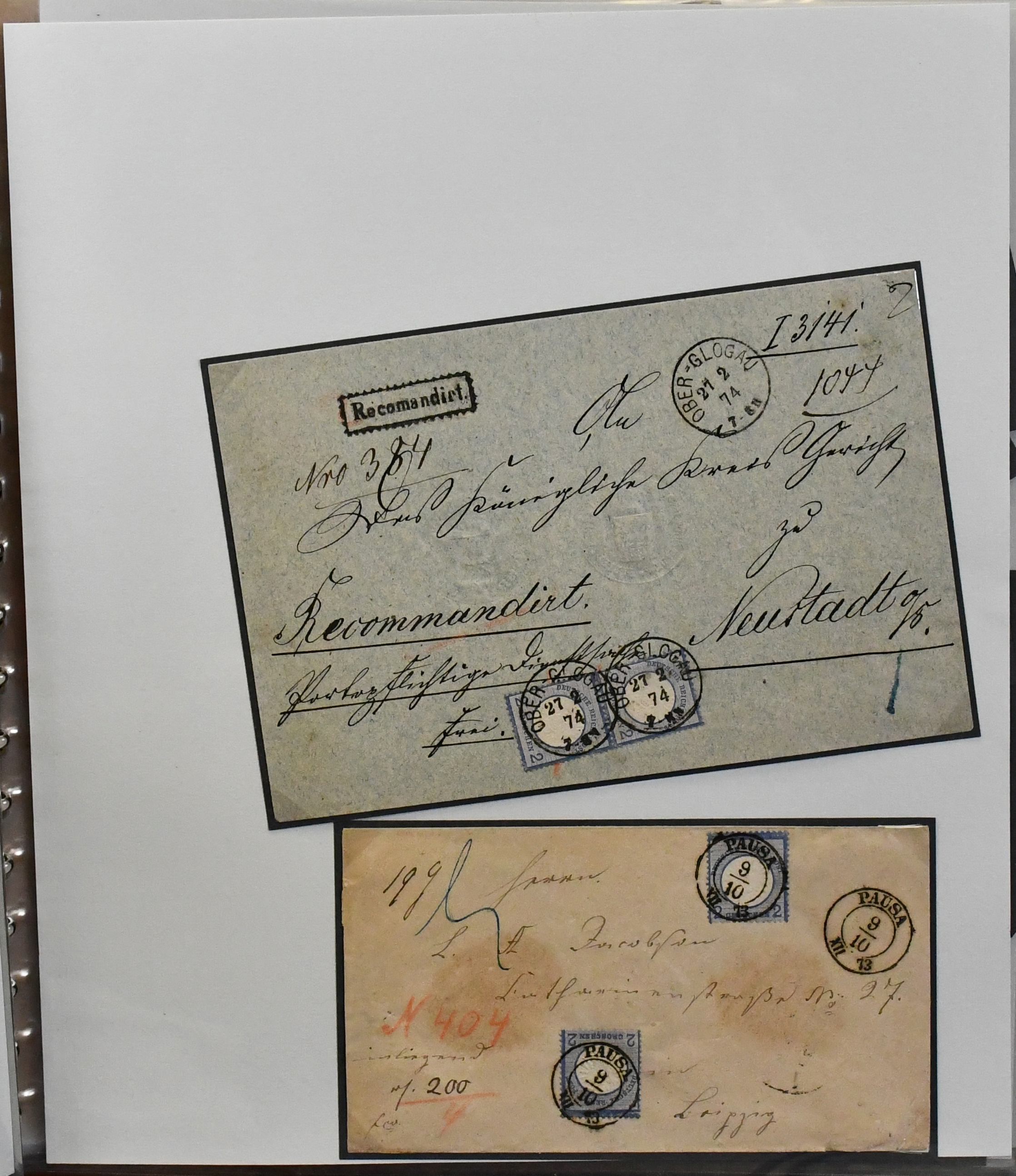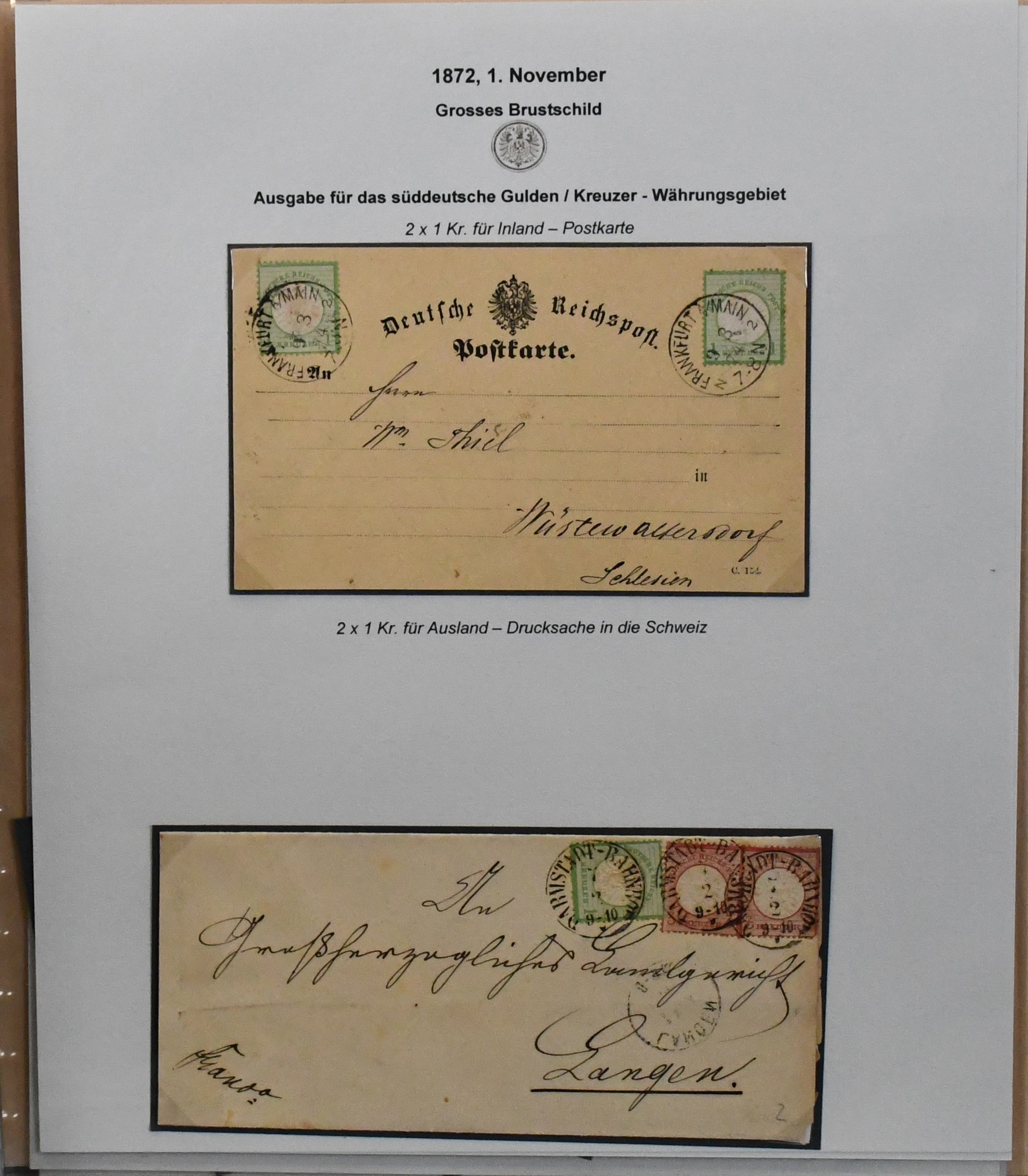 Brustschilde, reichhaltige Slg. mit insbesondere 86 Belegen, sowie diversen Marken (diese wiederum unter Stempel-Gesichtspunkten), bei den Belegen die verschiedenen Portostufen, etliche Auslandsbriefe (u.a. ein seltener Grenzrayon-Einschreibebrief), Besonderheiten wie 1 Kr. kl. und gr. Schild als EF, MeF etc., oft sehr gute Erhaltung