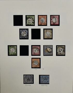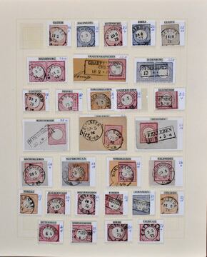 Brustschilde, Zusammenstellung mit vielen schön gestempelten Werten (Nr. 12/13 nur hs. entwertet), ab Nr. 1-11 meist doppelt (!), Nr. 12 per zwei, 14-15, 16(2)-22, mit dreimal Nr. 21, 23(4), 27, 28 (Stempel falsch), 29-30, diverse hübsche Briefstücke etc., günstiger Ausruf!