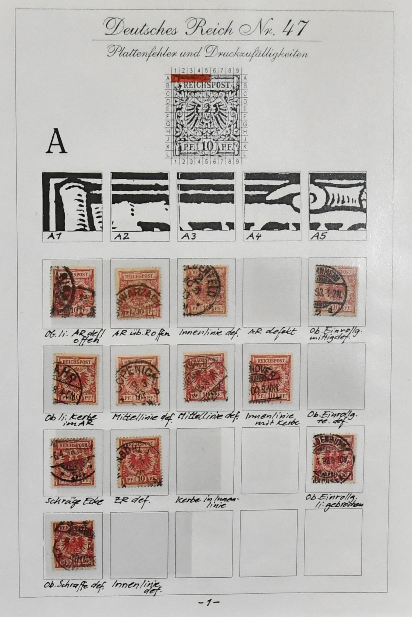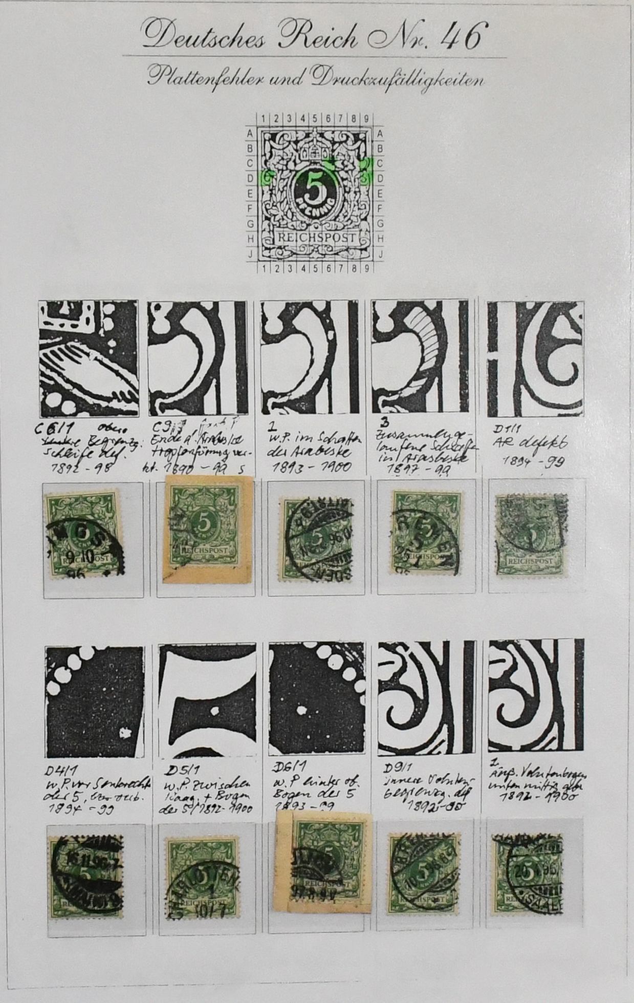 Deutsches Reich, Plattenfehler und Besonderheiten, 1872-1922, Spezialslg. im Ringbinder auf 47 selbstgest. Blättern, graphisch schön beschriftet und mit etwa 550 Werten sehr gut bestückt ab den Brustschilden, starker Teil Krone-Adler, sowie Querformate Germania ex Nr. A113-117