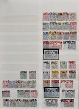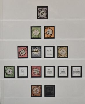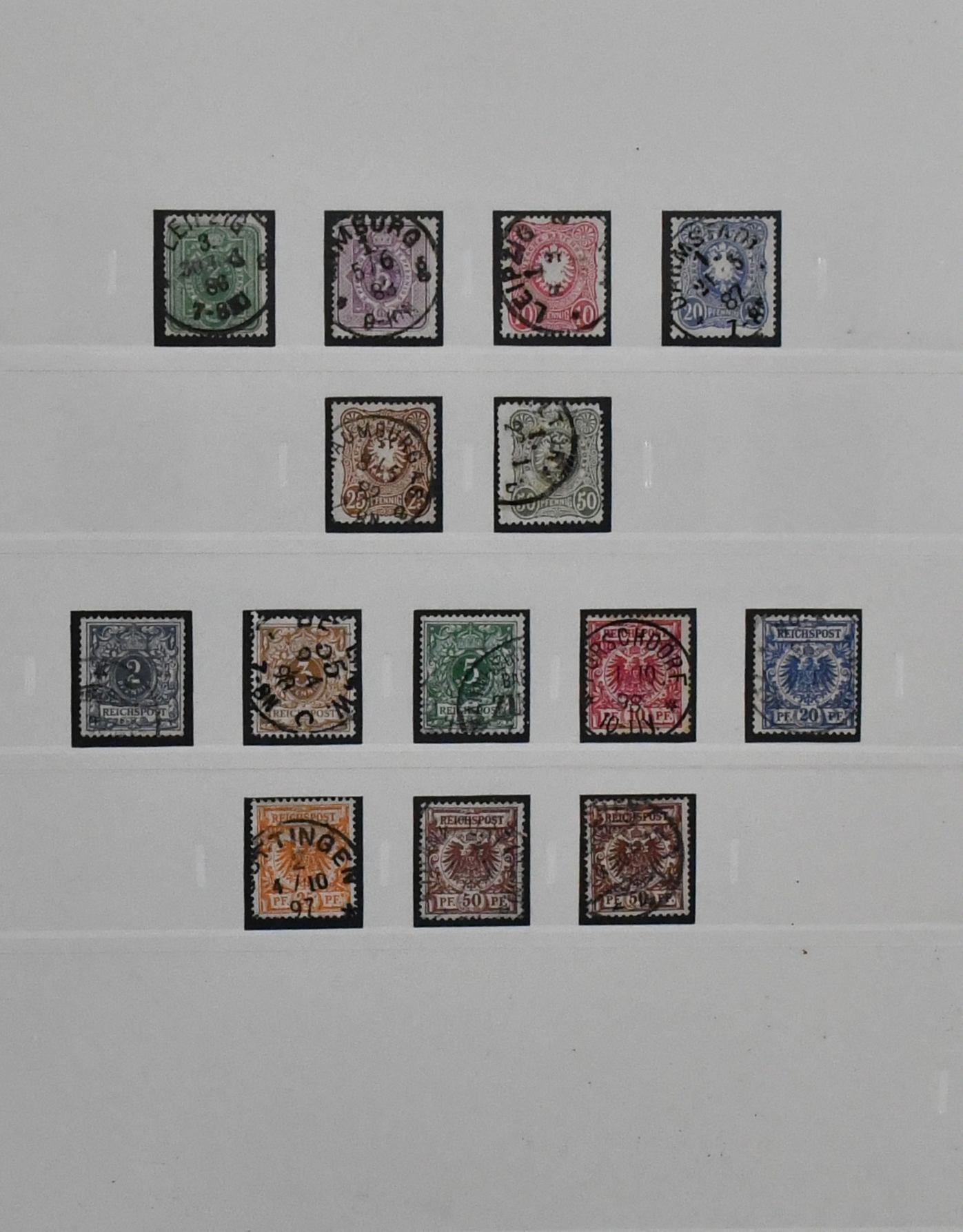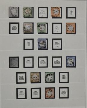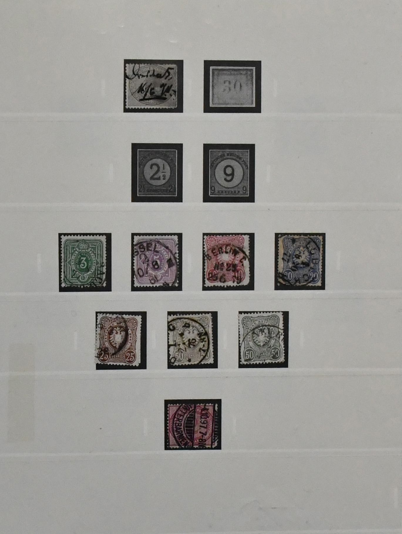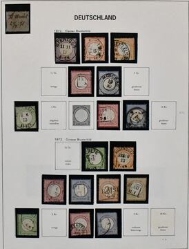 Deutsches Reich, 1872/1923, gestempelte Sammlung, beginnend mit einigen Brustschilden ab Nr. 2/3, mit Nr. 7, 10, 12 mit Federzug, 16/21, 37 in versch. Farben, 65, Infla in der "Breite" reichhaltig, ohne ungeprüfte teure Werte, sowie Dienst ab Nr. 1/8, im alten Borek-Vordruckalbum. Mi. 3400,-