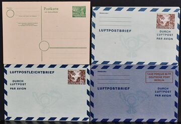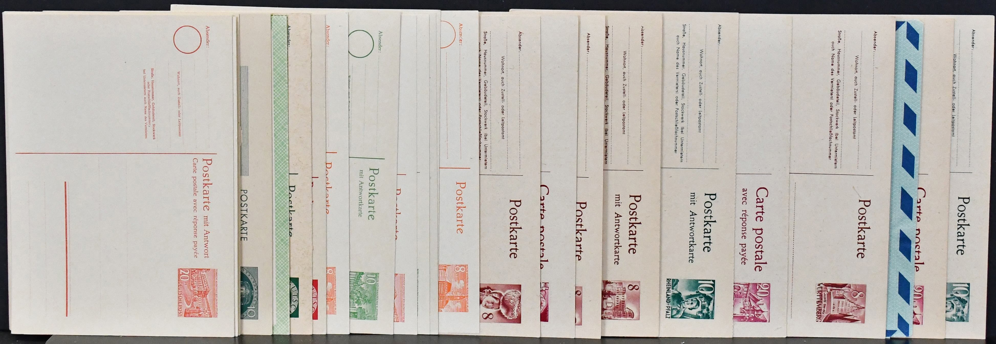 Deutschland, ca. 1948-1955, 34 bessere ungebrauchte Ganzsachen, Französ. Zone, Berlin mit guten frühen Bauten-Karten, sowie Bund Luftpost-Leichtbriefe, dabei alleine 10 Doppelkarten, fast alle verschieden. Mi. 2000,-