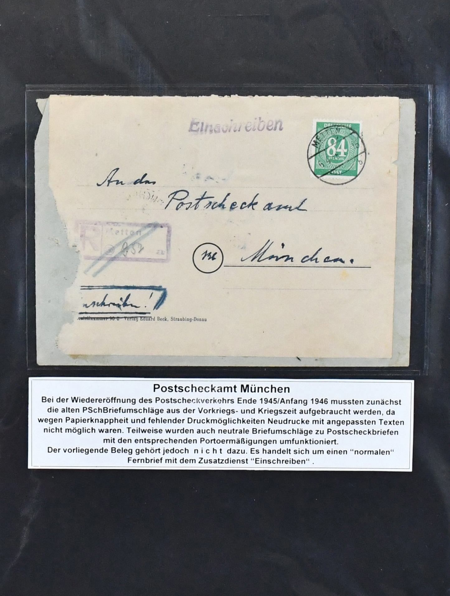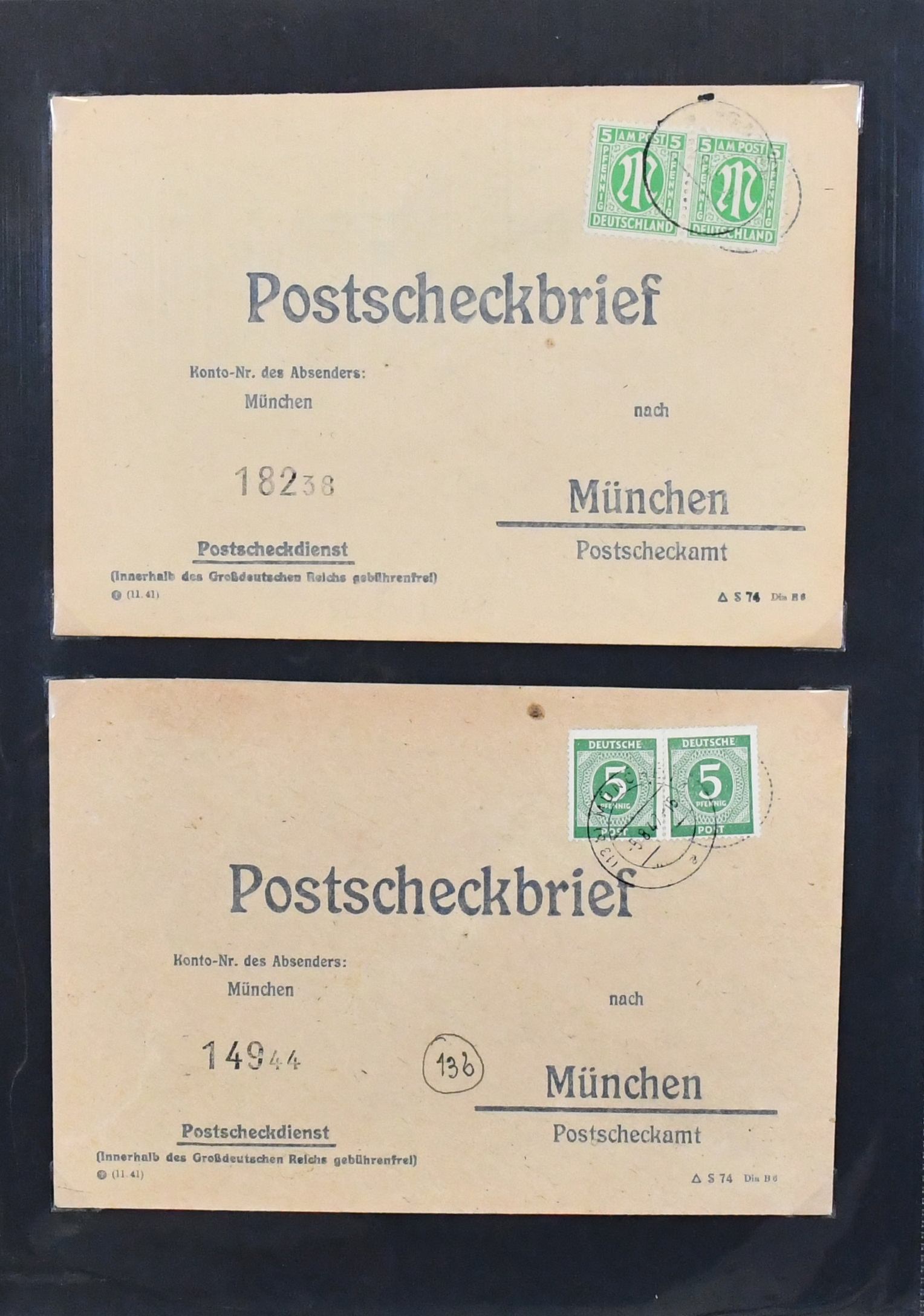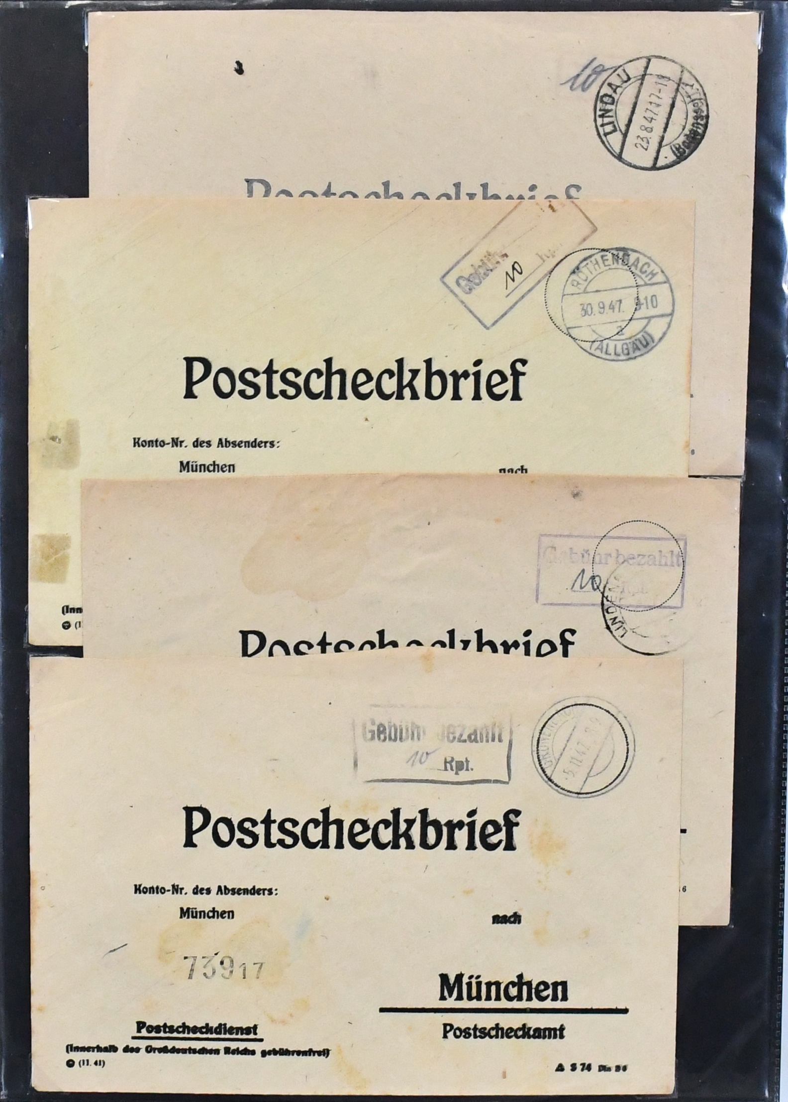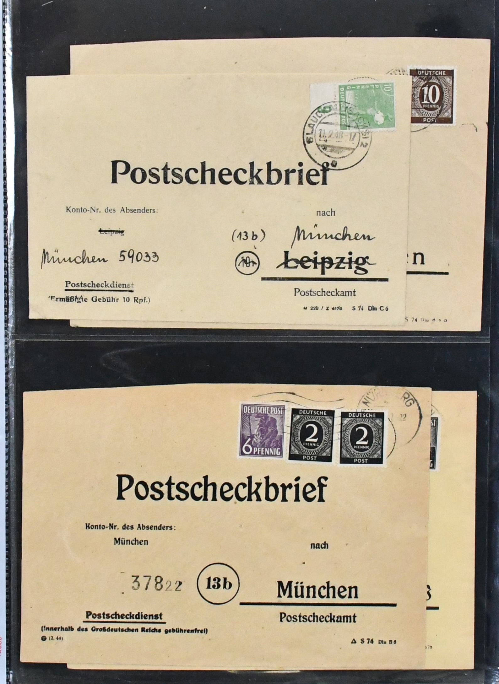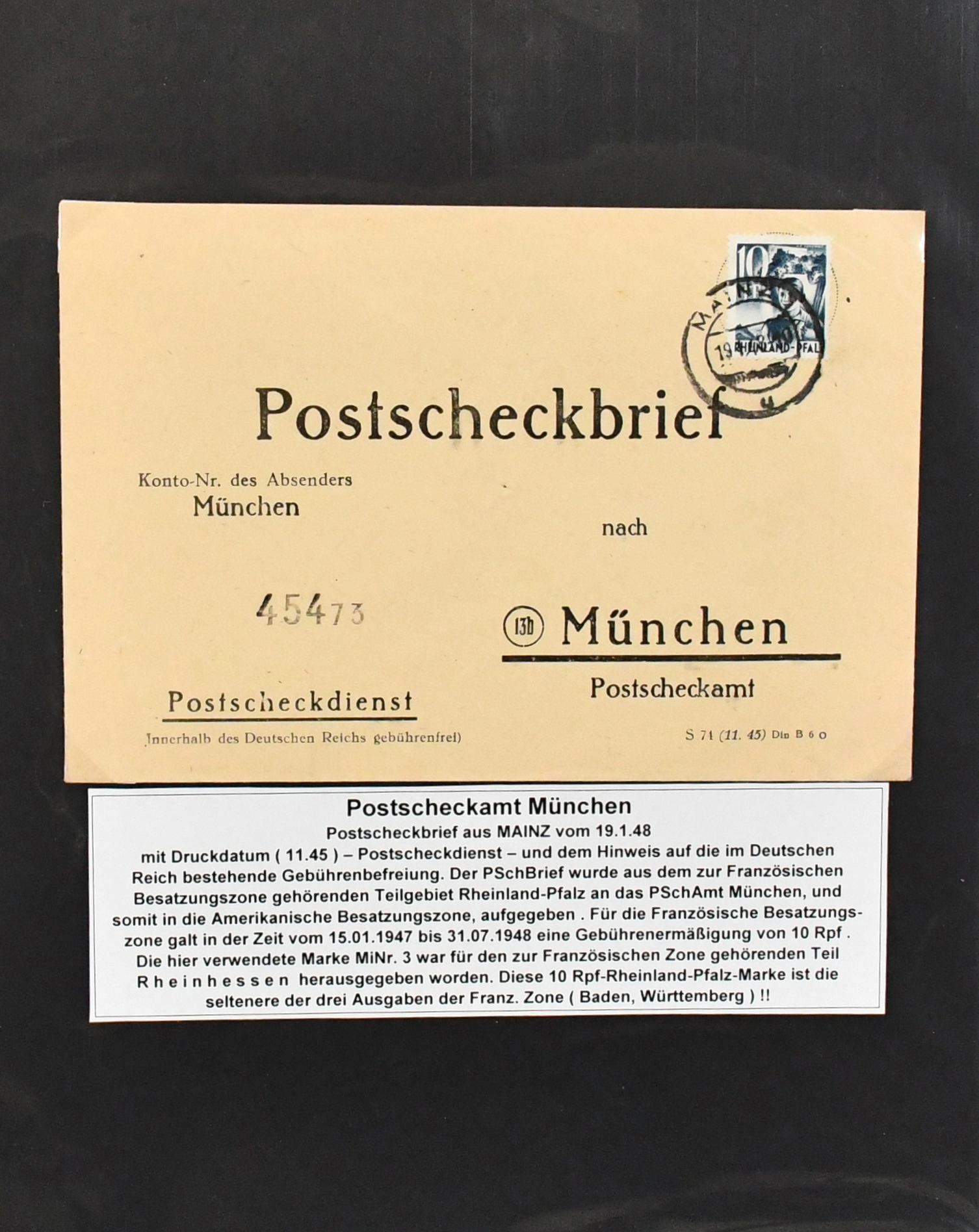Alliierte Besetzung, Postscheckbriefe des PSchA München, 53 Postscheckbriefe, dabei eine EF 84 Pfg. auf R-Brief an das Postscheckamt, EF Kontrollrat Nr. 917 (8 Pfg.), "Gebühr bezahlt", sowie elf Briefe mit EF Französische Zone an das PSchA München (selten!)