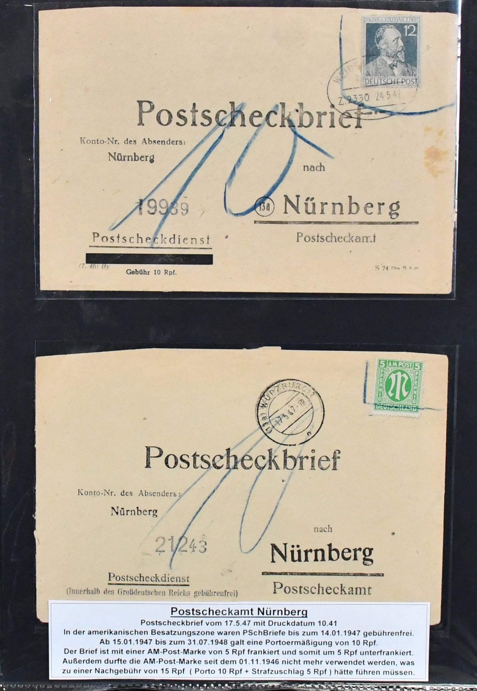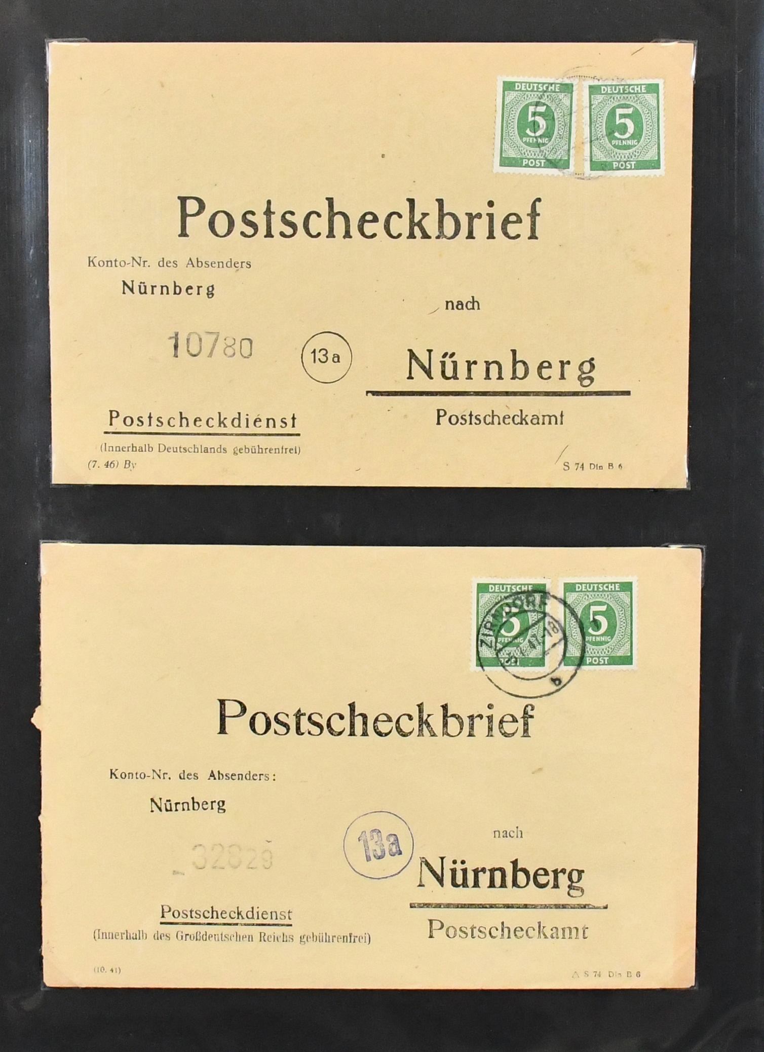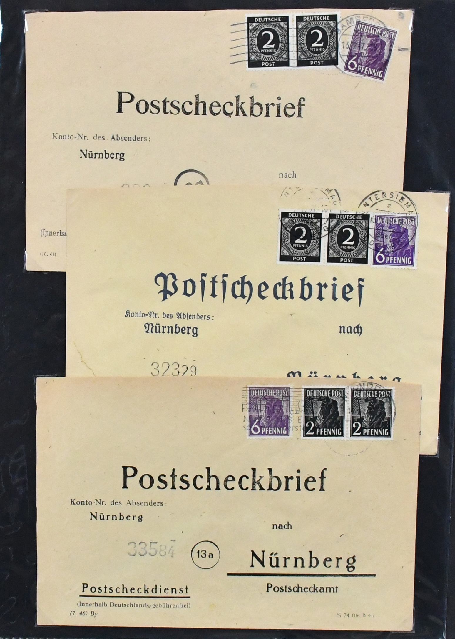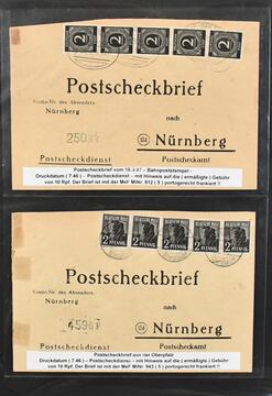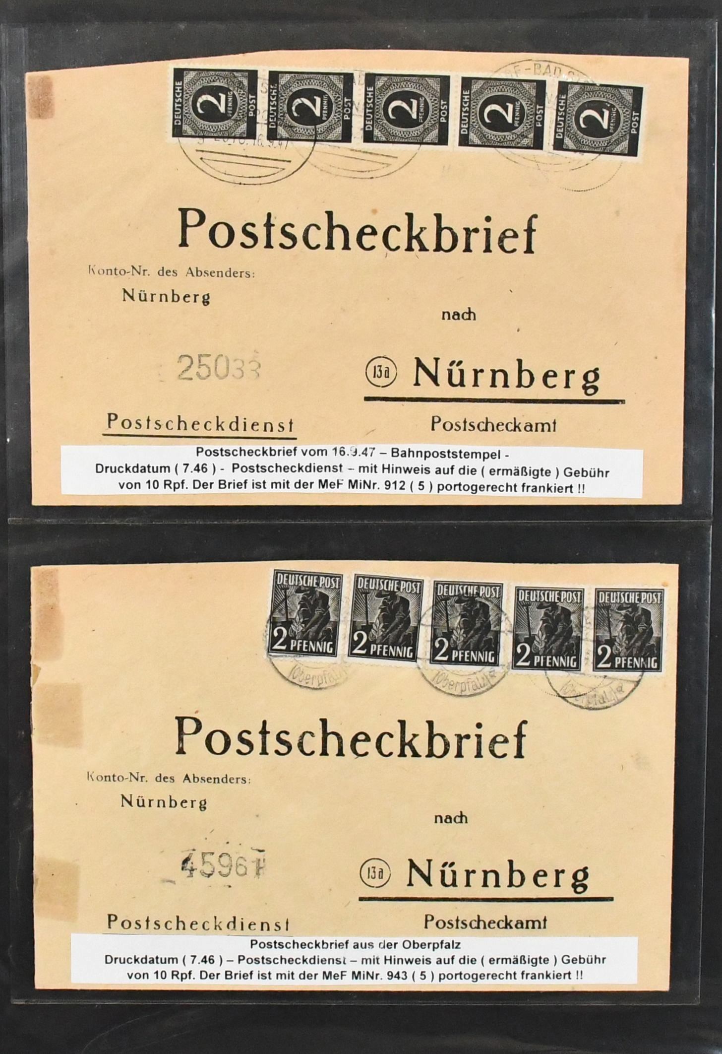 Alliierte Besetzung, Postscheckbriefe des PSchA Nürnberg, Slg. von 36 Belegen, dabei MeF Kontrollrat Nr. 912 und 943 je per fünf, zwei seltene EF Nr. 924 und 950, zwei Nachgebühr-Postscheckbriefe etc.