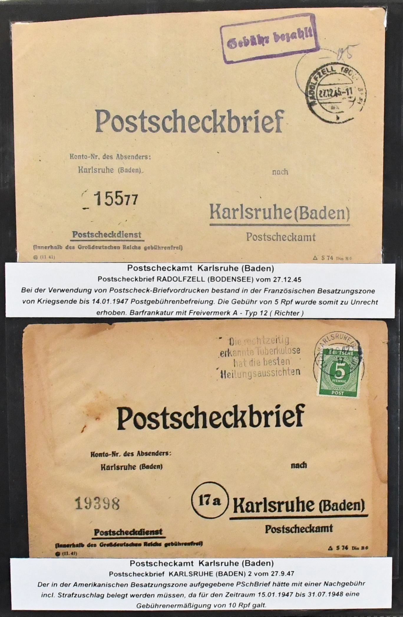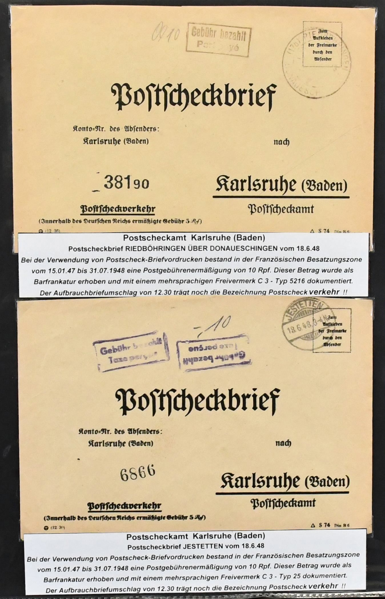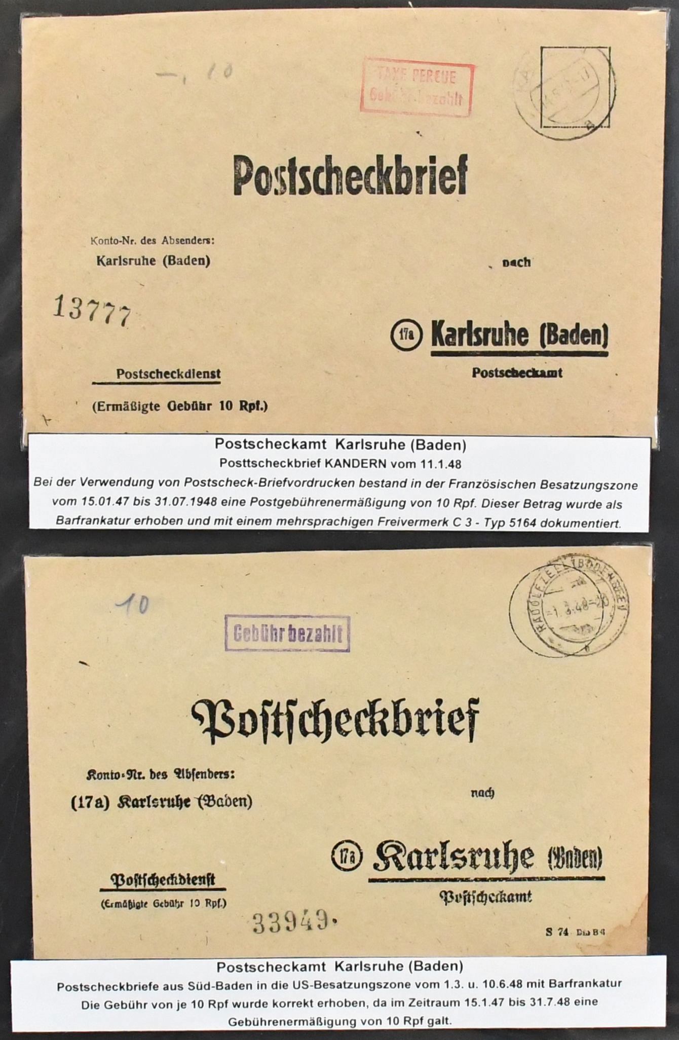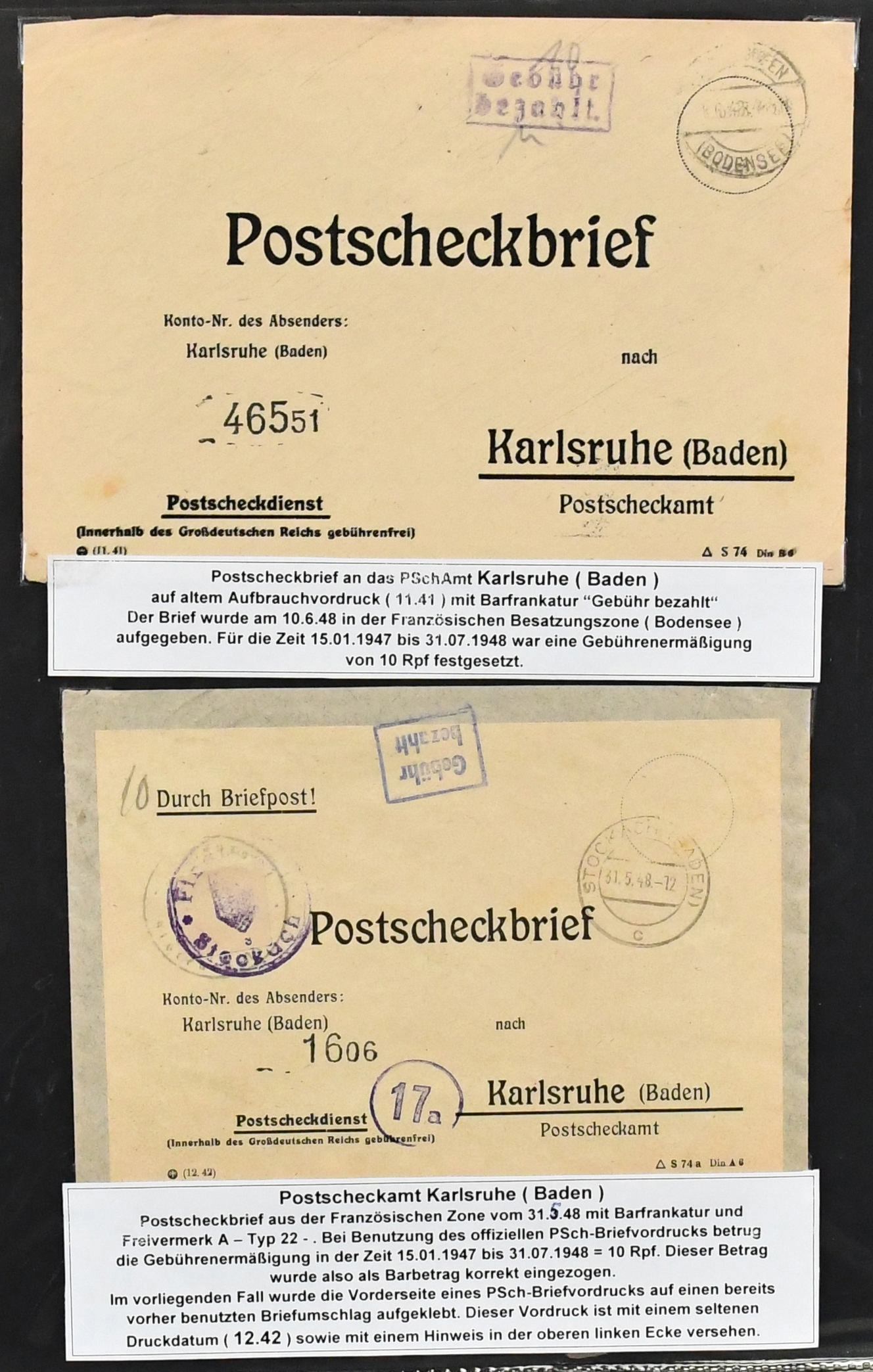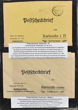 Alliierte Besetzung, Postscheckbriefe, Slg. von 19 Belegen von seltenen Postscheck-Ämtern, Karlsruhe (17!), Stuttgart und Frankfurt