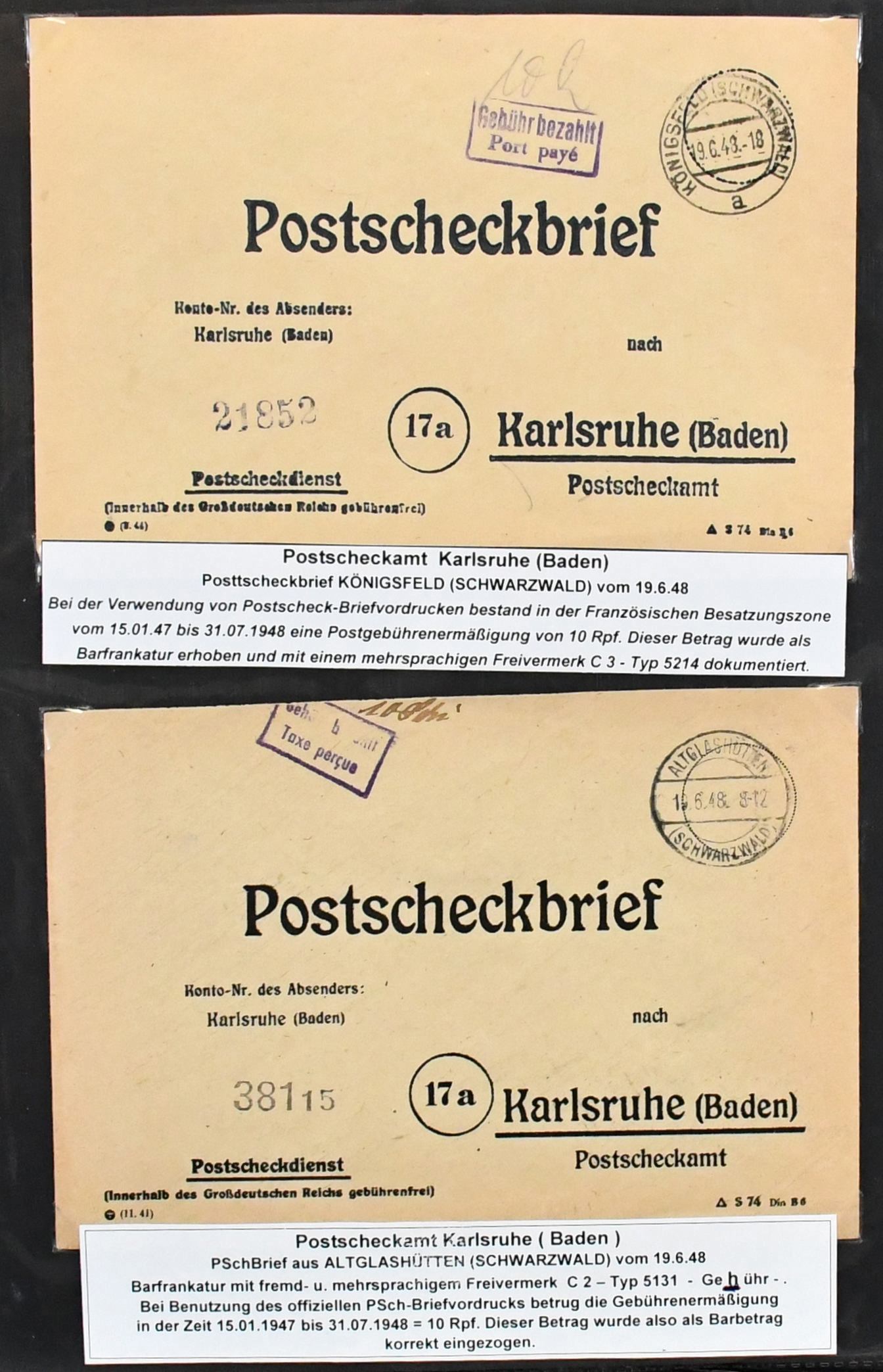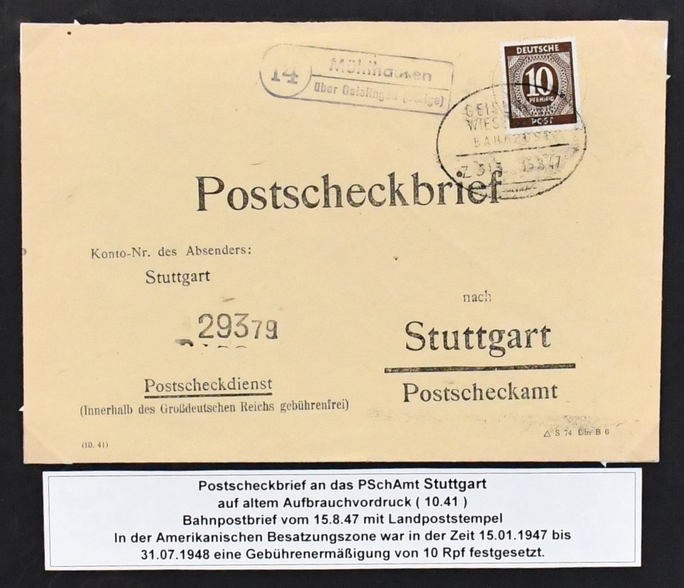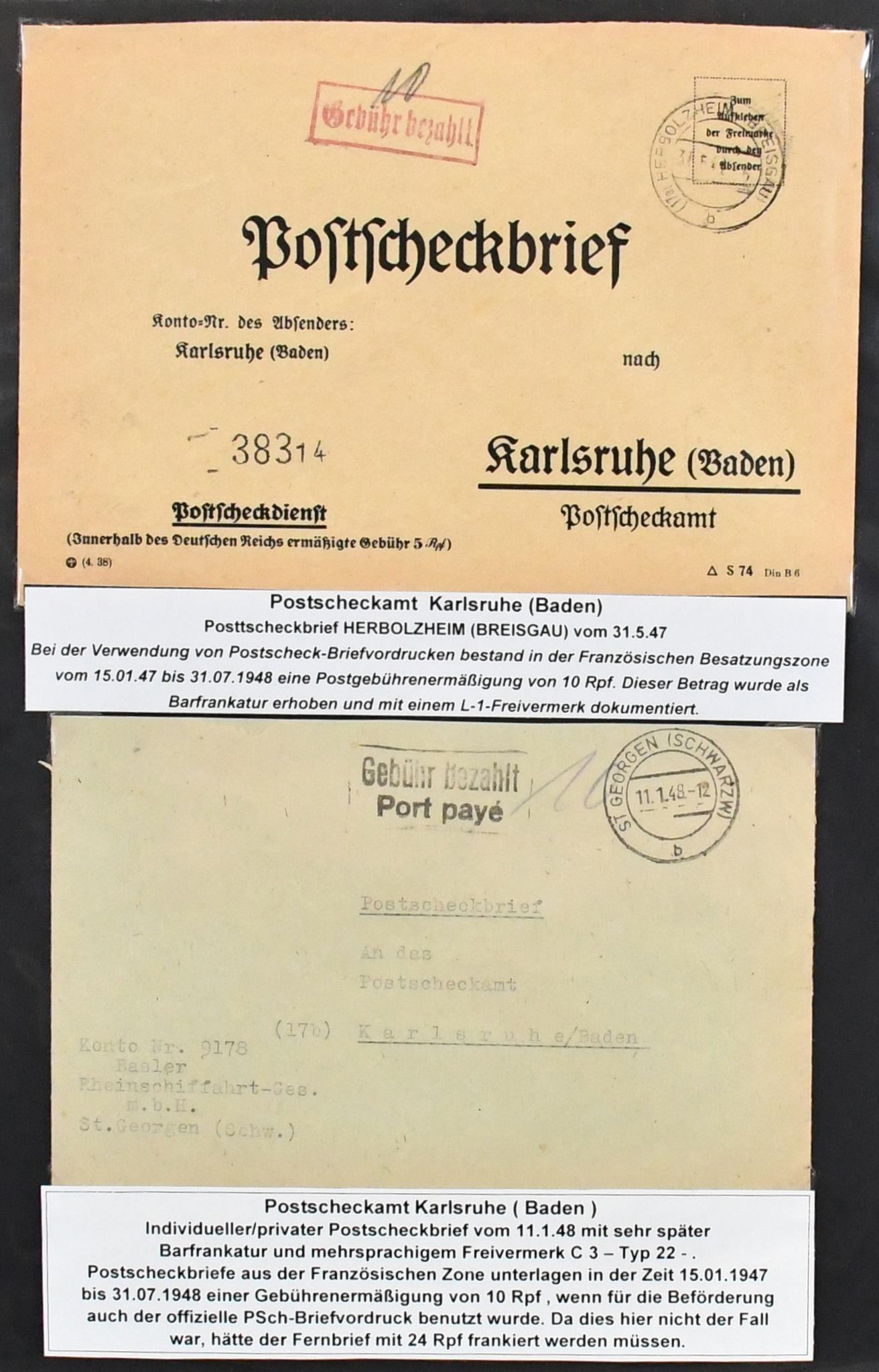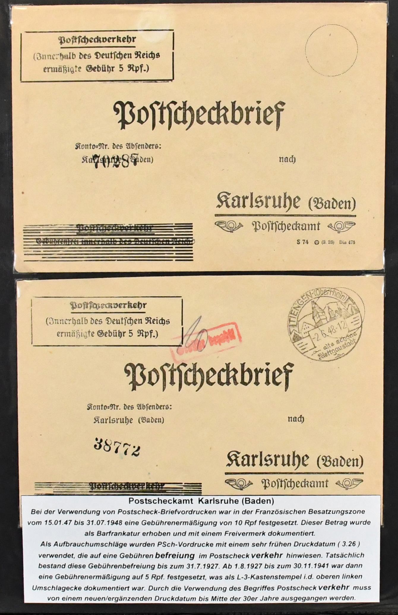 Alliierte Besetzung, Postscheckbriefe, Slg. von 19 Belegen von seltenen Postscheck-Ämtern, Karlsruhe (17!), Stuttgart und Frankfurt