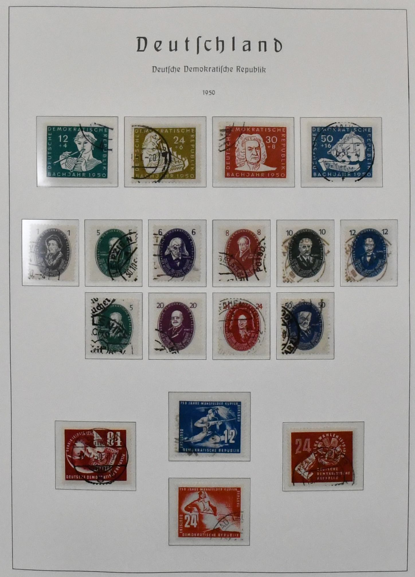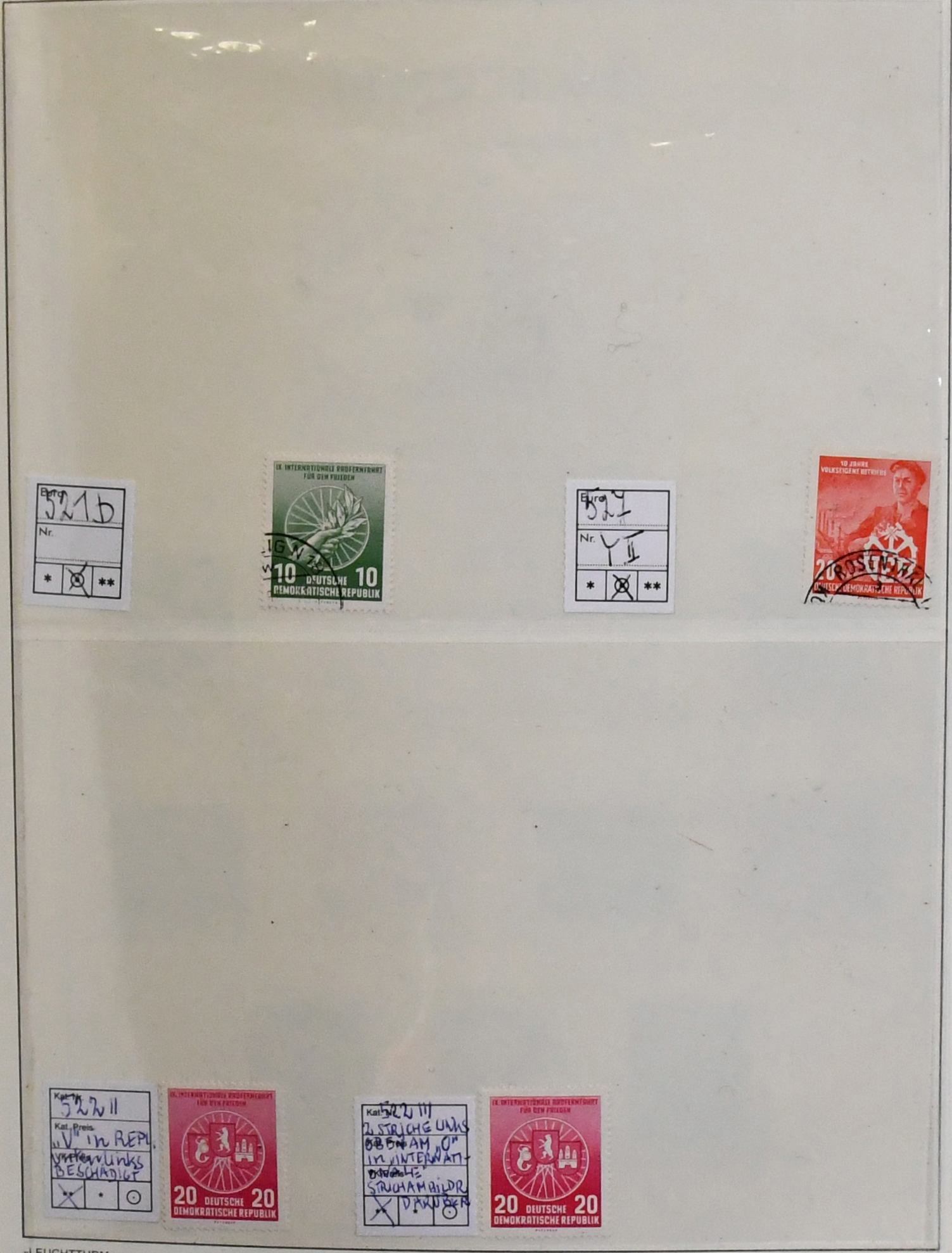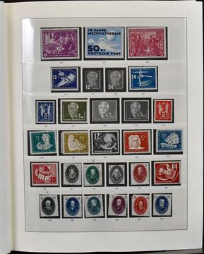 DDR, 1949-1990, dreibändige, meist postfrische Slg., annähernd kpl. (einige wenige Werte fehlen bzw. sind ungebraucht), dabei Messe-Ausgaben, Bach, Chinesen (Nr. 286/88), Bl. 7, Marx-Blöcke (8/9A/B), teils geprüft, Bl. 10/15 usw. Mi. 4800,-