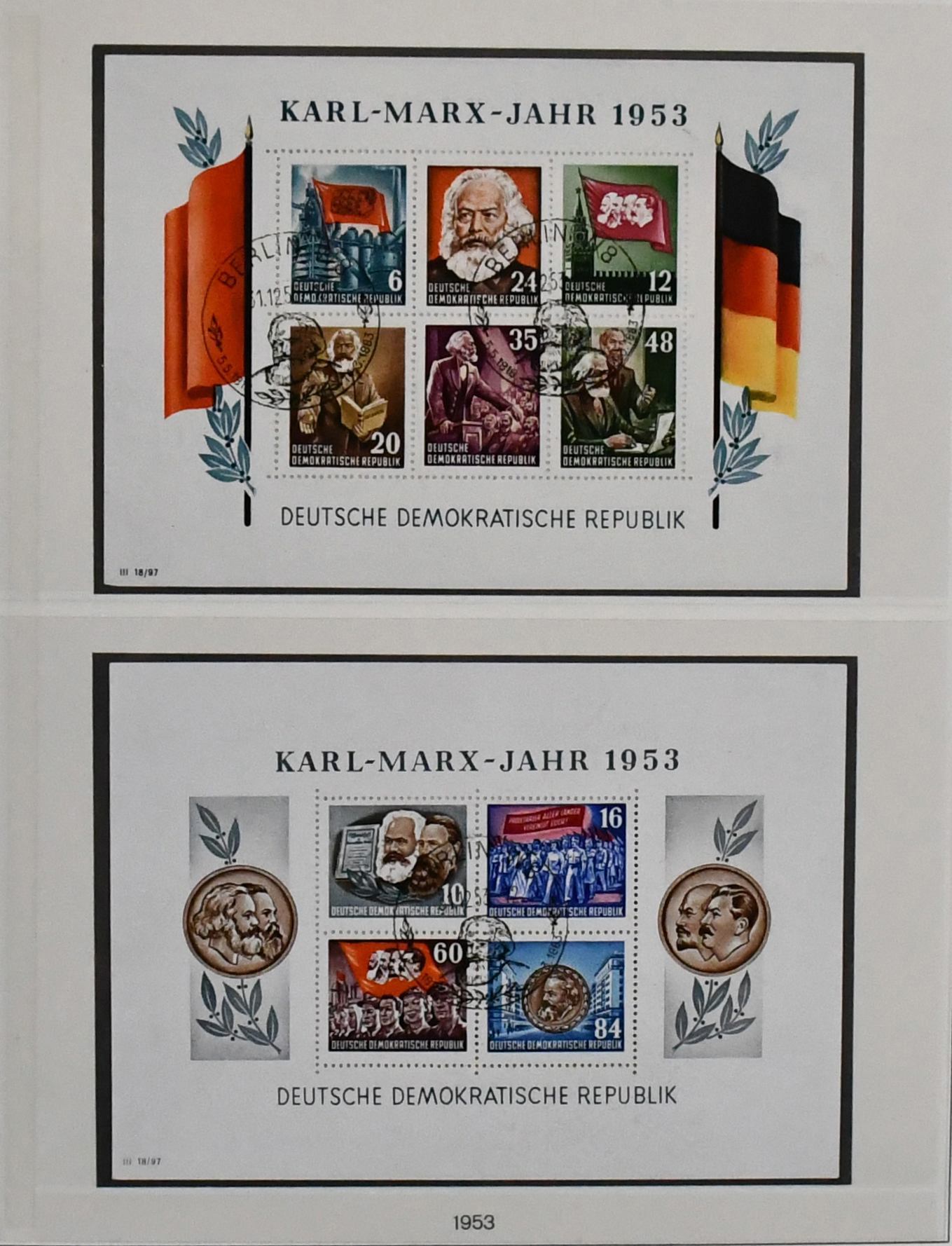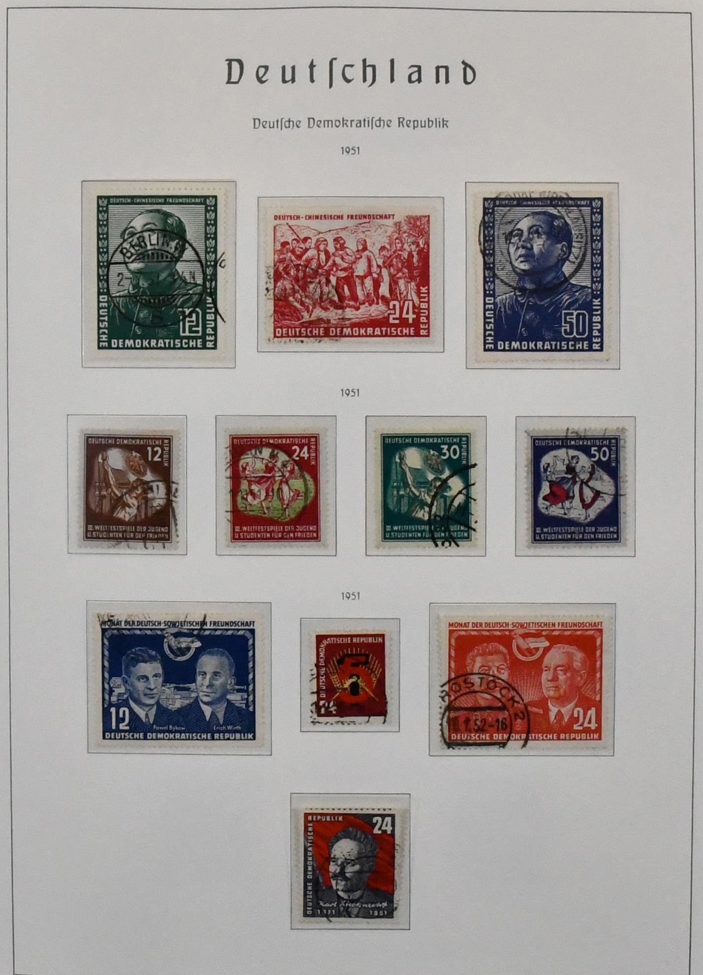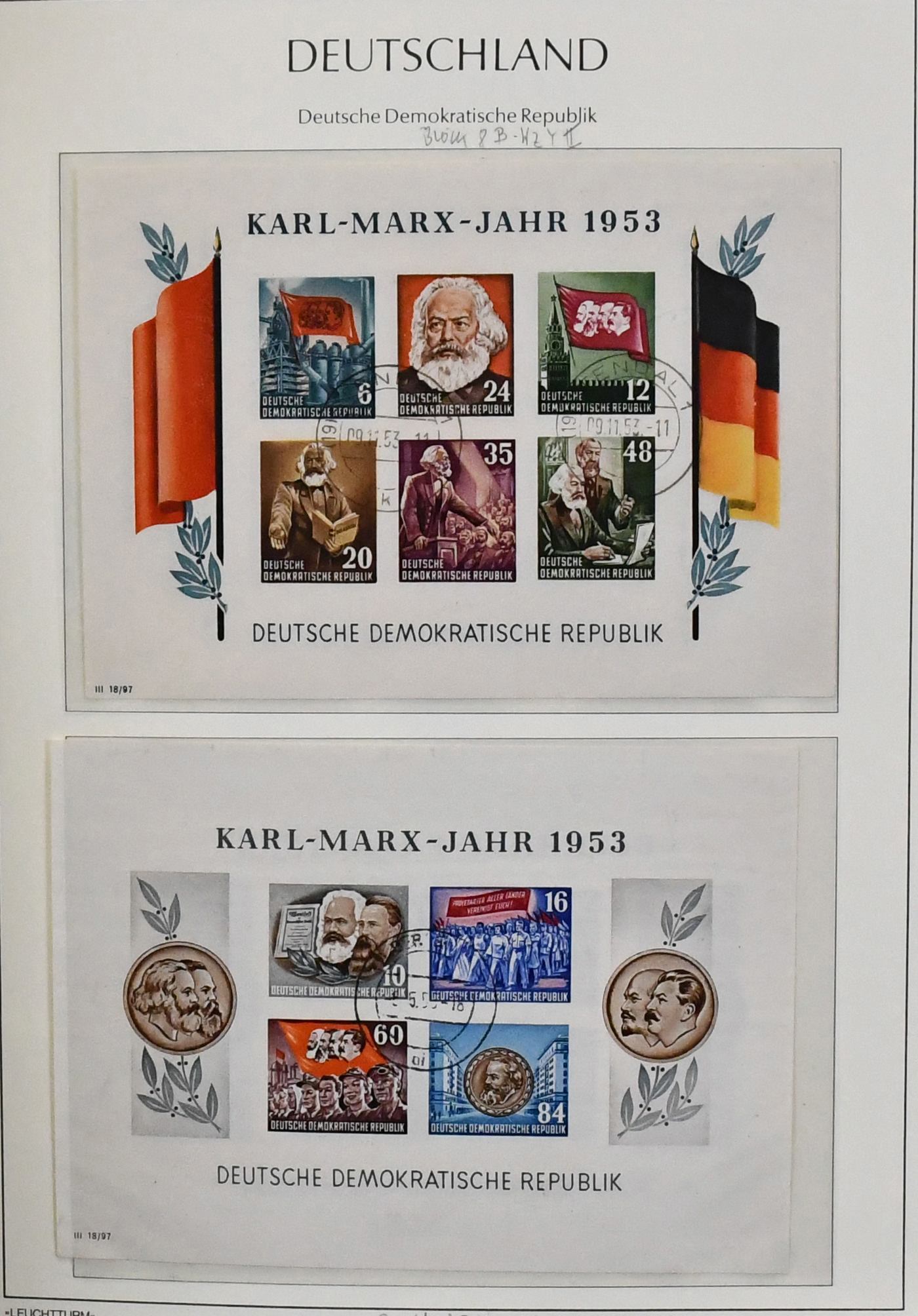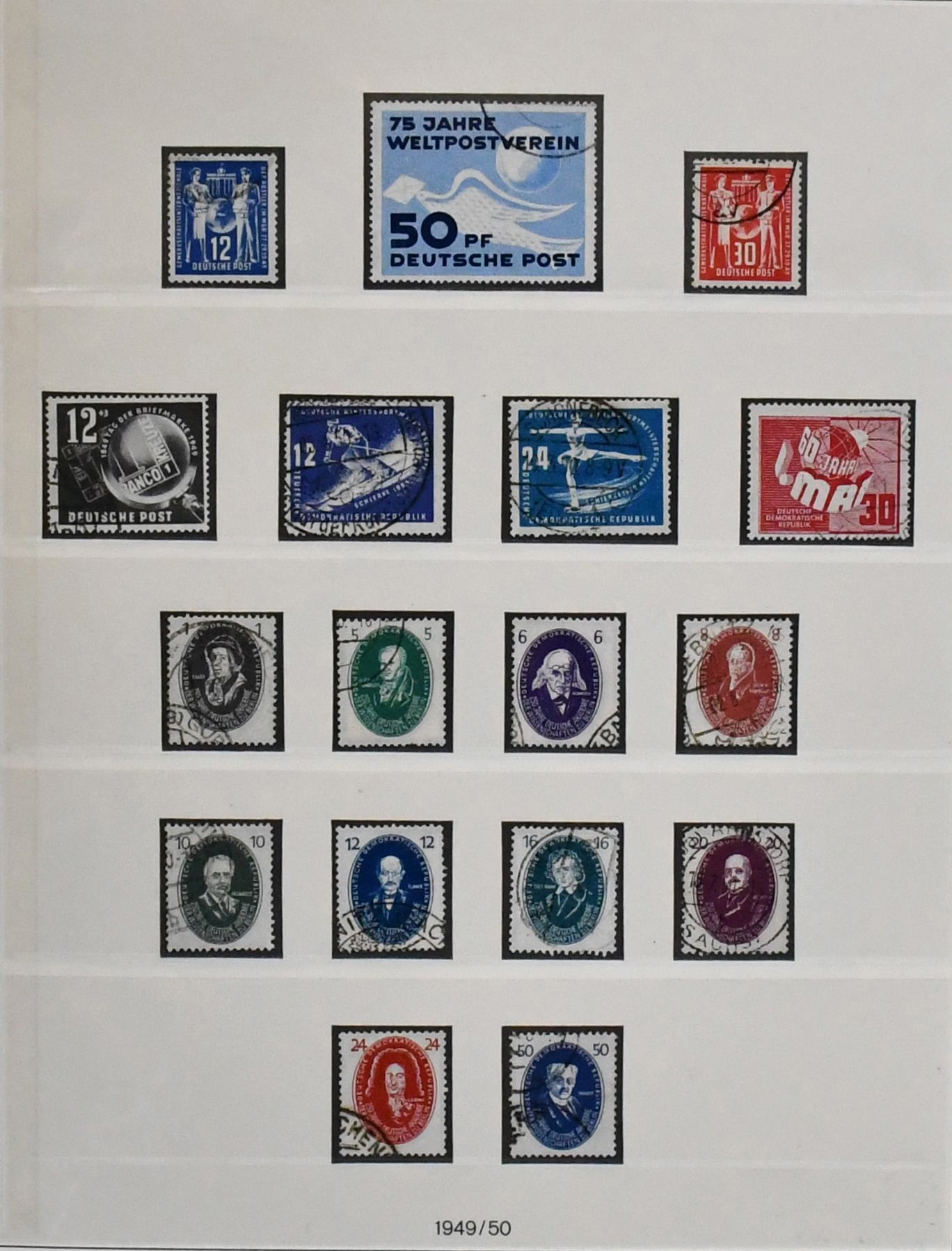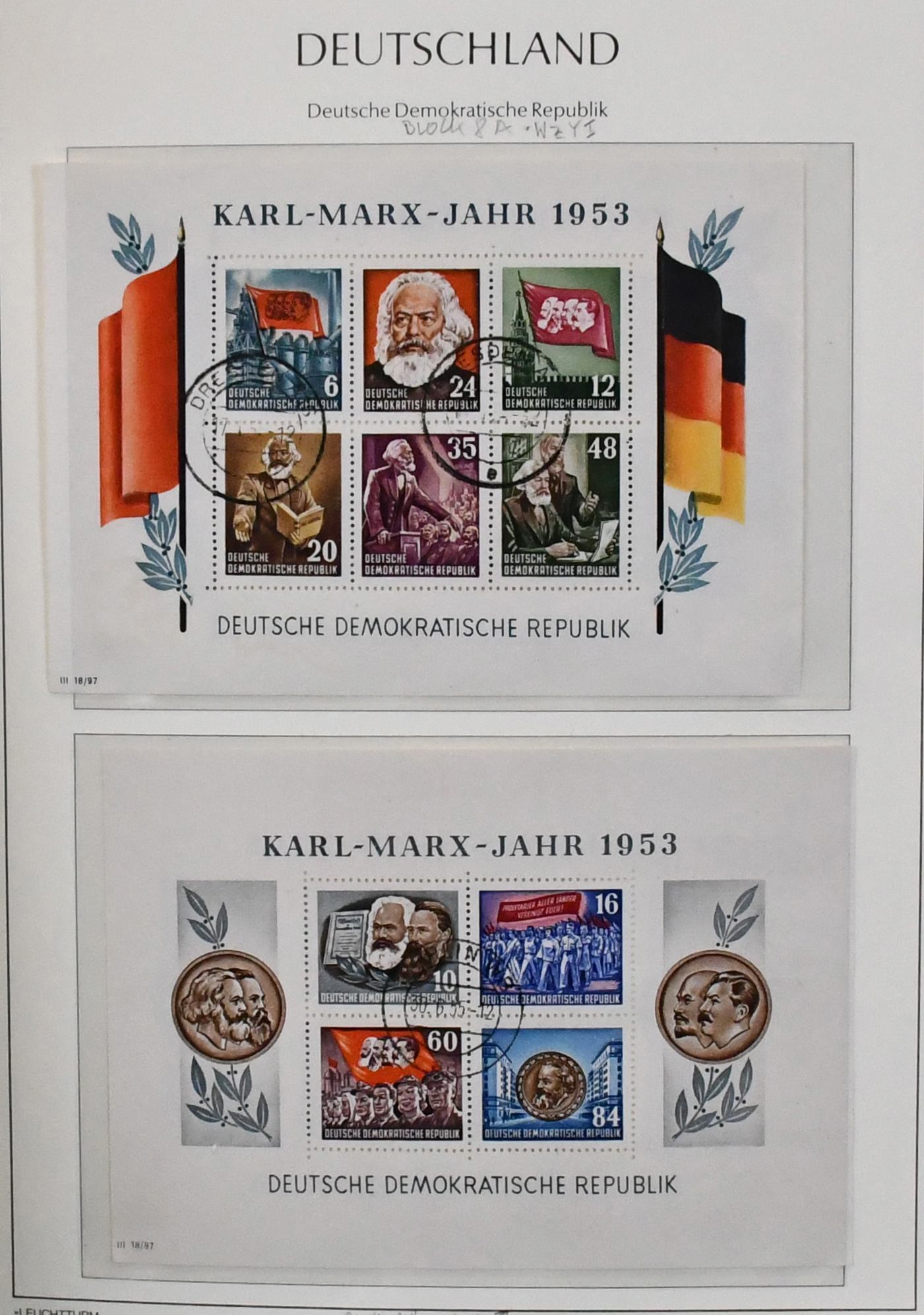 DDR, 1949/1990, gestempelte, umfangreiche Slg., bis auf einige Werte ex Nr. 327/41, in den Hauptnummern kpl. Dabei Nr. 261/70, 286/88, 80 Pfg. Persönlichkeiten auf Lackpapier, Bl. 7 auf FDC, Marx-Blöcke nur ungezähnt, Bl. 10/19 usw., in drei Schaubek-Vordruckalben. Mi., alles billigst als Gefälligkeitsentwertung gerechnet, bereits 4500,-