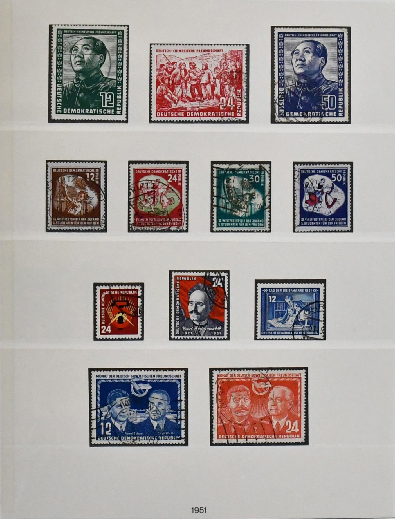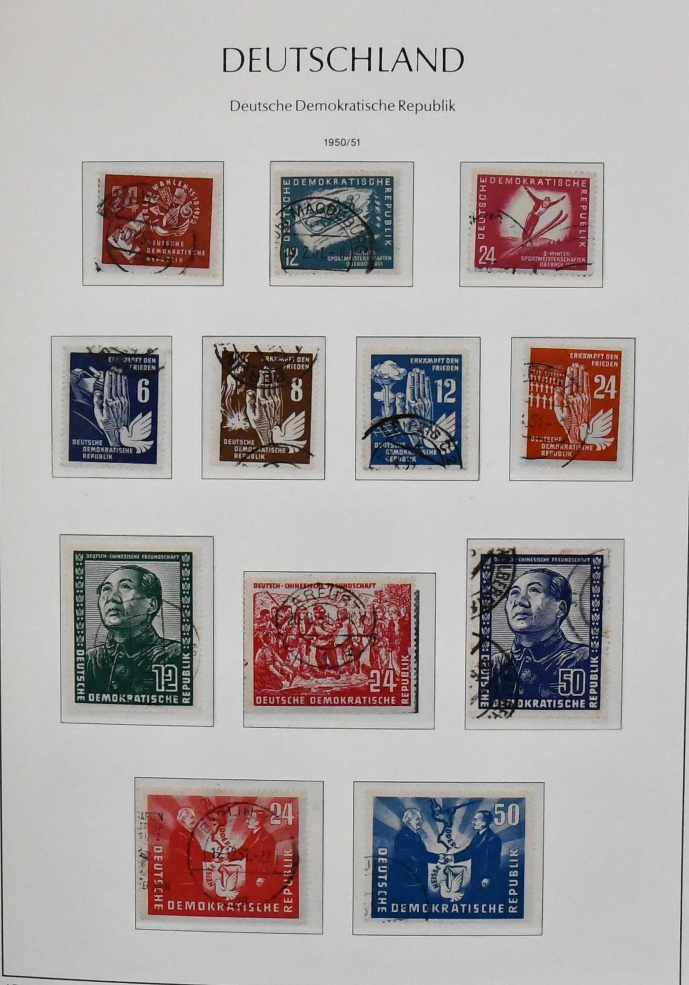 DDR, 1949/1961, lediglich ohne 25 und 84 Pfg. Köpfe II, komplette gest. Slg. im neuwertigen Lindner-T-Vordruckalbum. Dabei alle besseren Ausgaben wie u.a. Debria-Block, alle vier Marx-Blöcke, Bl. 10/15, Akademie, Chinesen usw. Mi. 2700,-