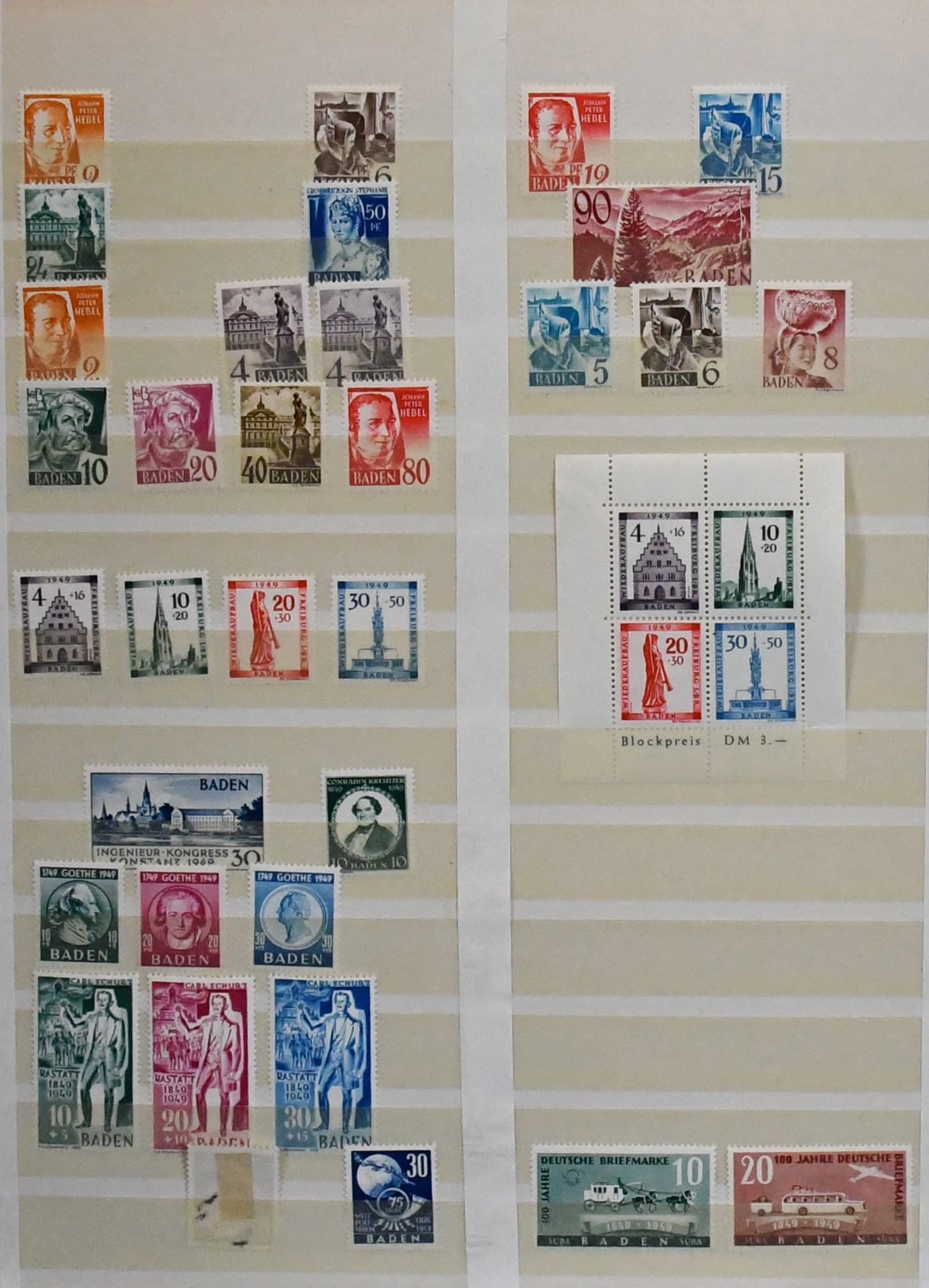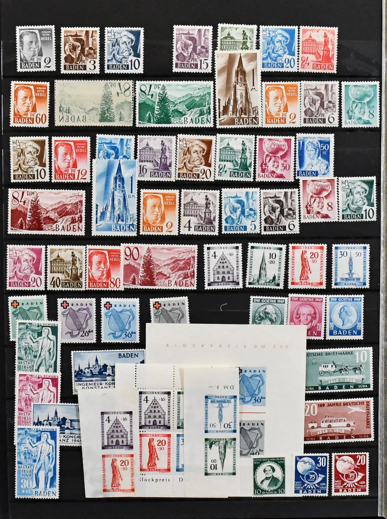 Französische Zone, 1945/49, fast nur postfrische Zusammenstellung von etwa 450 Werten aller drei Gebiete, dabei u.a. Baden Nr. 28/41A (Mi. 270,-), Bl. 1A, Nr. 46/57 (160,-), Württemberg Nr. 37/39, 44/50 usw.