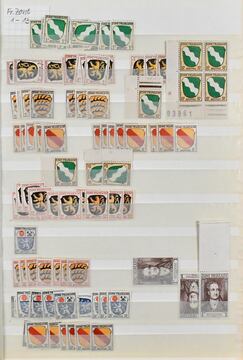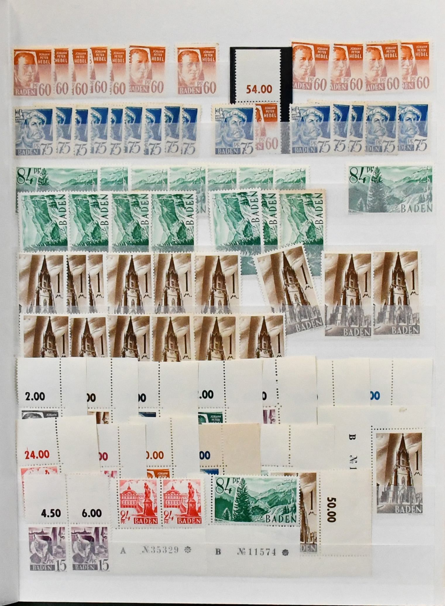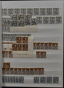 Französische Zone, Zusammenstellung von rund 1000 Werten aller Gebiete, dabei u.a. Allg. Ausgabe Nr. 5 achtmal postfr., inkl. Bogenecken-Viererblock mit Bogennummer, Baden Nr. 46, Rheinl.-Pfalz Nr. 32/41 postfr., 42/52 kpl., Württemberg Nr. 28/37 usw.