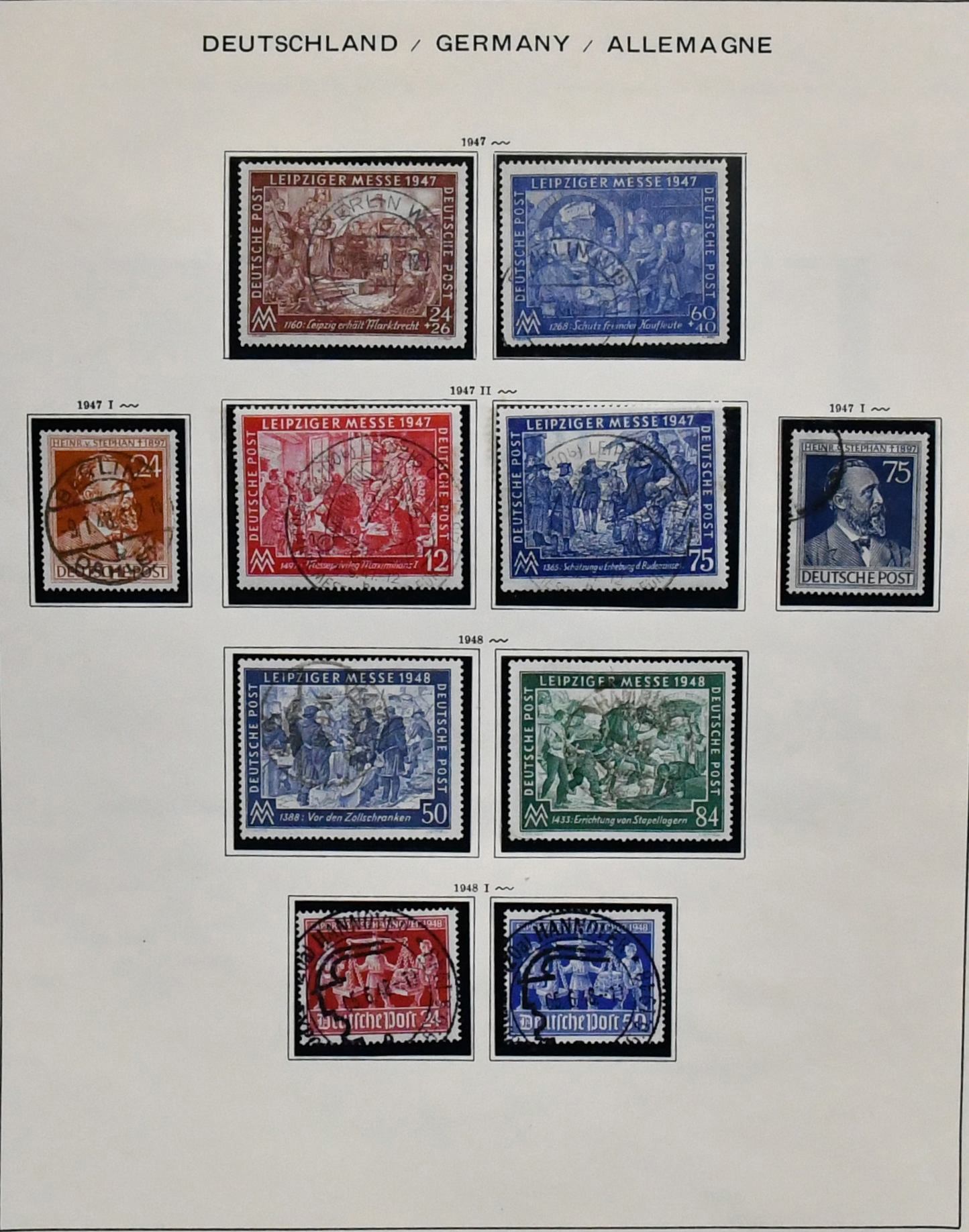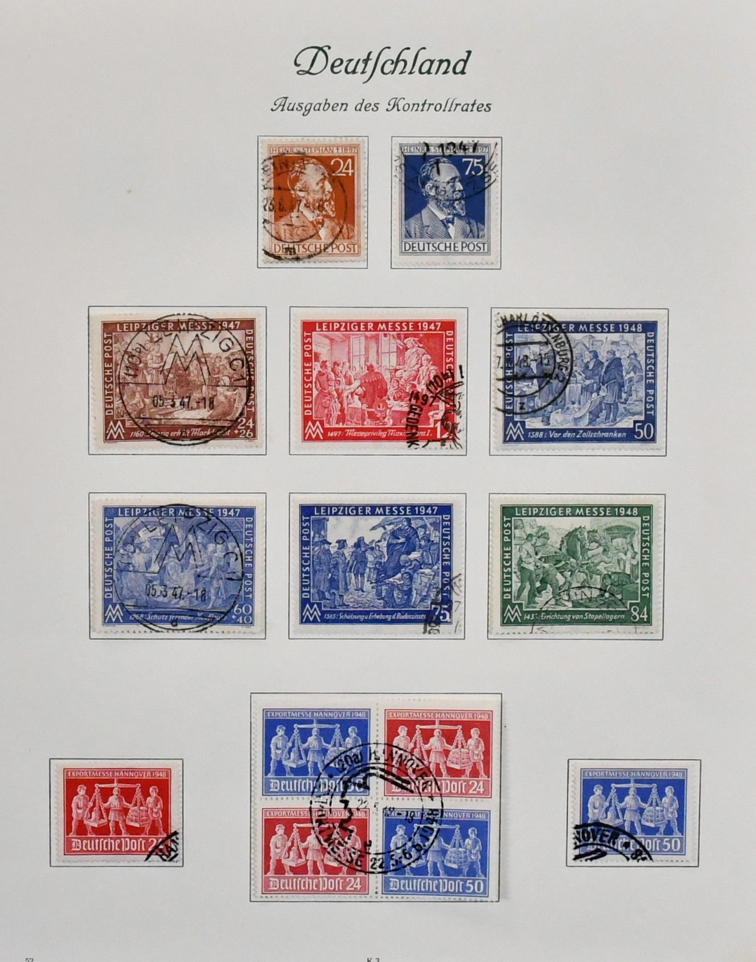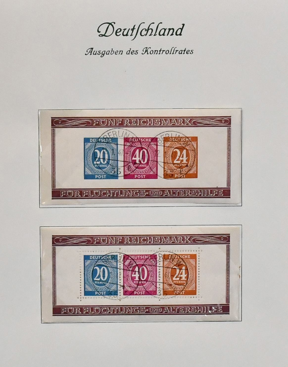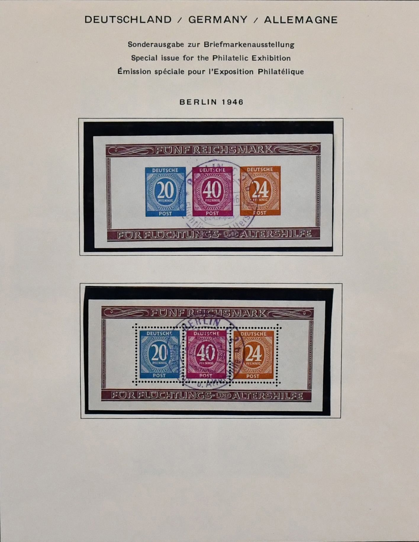 Gemeinschaftsausgabe, 1945/49, gest. kpl. Slg. inkl. Bl. 12A/B mit SST (Mi. 420,-), VZd1 auf Gedenkblatt usw., auf Vordrucken