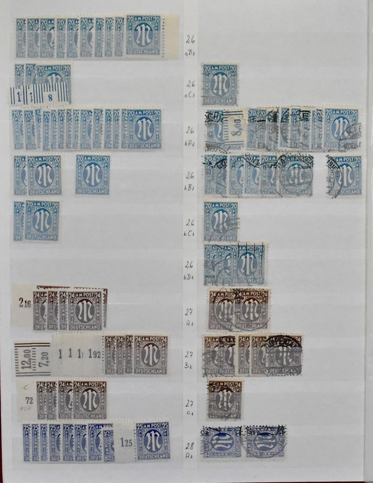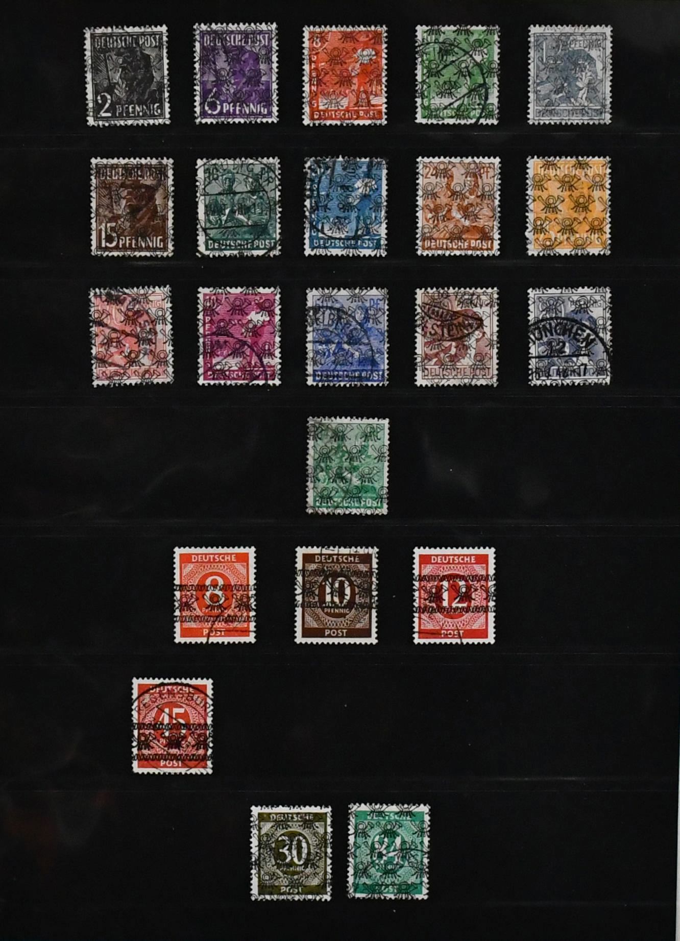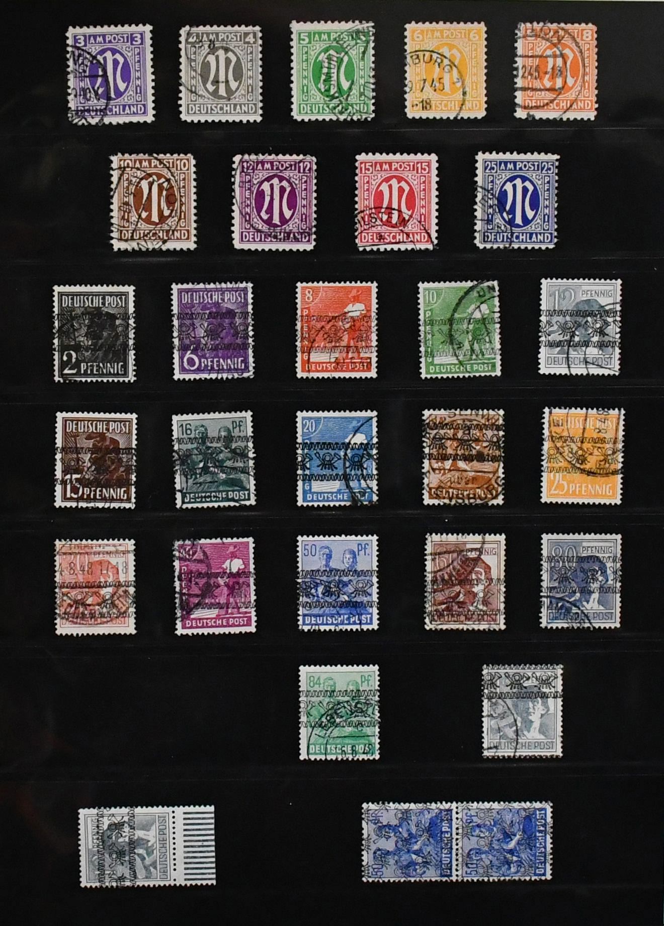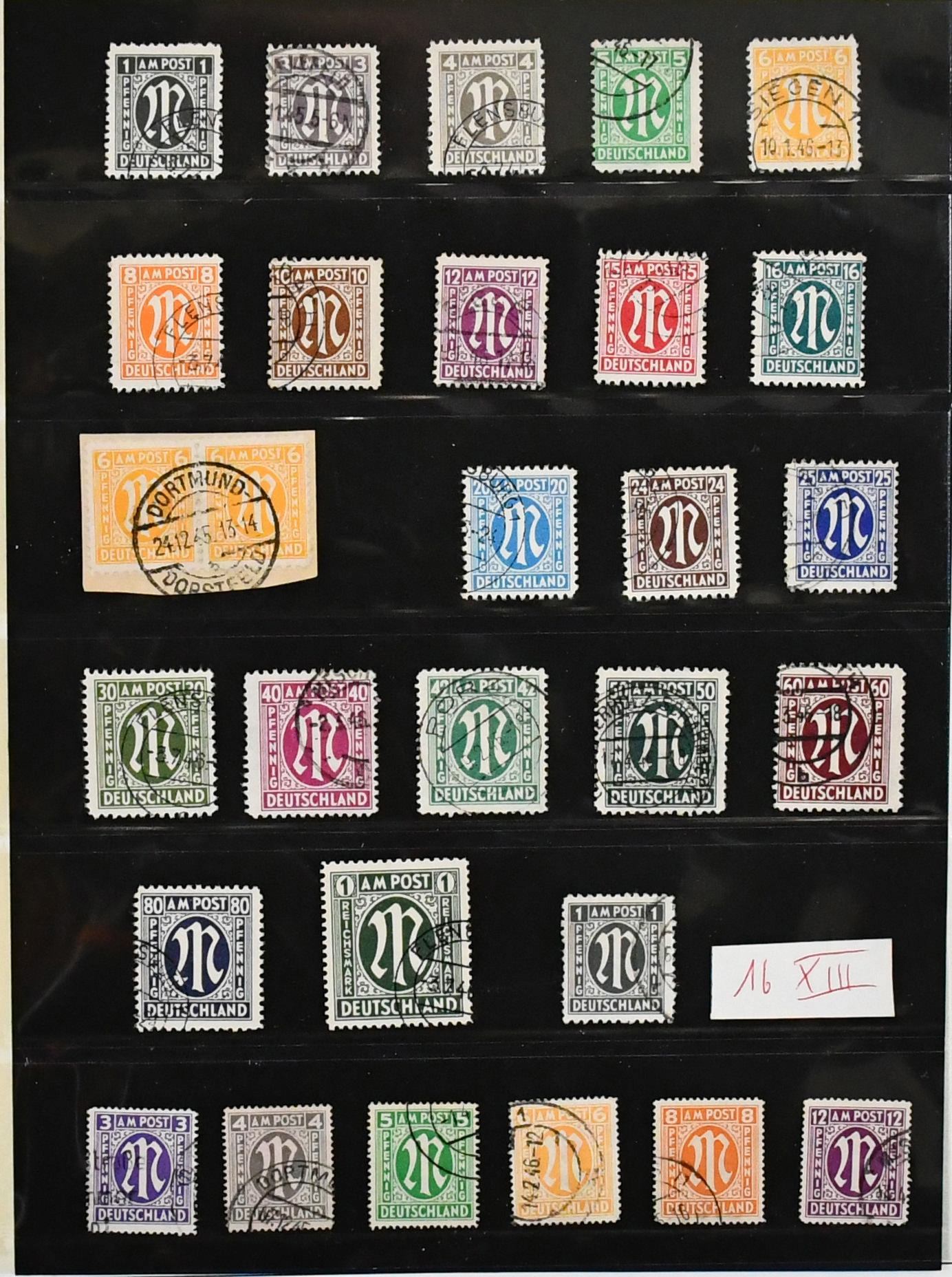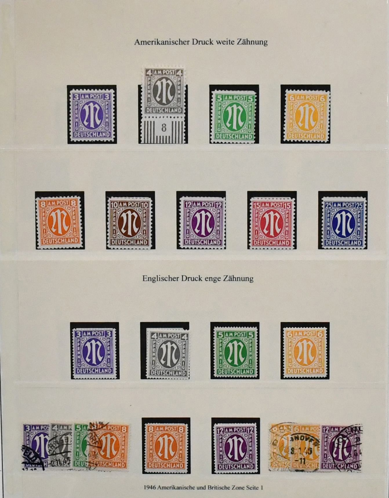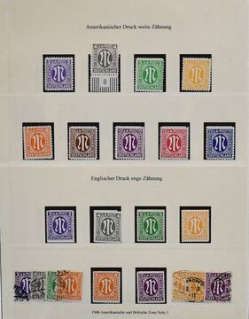 Bizone, 1945/49, gest. Slg. mit AM-Post Nr. 1/35 (Nr. 34/35 unberechnet, da ungeprüft), Nr. 53/55I, gepr. Schlegel BPP (Mi. 162,-), Bauten eg/wg und beiden Typen der Mark-Werte kpl., Nr. 101/10, Bl. 1 mit Ortsstempel (Mi. 350,-) usw.