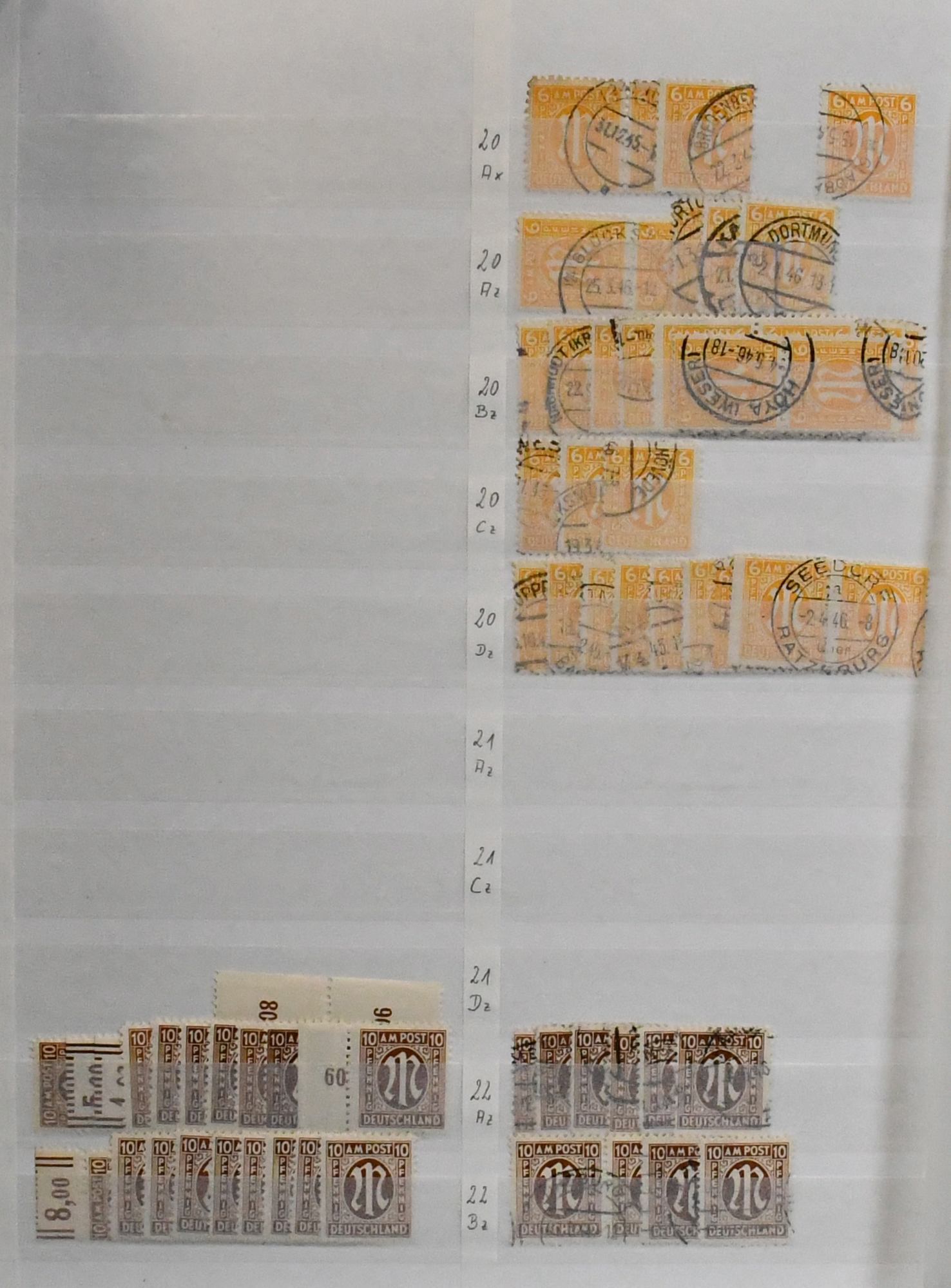 Bizone, 1945/1949, gest. Slg. ab AM-Post, mit Nr. 36/51I/II (Mi. 400,-), inkl. Nr. 49I, Bauten eg, wg und beiden Typen der Mark-Werte, Nr. 101/10, Bl. 1 mit Ortsstempel (Mi. 350,-), Einzelwerte aus Bl. 1 mit anhängenden Blockrändern inkl. 10 Pfg. per zwei (Mi. 240,-), Nr. 101/10 usw.