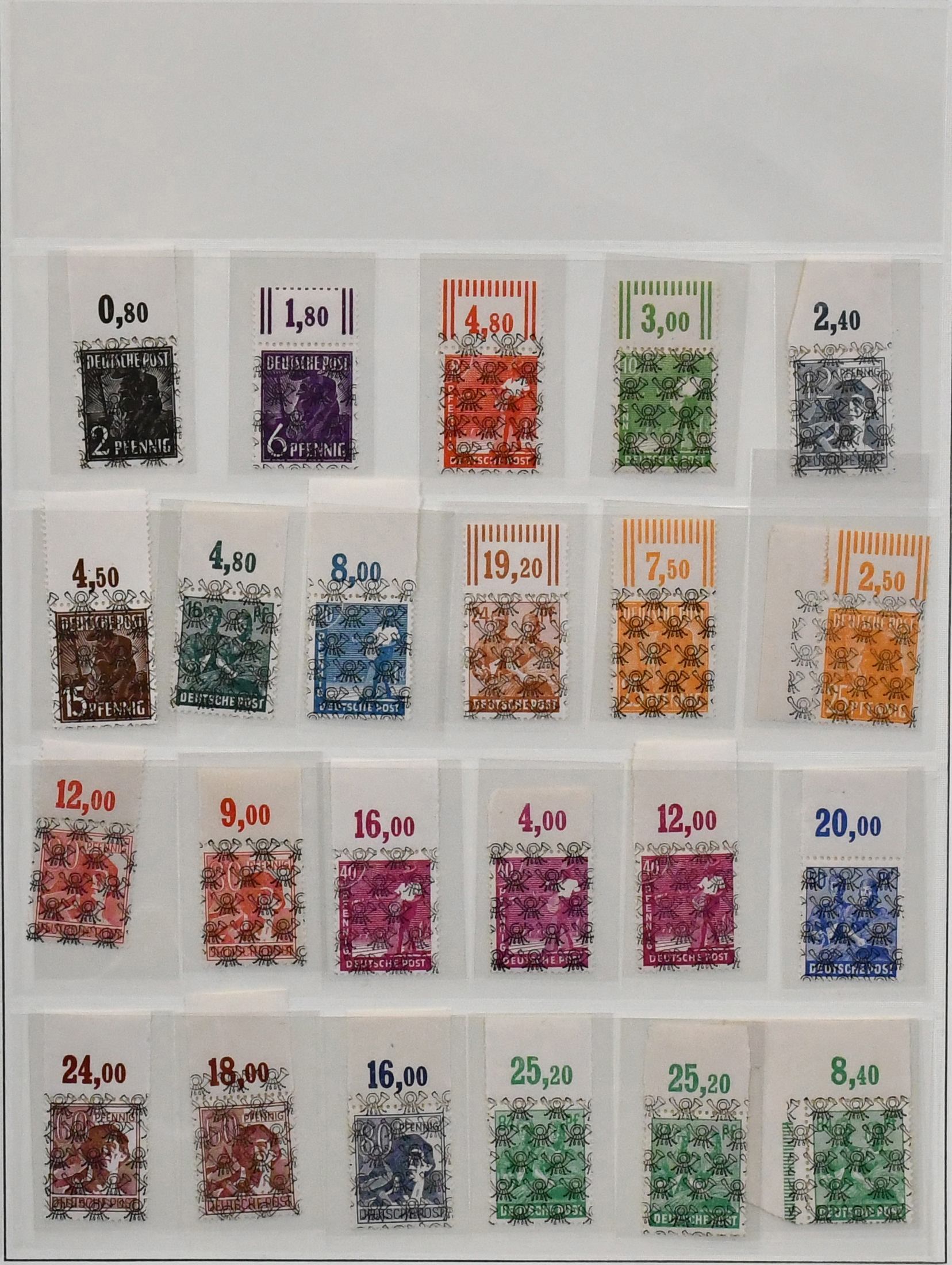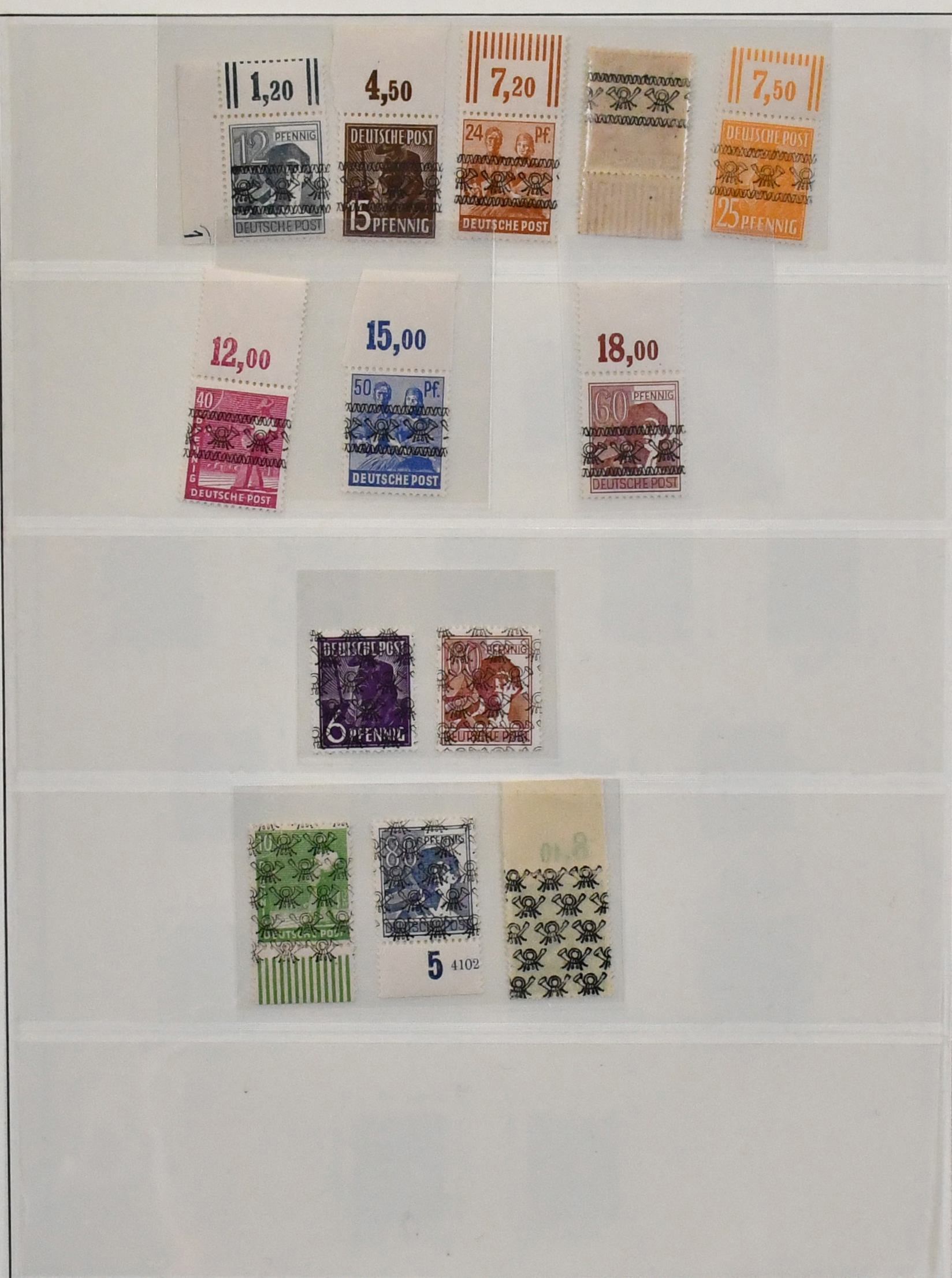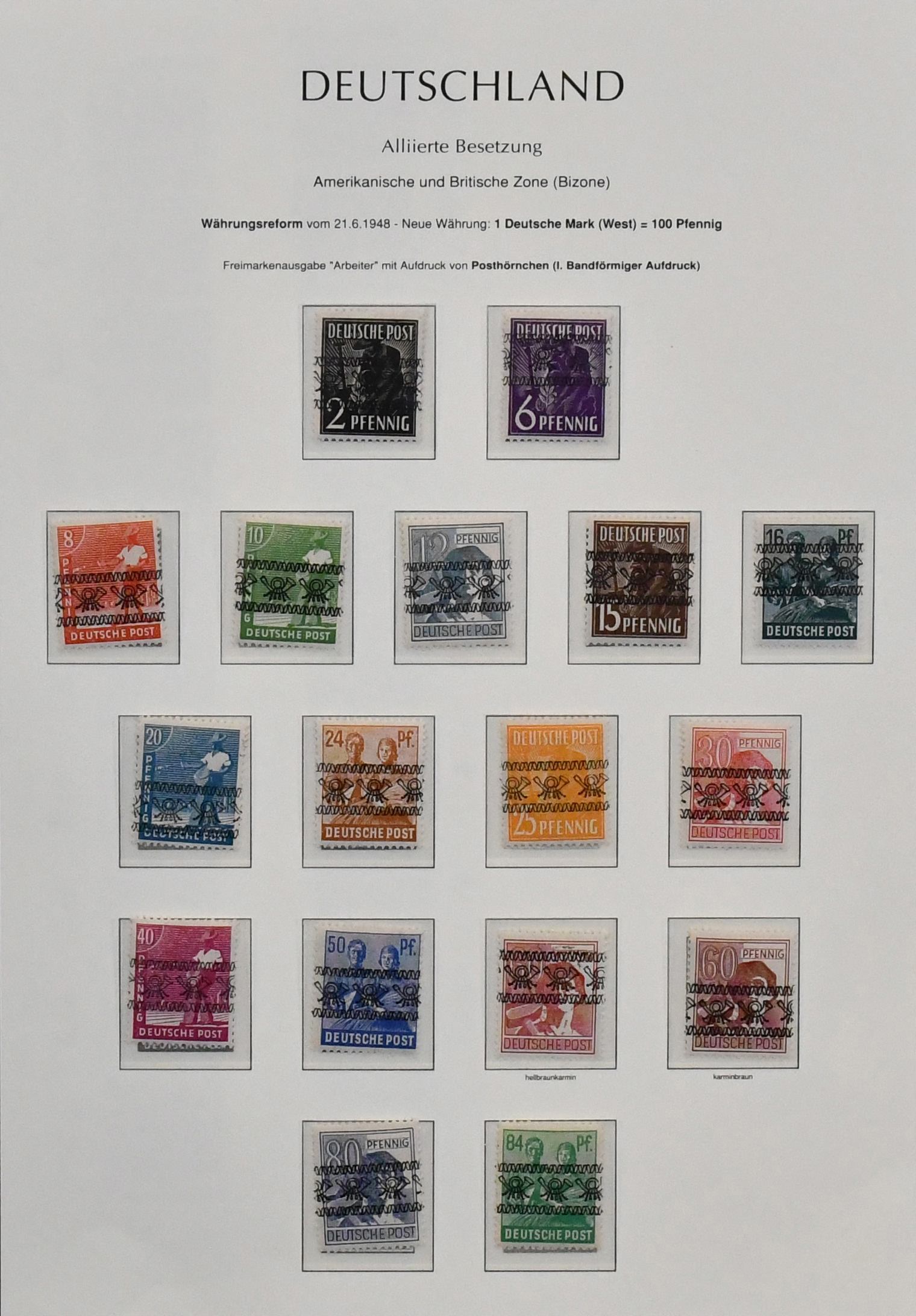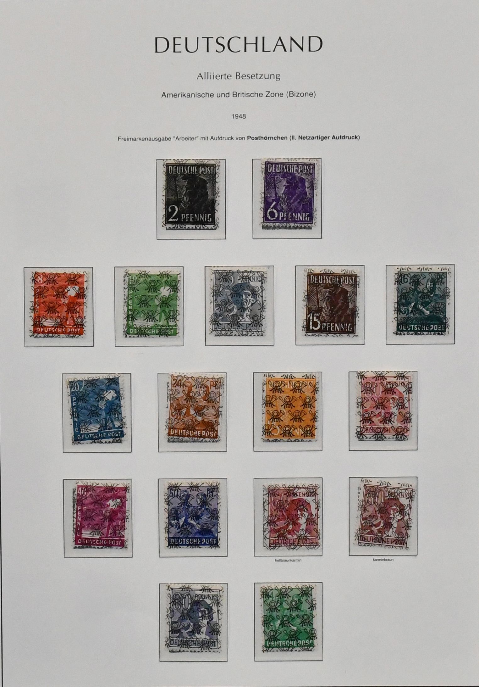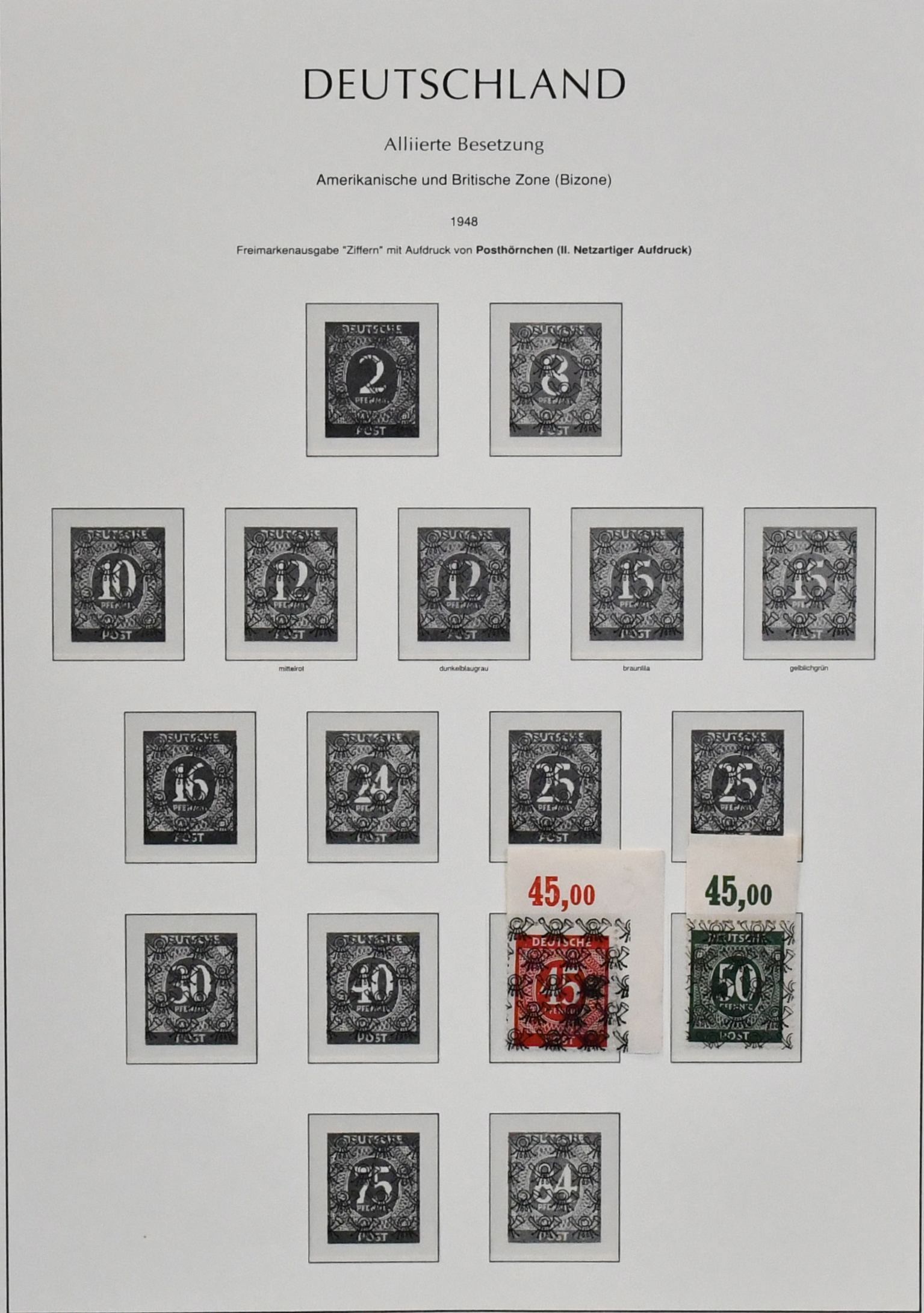 Bizone, Band-/Netzaufdrucke auf Arbeiter-Serie, postfrischer, spezialisierter Sammlungsbestand auf Blättern, neben den Standardserien auch Besonderheiten mit Nr. 49Ia, gepr. Schlegel, 36I Unterrandstreifen mit HAN, gute Oberränder Platte/Walze, z.B. Nr. 41IIdgz, 46IIdgz, 40I Platte Ecke 1 mit DZ "positive 1" etc.
