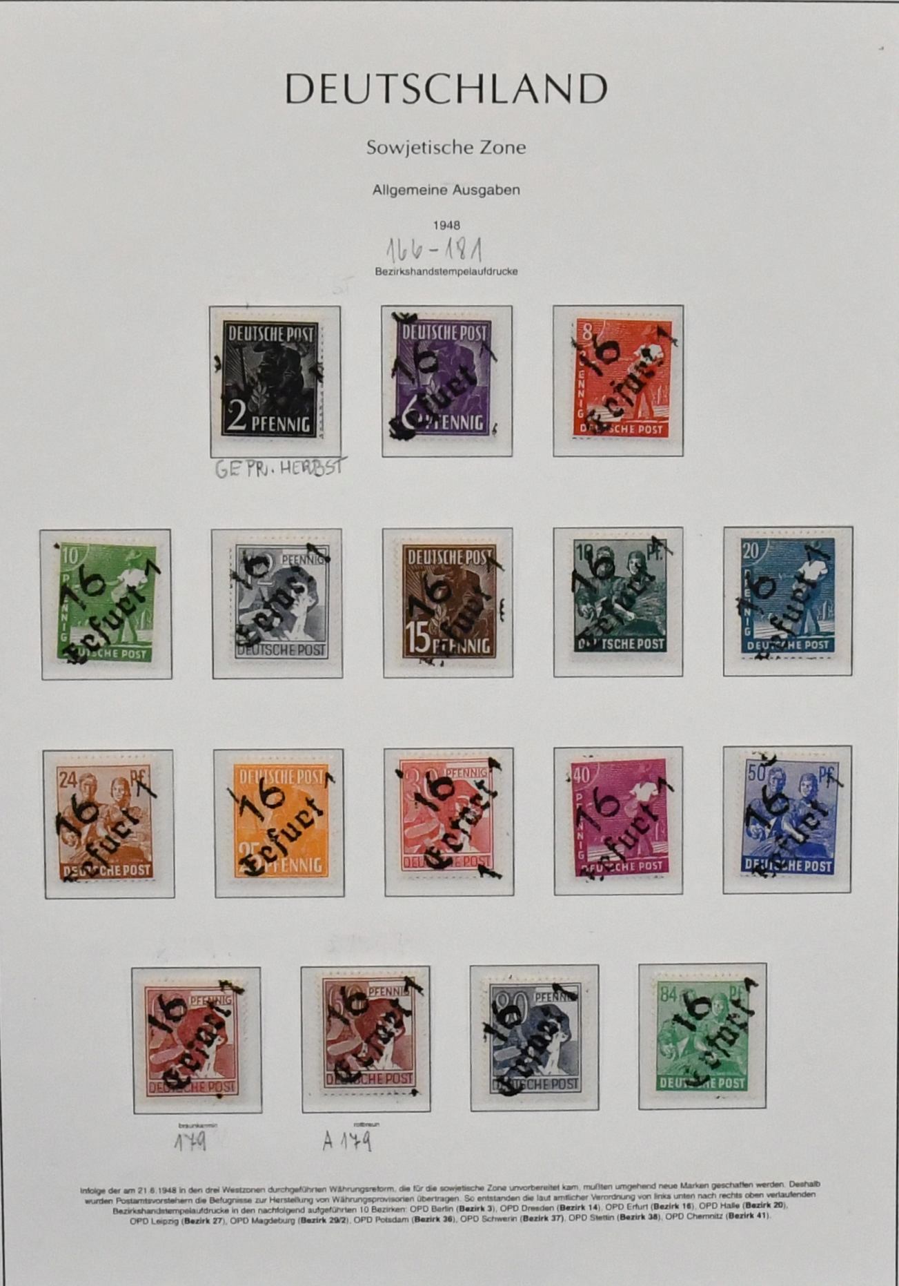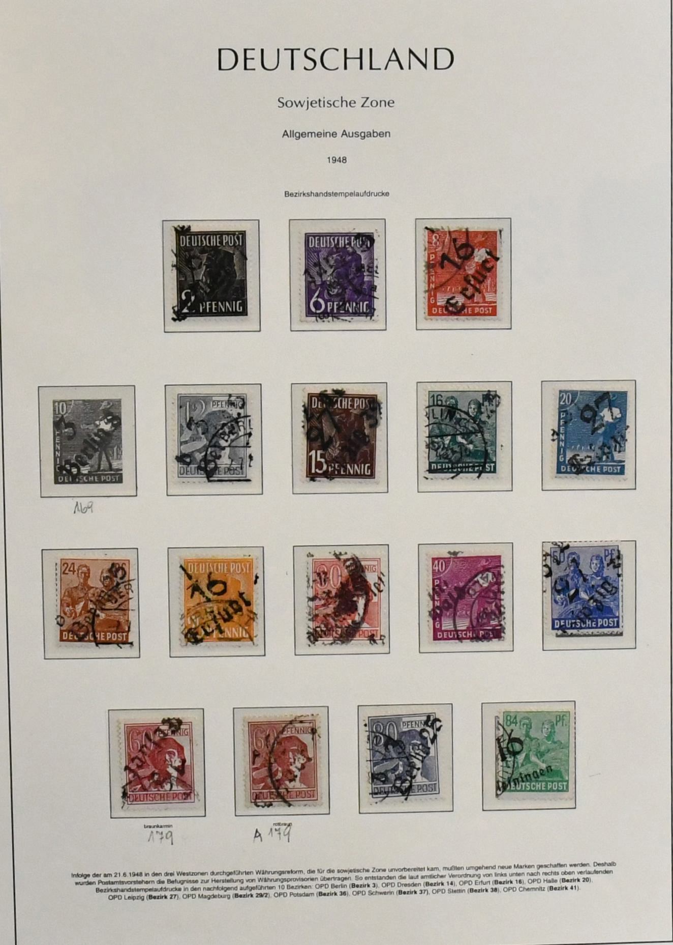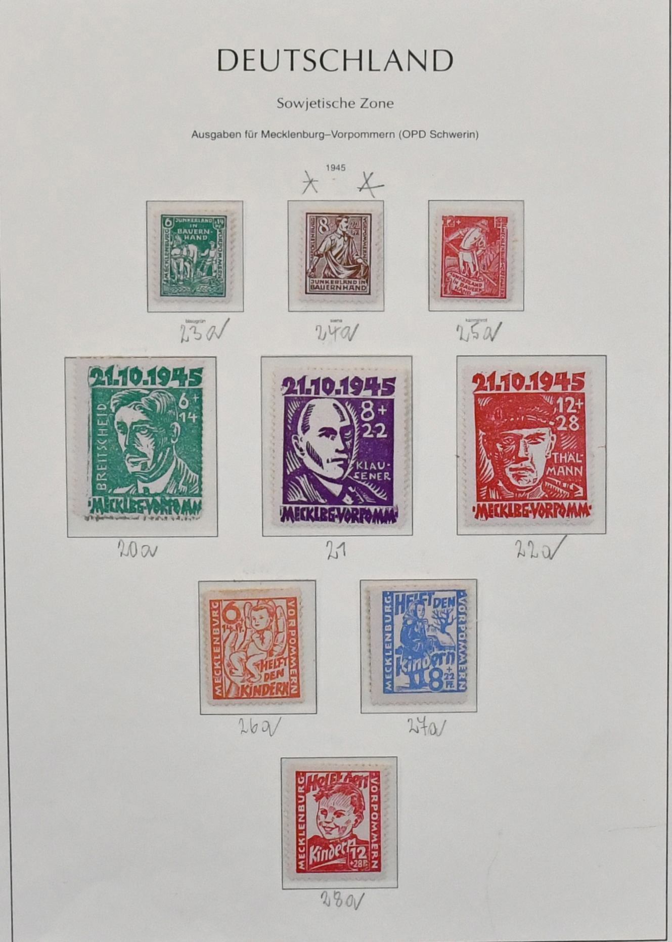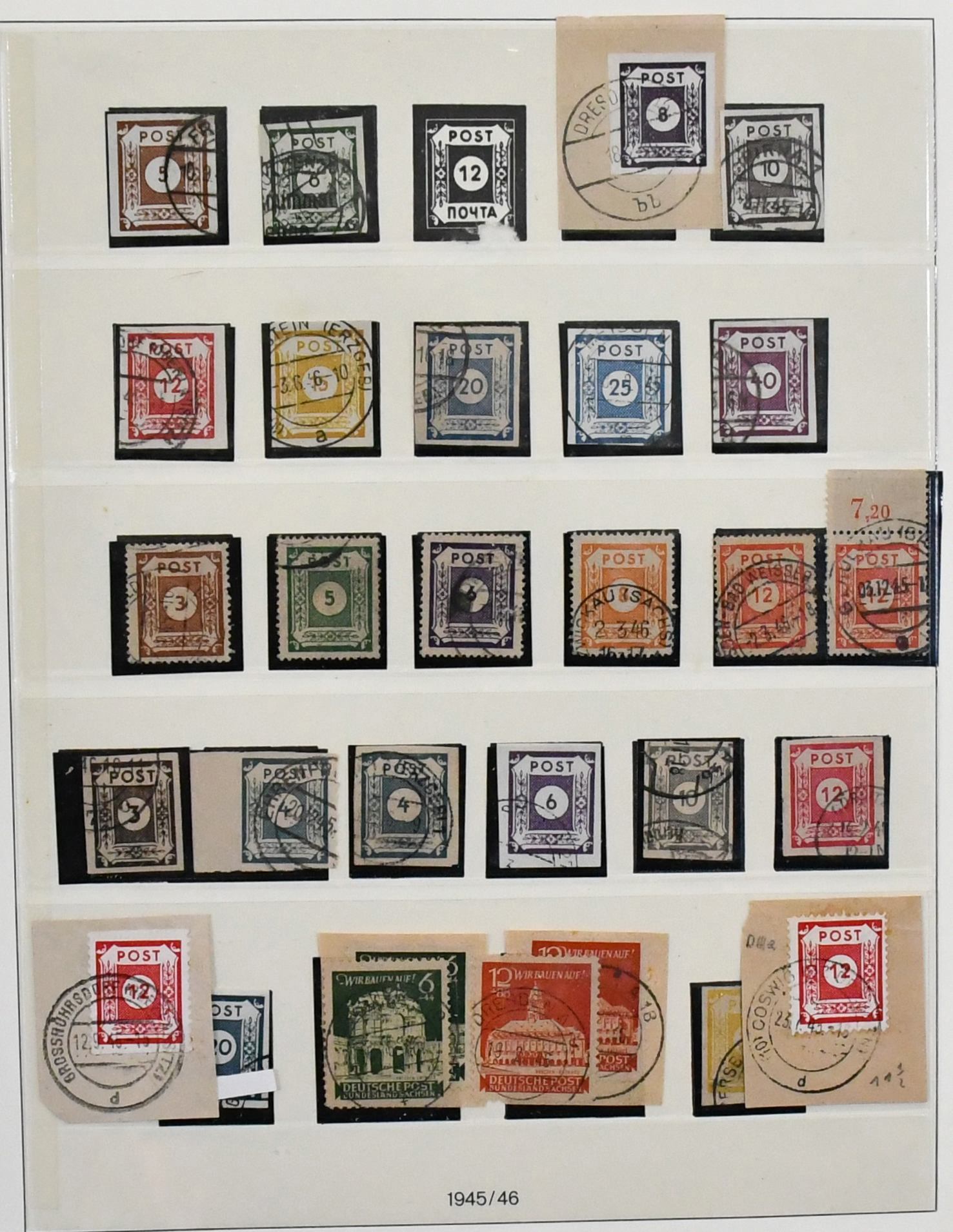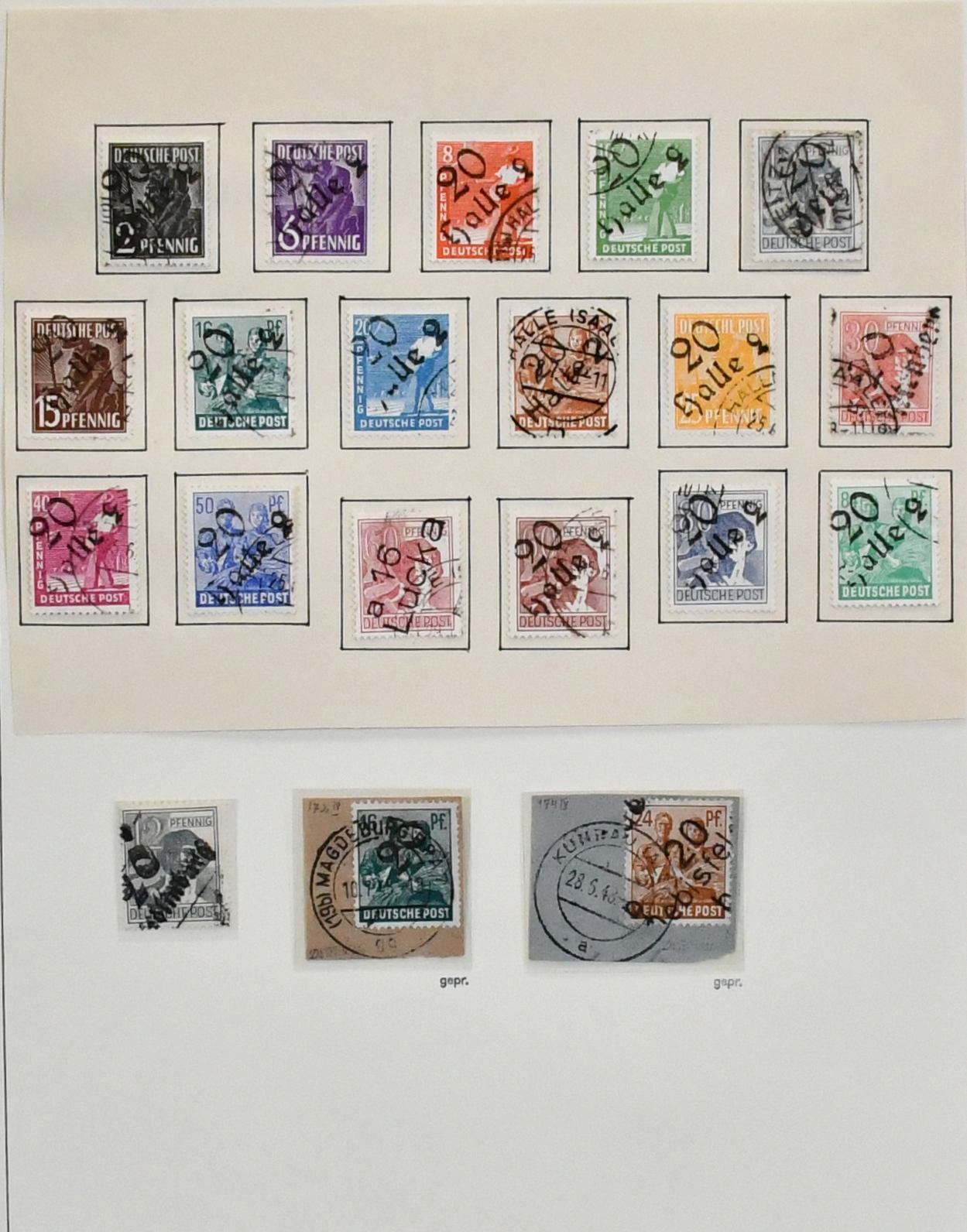 SBZ, hochwertige Sammlung im Vordruckalbum, über weite Strecken postfr. und gest. parallel geführt (sehr wenig ungebraucht) und mit vielen gepr. Stücken, dabei u.a. Nr. 8y gest. (gepr.), 20-22, 23-25a/b, 26-28, je gest., "Potschta" postfr. (Mi. 600,-), Bl. 1, Bl. 4 (gepr.), je postfr., Bl. 5 gest. (gepr.), Handstempelaufdrucke gest. mit Nr. 179 u. 179A, Bl. 6 gest. etc., sauberes Objekt mit hohem KW