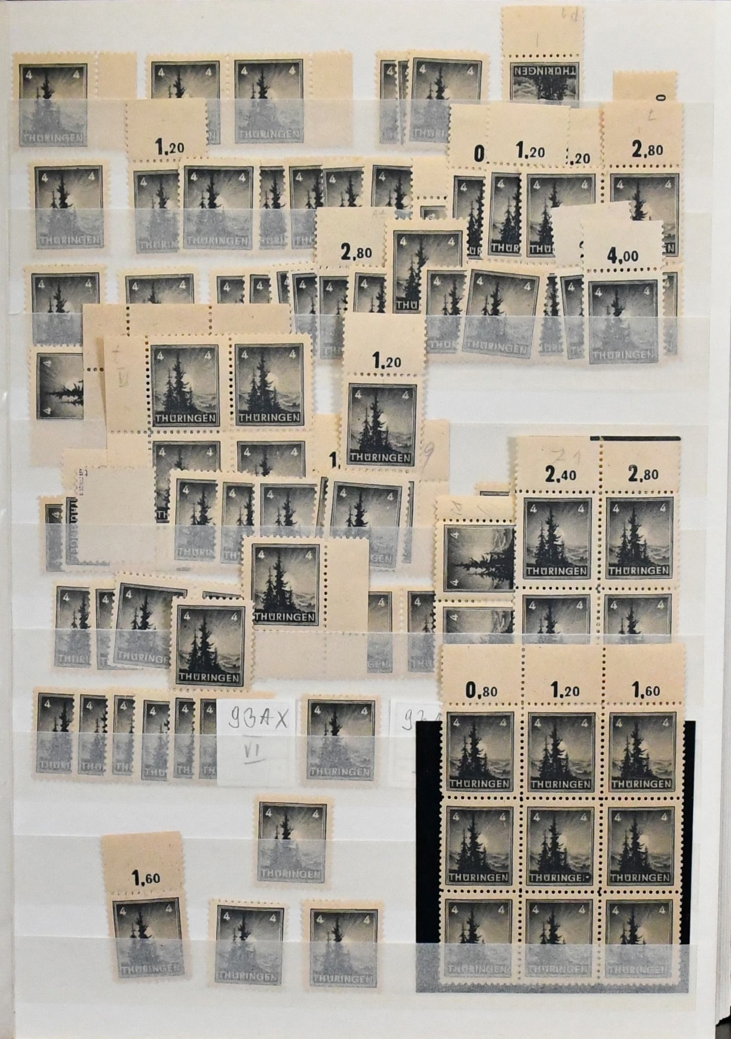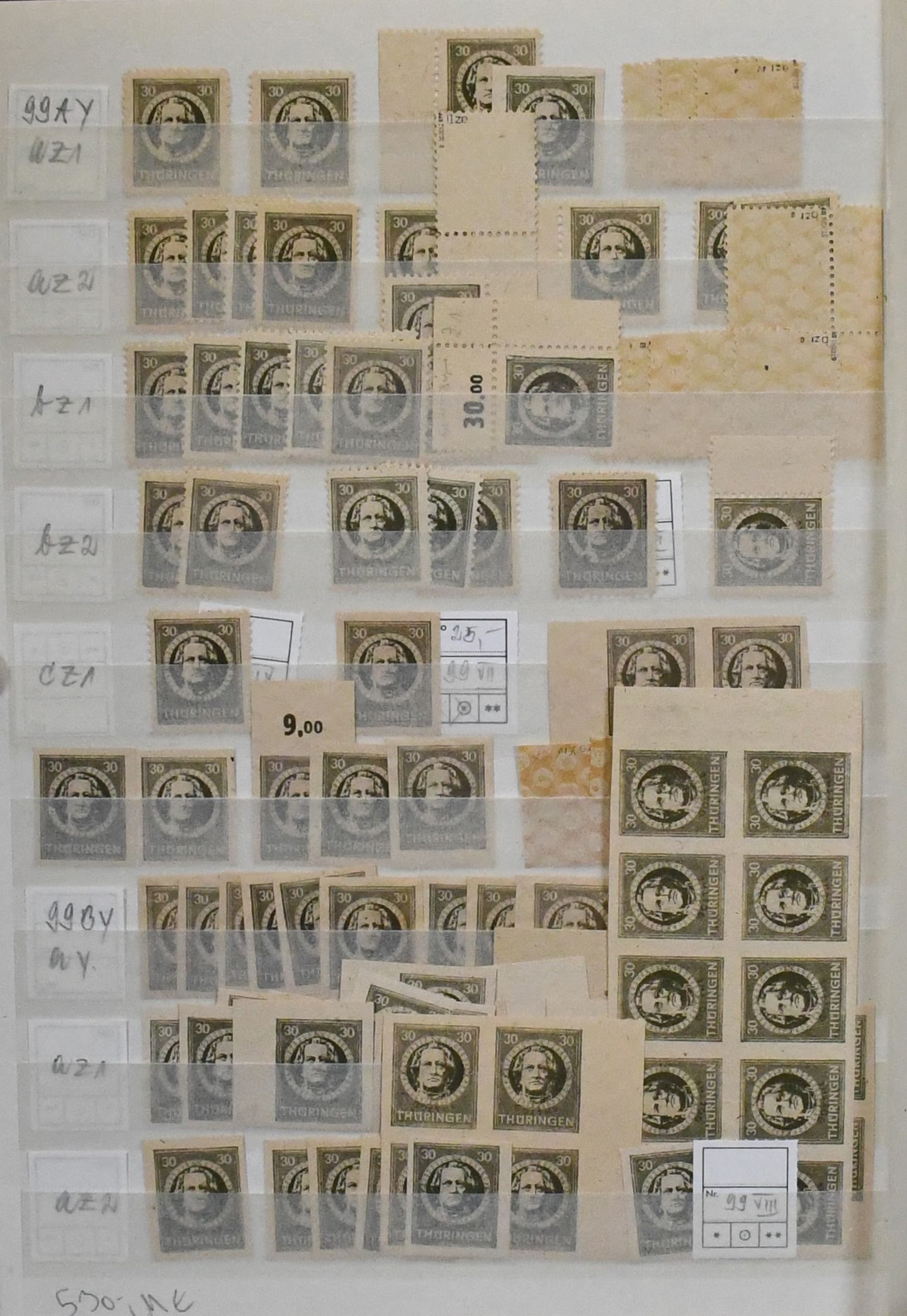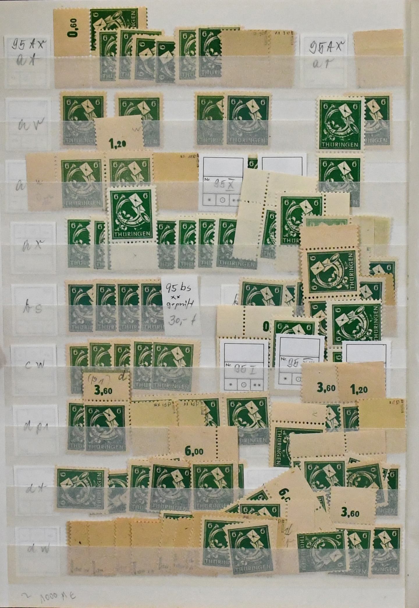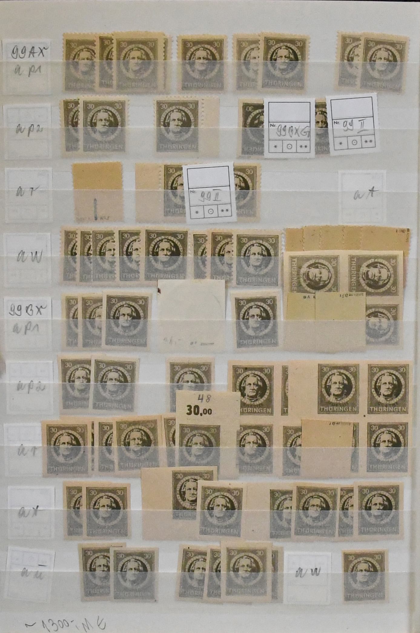 Thüringen, Nr. 92/99, postfrischer Bestand von knapp 3000 Werten, teils hochspezialisiert mit Papiersorten, Farben, Plattenfehlern usw., häufig geprüft, mit Werten bis etwa 200,- Michel pro Stück, z.T. noch nicht bestimmt. Der Michelwert beträgt mindestens 8000,-, wobei bessere Werte nur gerechnet wurden, wenn diese geprüft sind, somit chancenreiches Los!