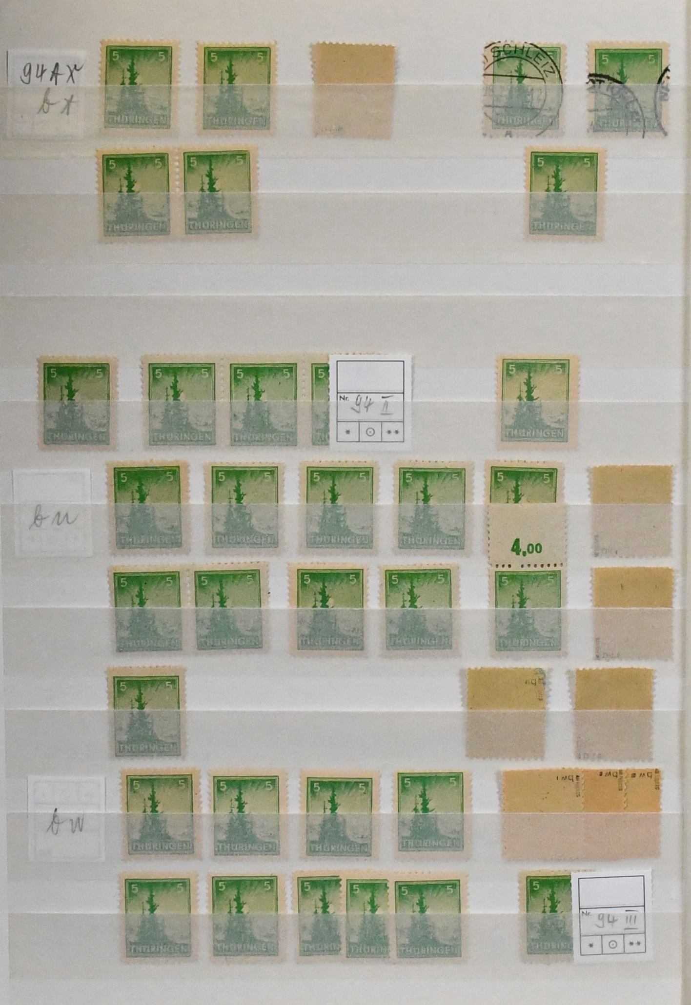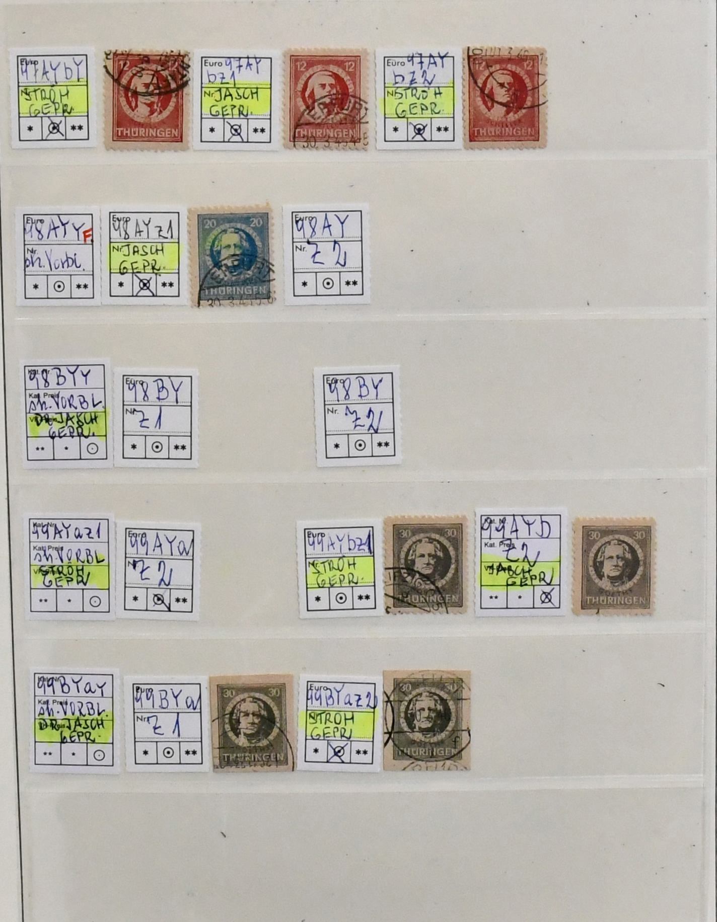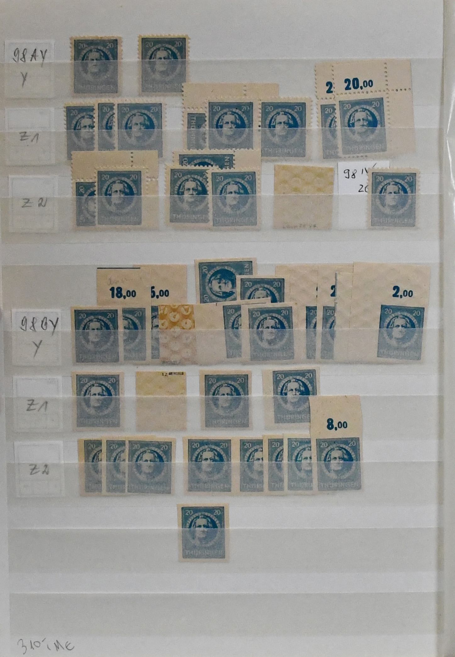 Thüringen, Nr. 92/99, postfrischer Bestand von knapp 3000 Werten, teils hochspezialisiert mit Papiersorten, Farben, Plattenfehlern usw., häufig geprüft, mit Werten bis etwa 200,- Michel pro Stück, z.T. noch nicht bestimmt. Der Michelwert beträgt mindestens 8000,-, wobei bessere Werte nur gerechnet wurden, wenn diese geprüft sind, somit chancenreiches Los!