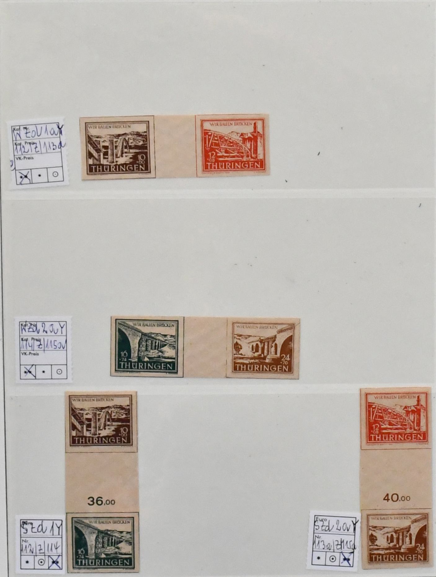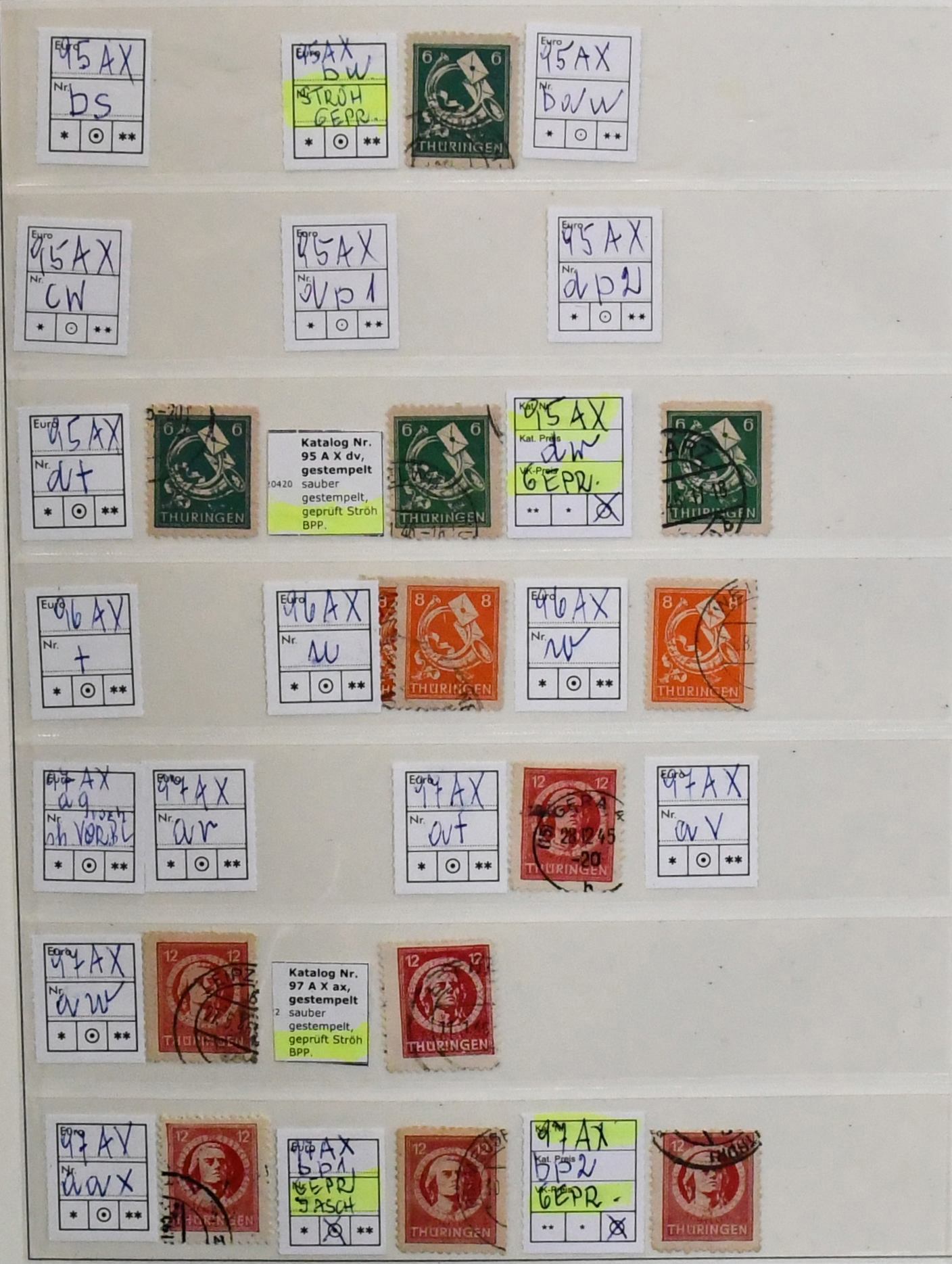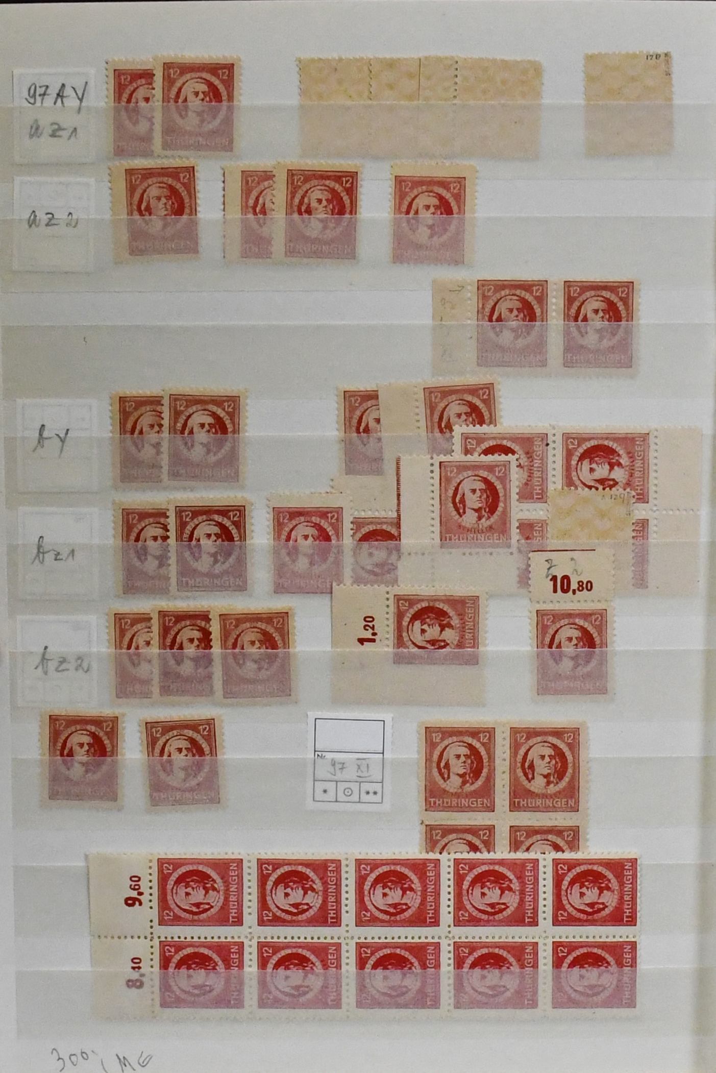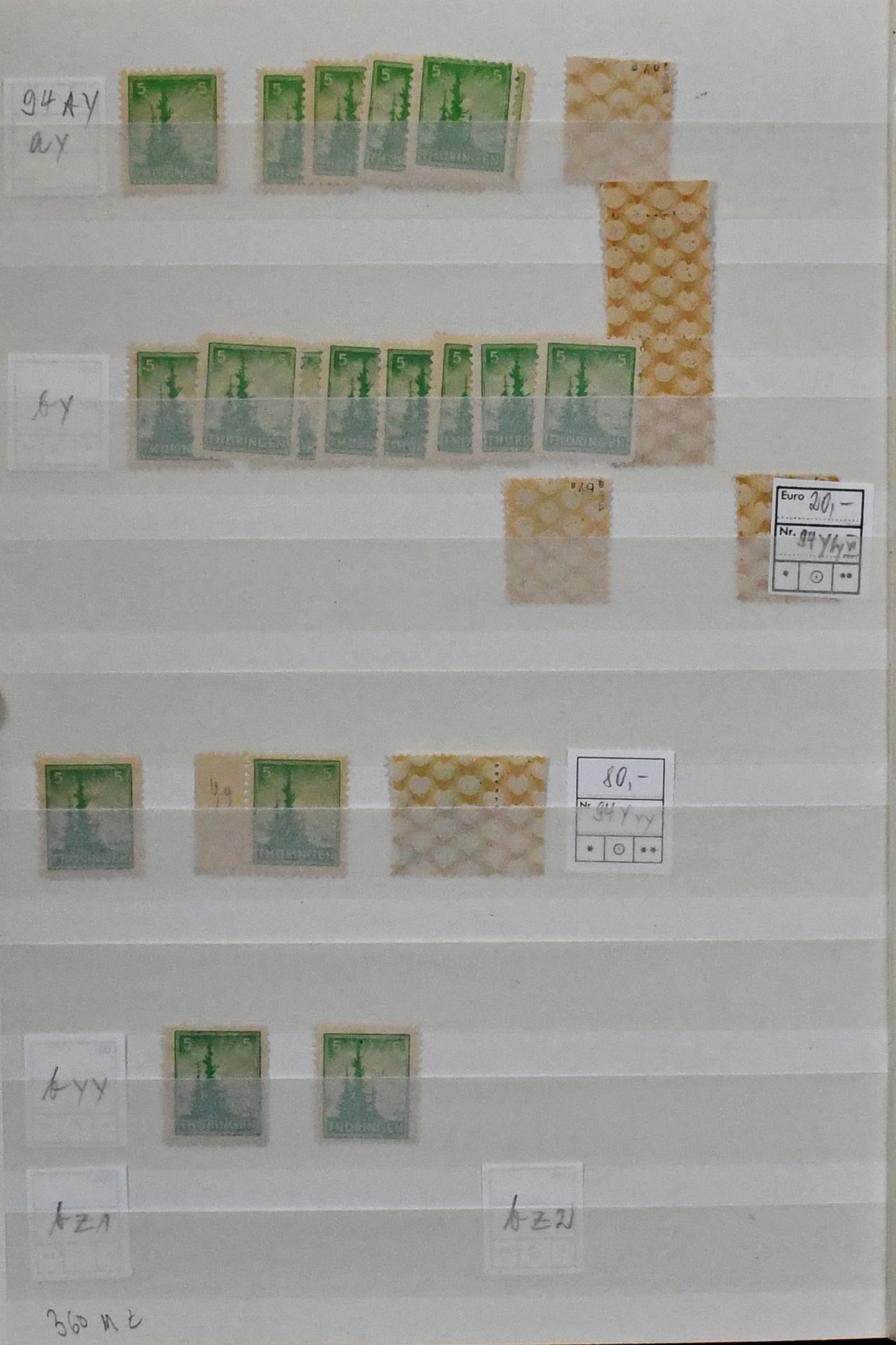 Thüringen, Nr. 92/99, postfrischer Bestand von knapp 3000 Werten, teils hochspezialisiert mit Papiersorten, Farben, Plattenfehlern usw., häufig geprüft, mit Werten bis etwa 200,- Michel pro Stück, z.T. noch nicht bestimmt. Der Michelwert beträgt mindestens 8000,-, wobei bessere Werte nur gerechnet wurden, wenn diese geprüft sind, somit chancenreiches Los!