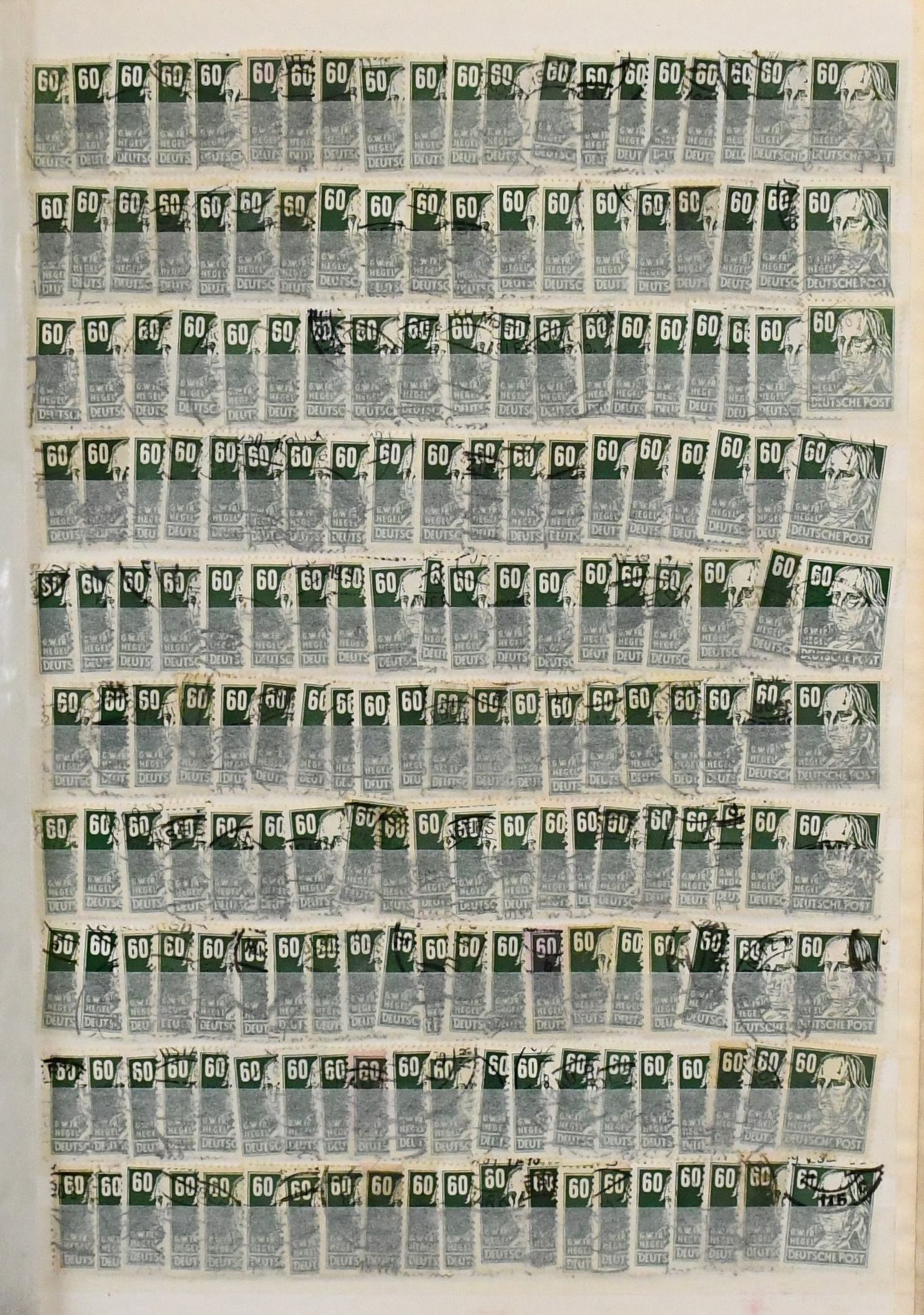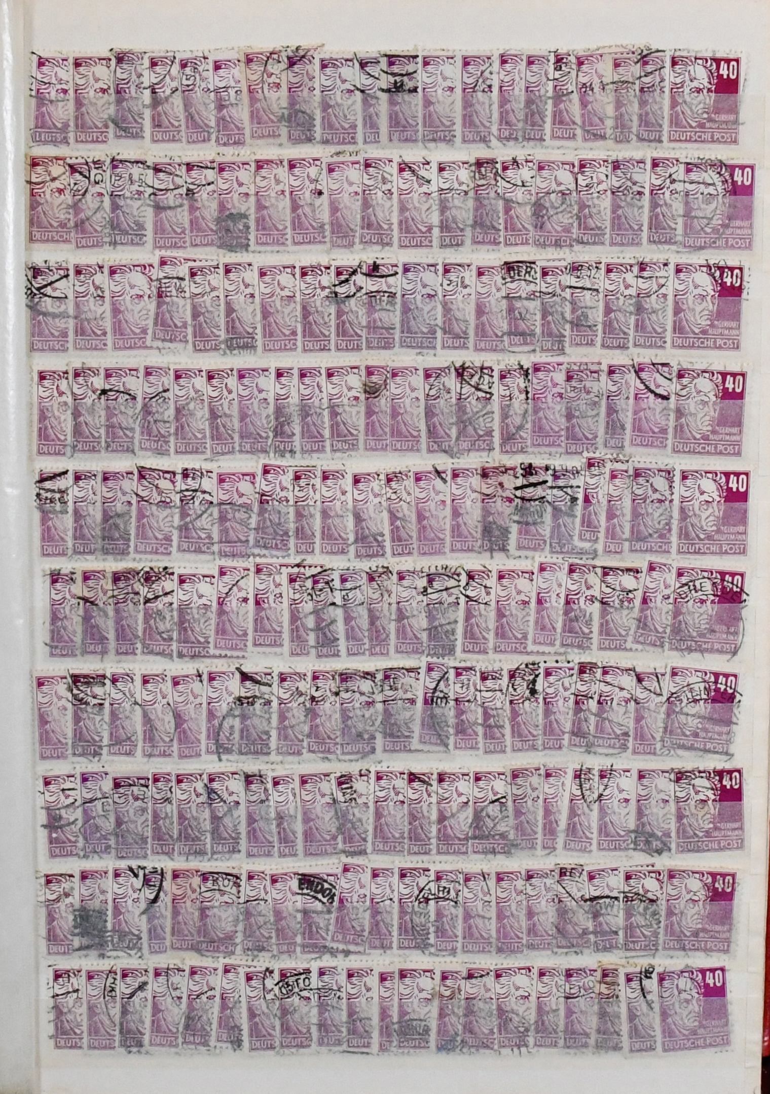 SBZ, Köpfe I (evtl. auch Köpfe II enthalten), Partie von etwa 14.000 gestempelten Werten, sortenreich, mit allen Wertstufen ex 2 bis 84 Pfg., je vielfach, aus altem Kellerfund in zwei dicken E-Büchern (Alben und Inhalt unten mit Lagerschäden und entsprechend kalkuliert). Der Michelwert, alles billigst gerechnet, beträgt alleine rund 28.000,-. Fundgrube!!