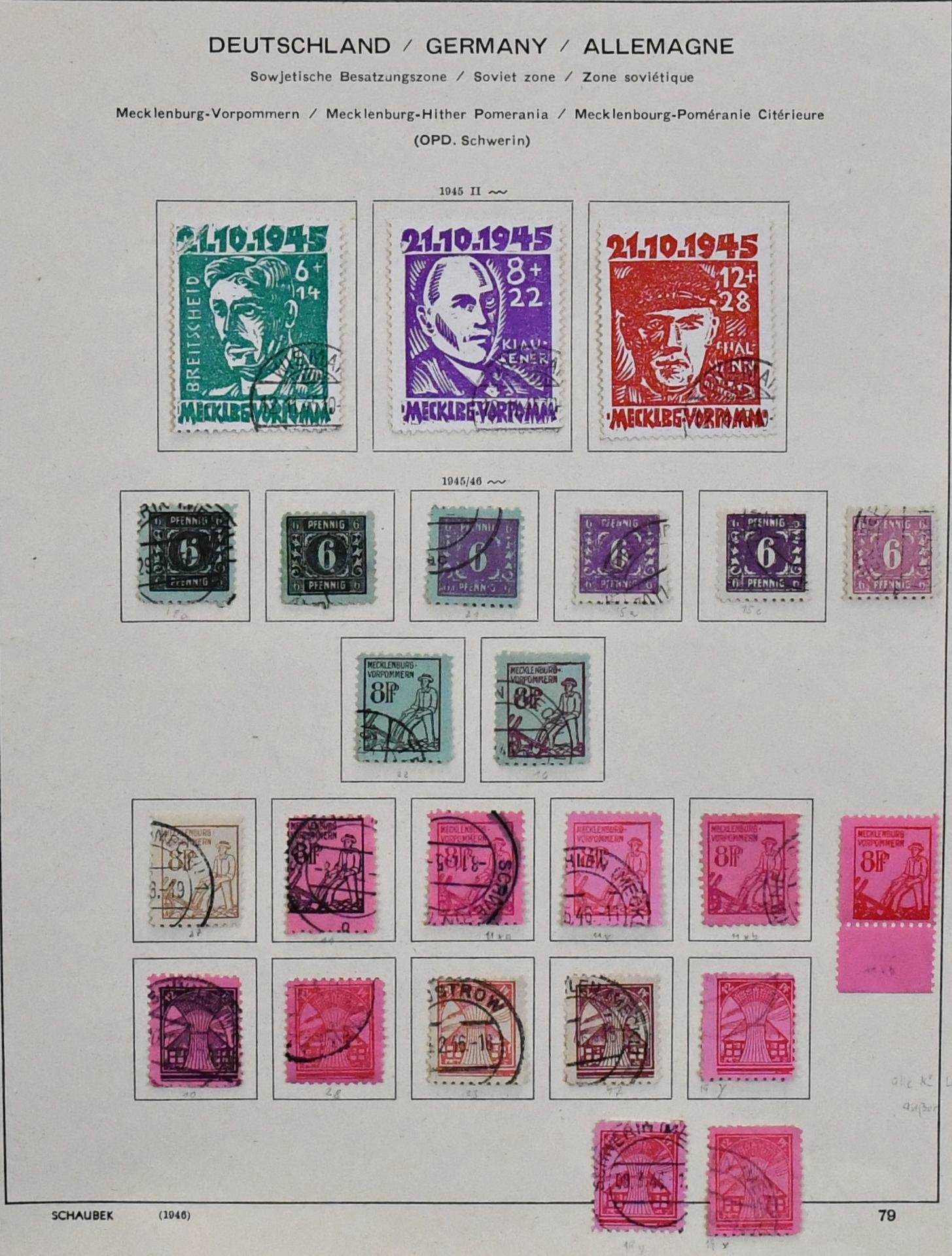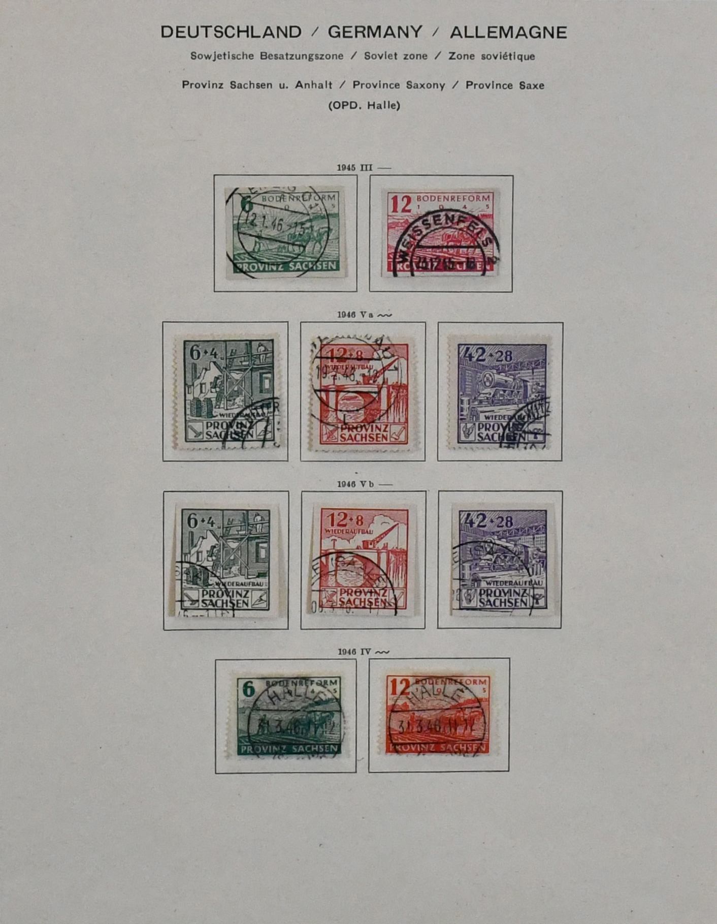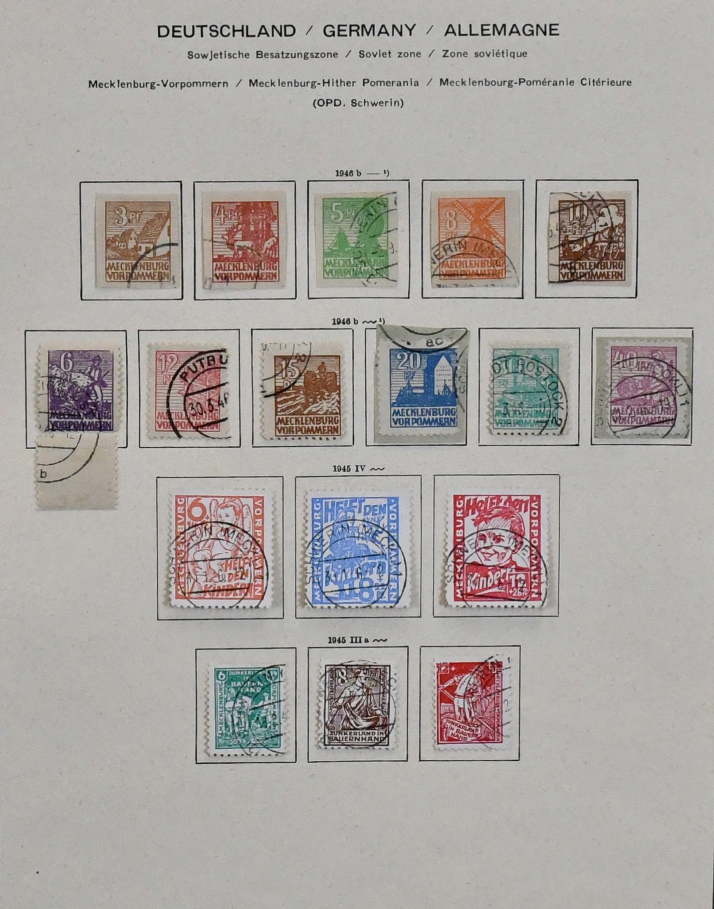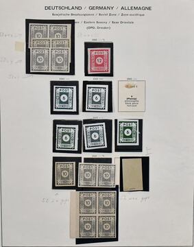 SBZ, Nachlaß-Slg. mit einer Vielzahl von Werten auf etwa 80 Albenblättern und meist Vordrucken. Dabei viele bessere Ausgaben, u.a. Nr. 19x/y postfr., 42/50 mit Postmeistertrennungen, 87/89B gest. (Mi. 180,-), Bl. 3A/B, etwa 100 ungeprüfte Bezirkshandstempel inkl. viermal heller 60 Pfg., Nr. 195 zweimal gest. (300,-) usw. Dazu gestempelte Nr. 150/55X mit ungepr. Stempeln
