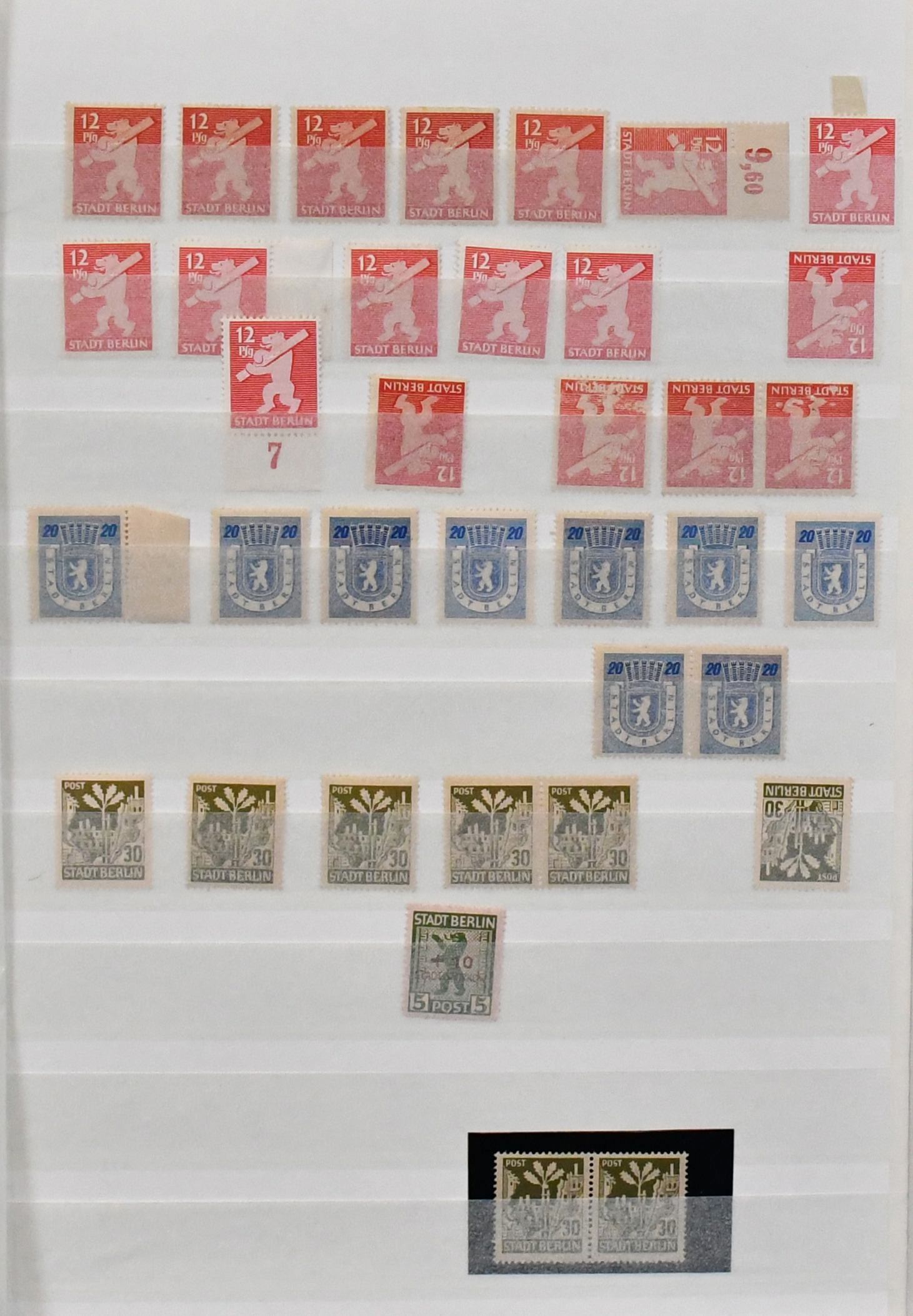 SBZ, 1945/49, postfrische Slg. mit vielen kpl. Sätzen, u.a. Nr. 1/7B (Mi. 180,-), 8/19 inkl. 19x/y, 20/28 inkl. 23/25a/b (Mi. 187,-), 73/84Y, 116/19Y, 124/25X, Bl. 3A/B (115,-), Bezirkshandstempel ohne helle 60 Pfg. (100,-), 182/97, 212/27 usw., im neuwertigen Leuchtturm-Vordruckalbum