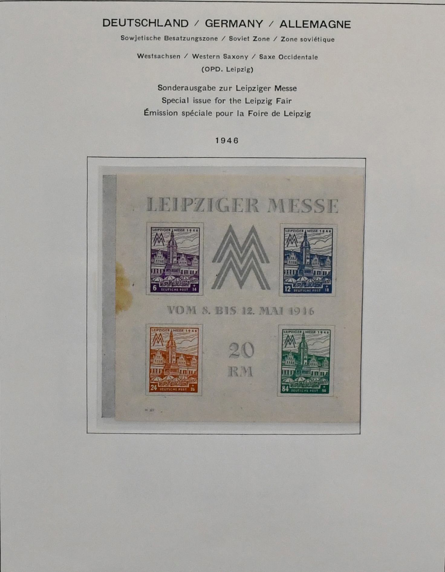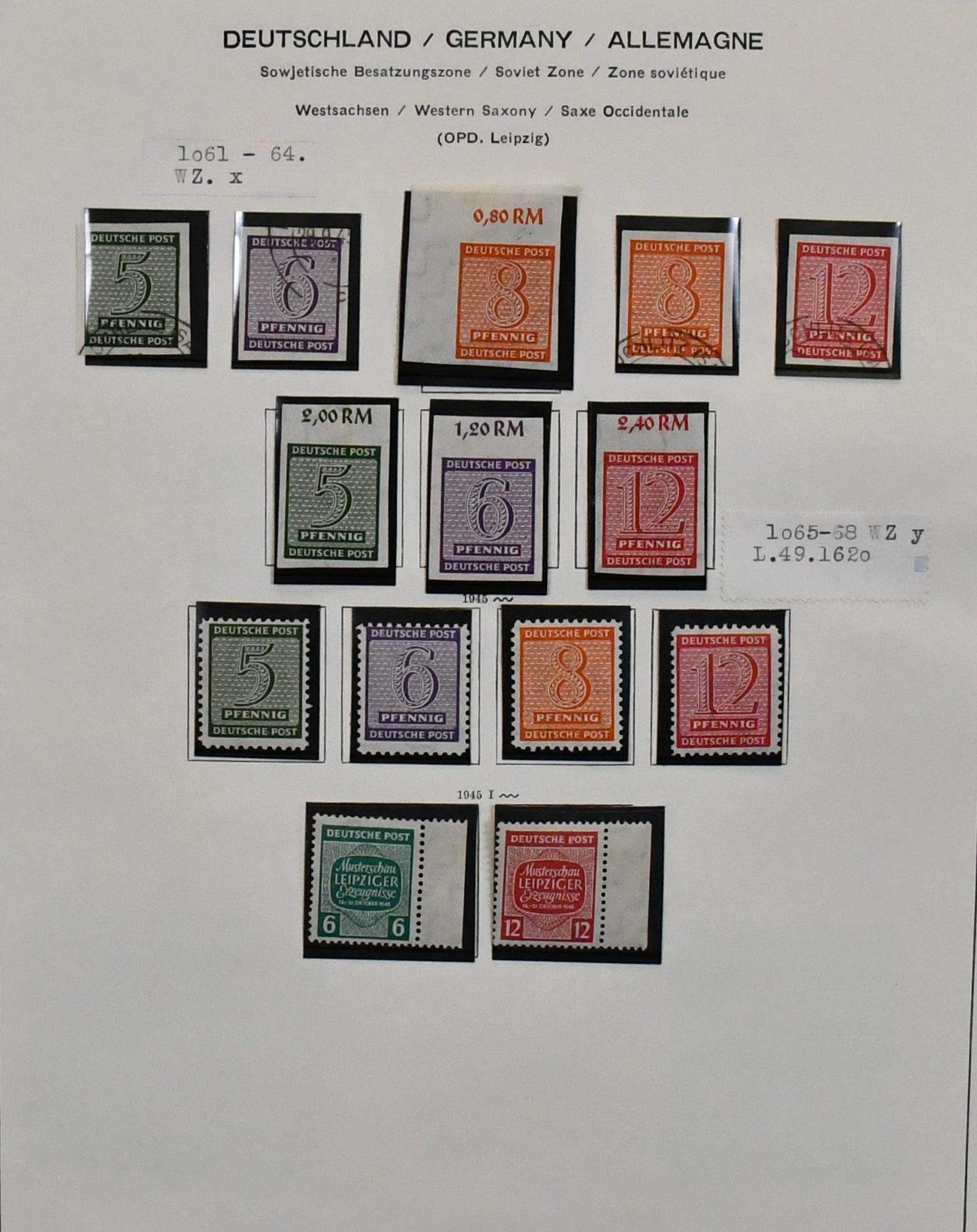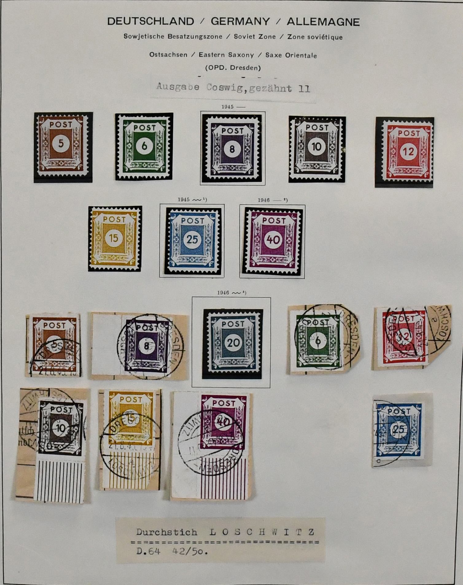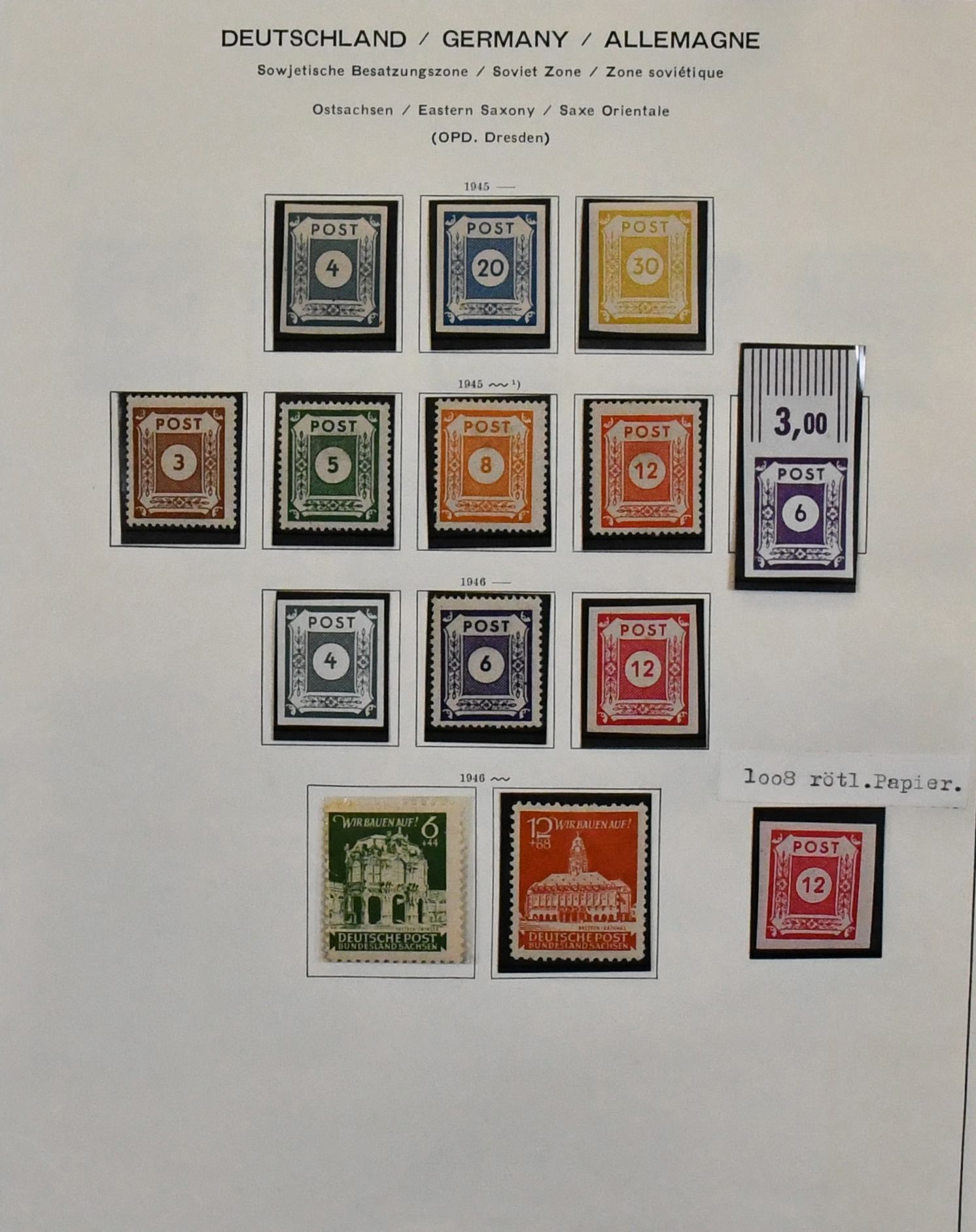 SBZ, 1945/49, postfr./ungebr. Slg. ab Nr. 1/40y, mit Nr. 42/50 mit Postmeistertrennung, Bl. 3A/B postfr., Bezirkshandstempel ohne helle 60 Pfg., Nr. 212/27, Bl. 6 postfr. (Mi. 220,-) usw., auf Leuchtturm-Vordrucken