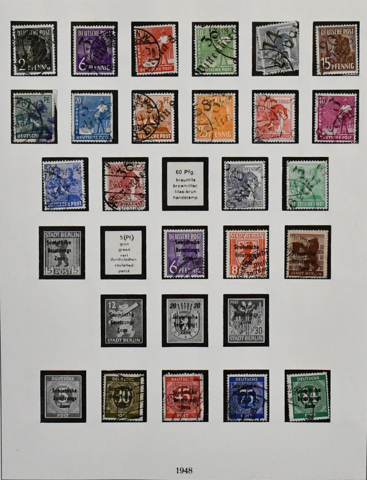 SBZ, 1945/49, gest. Slg. mit u.a. Nr. 20/25 (Mi. 400,-), 42/50, Bl. 3B (220,-), Nr. 112/15, 124/25X/Y, Bezirkshandstempel mit heller 60 Pfg. (ungeprüft) usw., auf Lindner-Vordrucken
