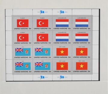 Vereinte Nationen, New York, Flaggen-Kleinbögen, postfr. Slg. mit 32 versch. KLB der 80er Jahre, im neuwertigen Lindner-T-Vordruckalbum mit Schuber. Die enthaltene Nominale beträgt bereits 130,- US-Dollar (= 130,- Euro), Los 9766 der 217. Auktion, alter Ausruf 60,-