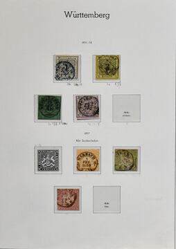 Württemberg, reichhaltige Slg. ab zweimal Nr. 1 auf Vordrucken, mit Nr. 6-9, 20y gest. (Mi. 2500,-), "Eirund" kpl. und auch die Pfennigzeit reichhaltig mit Extras, hoher KW! Los 7395 der 228. Auktion, alter Ausruf 250,-