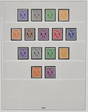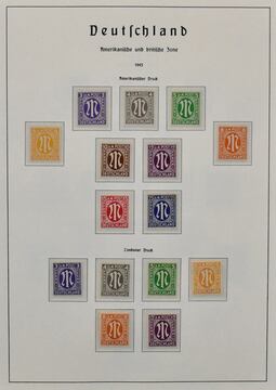 Bizone, 1945/1949, postfr. Slg. ab Nr. 1/35, mit Nr. 36/51I/II inkl. Nr. 49I (Mi. 153,-), Nr. 73/100 eg und wg (Mi. 1030,-), 99II (200,-), 101/10 und Bl. 1 (Mi. 140,-), auf Leuchtturm-Vordrucken, Los 7853 der 219. Auktion, alter Ausruf 250,-