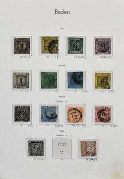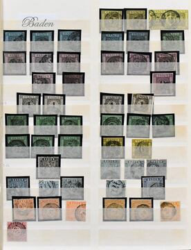 Baden, meist gest. und bis auf Nr. 14 u. 16 überkpl. Slg. auf Leuchtturm-Vordrucken ab Nr. 1-12, inkl. Nr. 3a/b, dabei zusätzlich Paar Nr. 9 mit Uhrrad "1", 15a/b, Nr. 21a gest. etc., Landpost ungebr. usw., Los 7182 der 228. Auktion, alter Ausruf 200,-