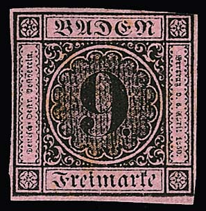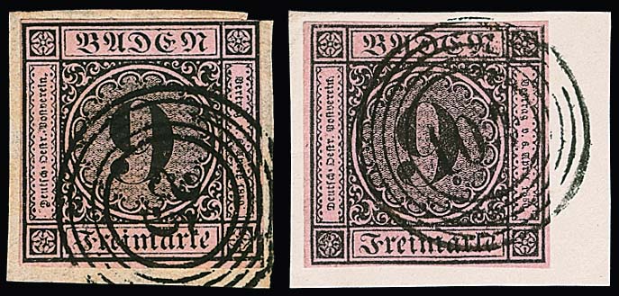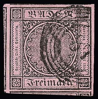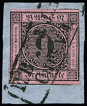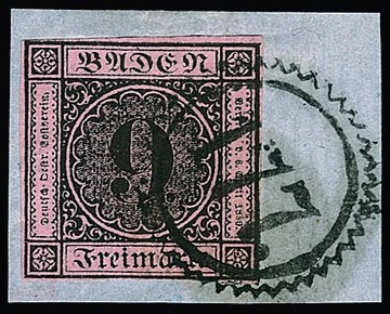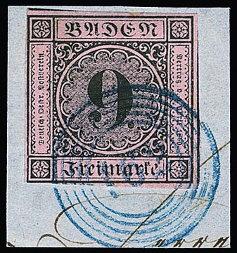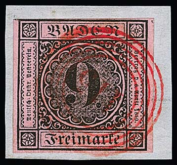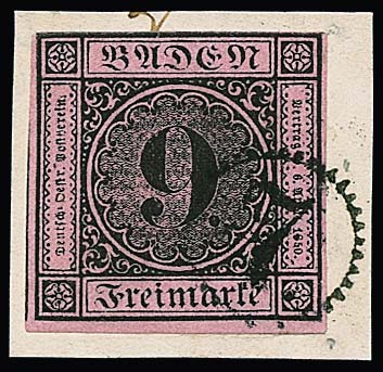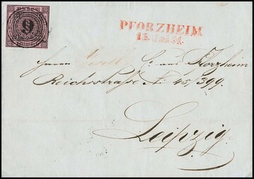 9 Kr. schw./altrosa, meist vollrandig, auf Brief von Pforzheim (roter Neben-L2 vom 15. Mai 1851) nach Leipzig. Name des Adressaten abgeschwächt, früher Brief aus dem 1. Monat! Attest Stegmüller