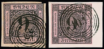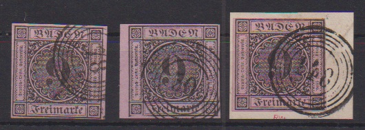 9 Kr. schw./altrosa (Briefstück, sign. Seeger), sowie auf rosa, gesamt fünf ausgesuchte Kabinettstücke