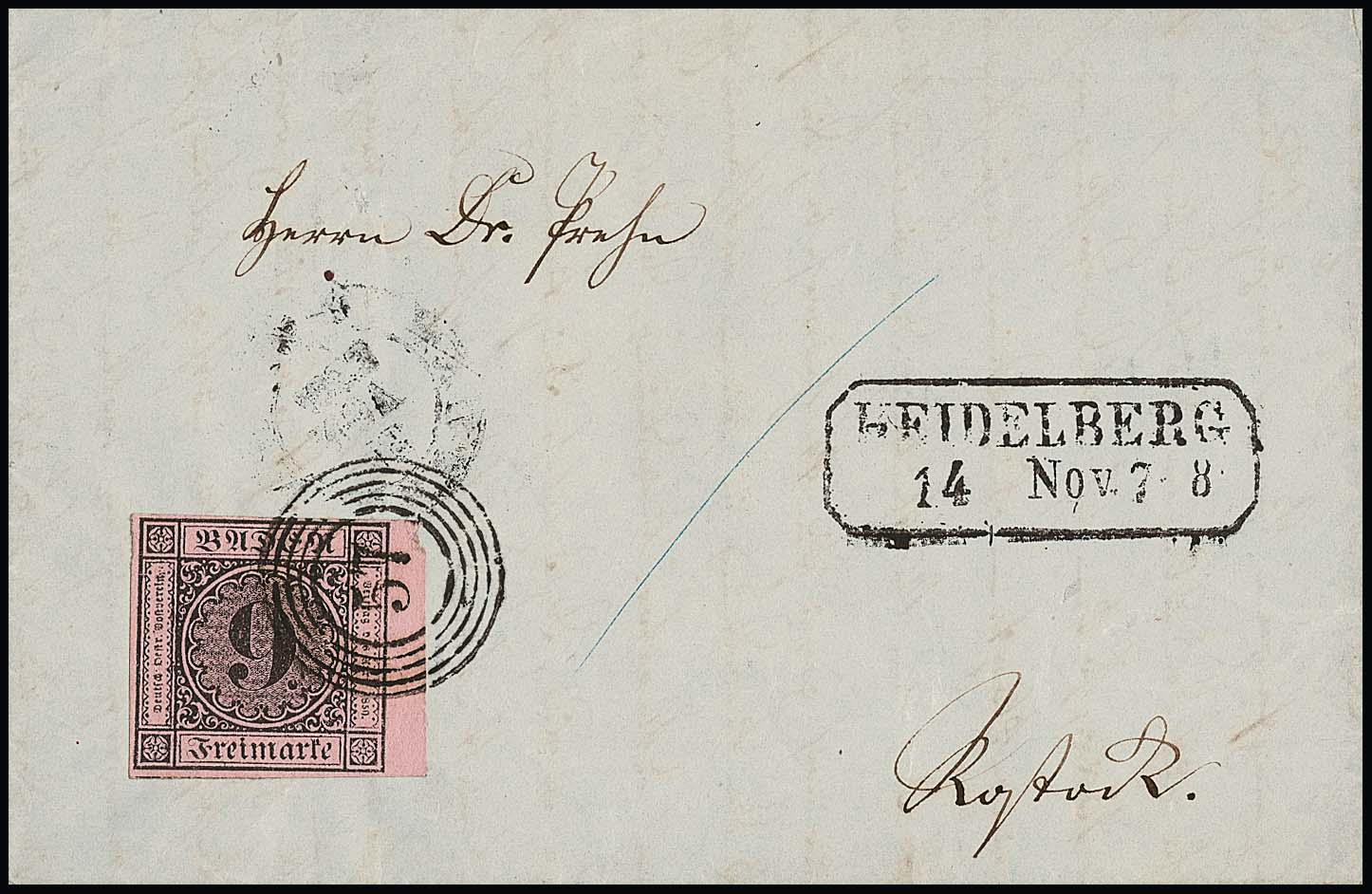 9 Kr. schw./rosa, allseits voll- bis breitrandig, mit breitem rechtem Bogenrand, auf Kabinettbrief von Heidelberg 1853 nach Rostock