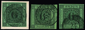 6 Kr. schw./gelblichgrün, sechs ausgesuchte, gut geschnittene Kabinett-/Luxusstücke, teils vom Rand