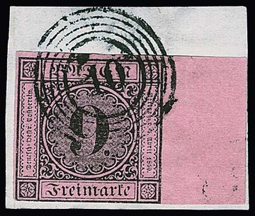 9 Kr. schw./rosa, enormer Schnittriese, rechts vom Bogenrand, sonst mit Teilen aller anderen Nebenmarken!
