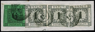 6 Kr. schw./gelbgrün in Mischfrankatur mit dreimal 1 Kr. schwarz (zwei Werte Schnittfehler) auf Briefstück mit NS "57", wahrscheinlich einmalige Kombination
